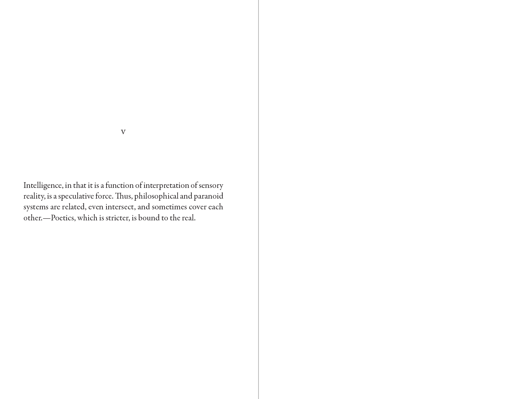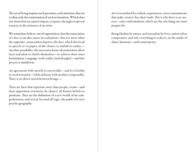 The body, in order to assimilate the immense (and immensely violent) amount of information it receives, engages in a work of translation of which dreams and art are the privileged figures. More than the expression of impressions, which is still a physical phenomenon, what is at stake is to decode the encrypted messages of reality, then formulate them in a target language that, through its materiality, has the power to heal the subject's psyche. (in Mode)