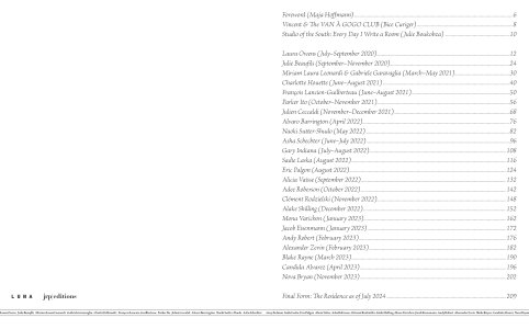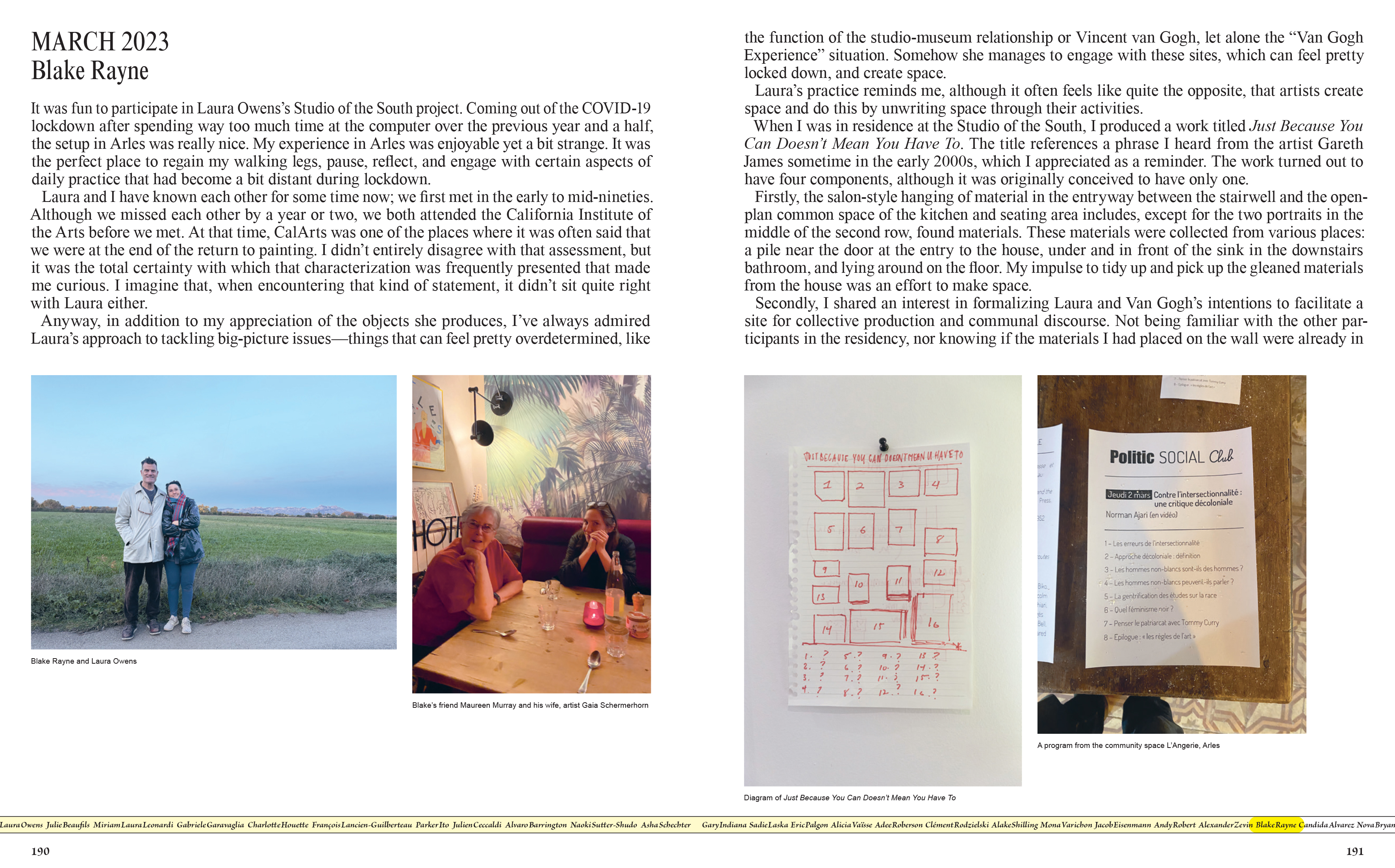 Conceived by American artist Laura Owens in collaboration with Vassilis Oikonomopoulos (LUMA Arles Artistic Director), Julie Boukobza (Head of LUMA Arles Residency Program), editor Asha Schechter, and graphic designer Tiffany Malakooti, this publication looks back on the Studio of the South residency, hosted in Arles by LUMA and Owens and undertaken by 23 international artists between September 2020 and July 2023.
