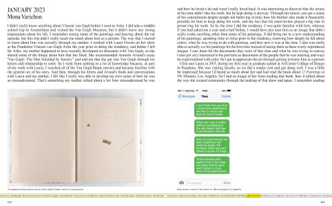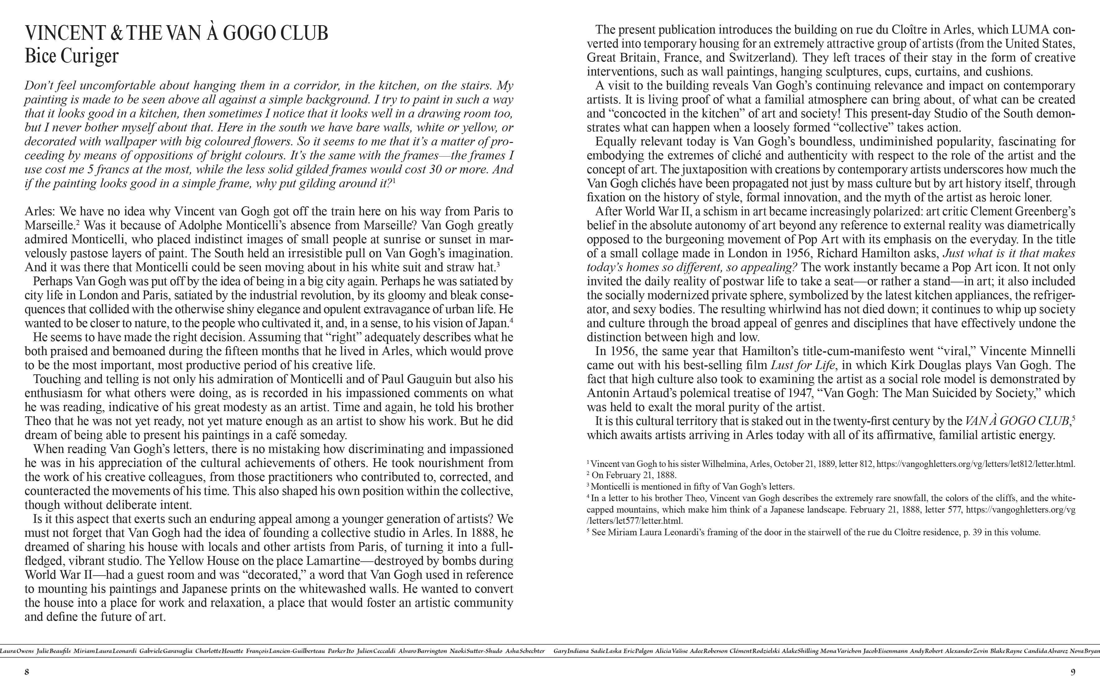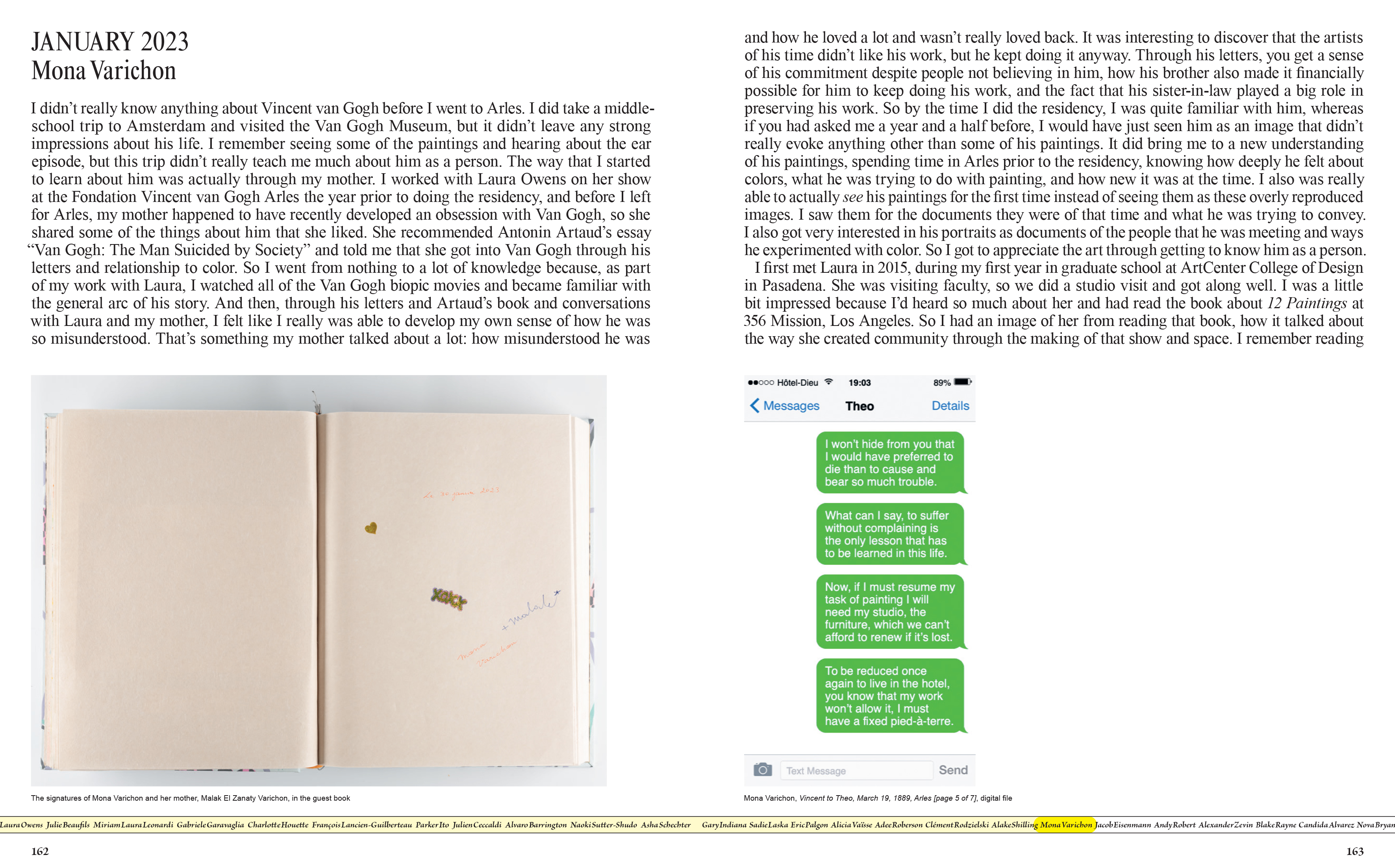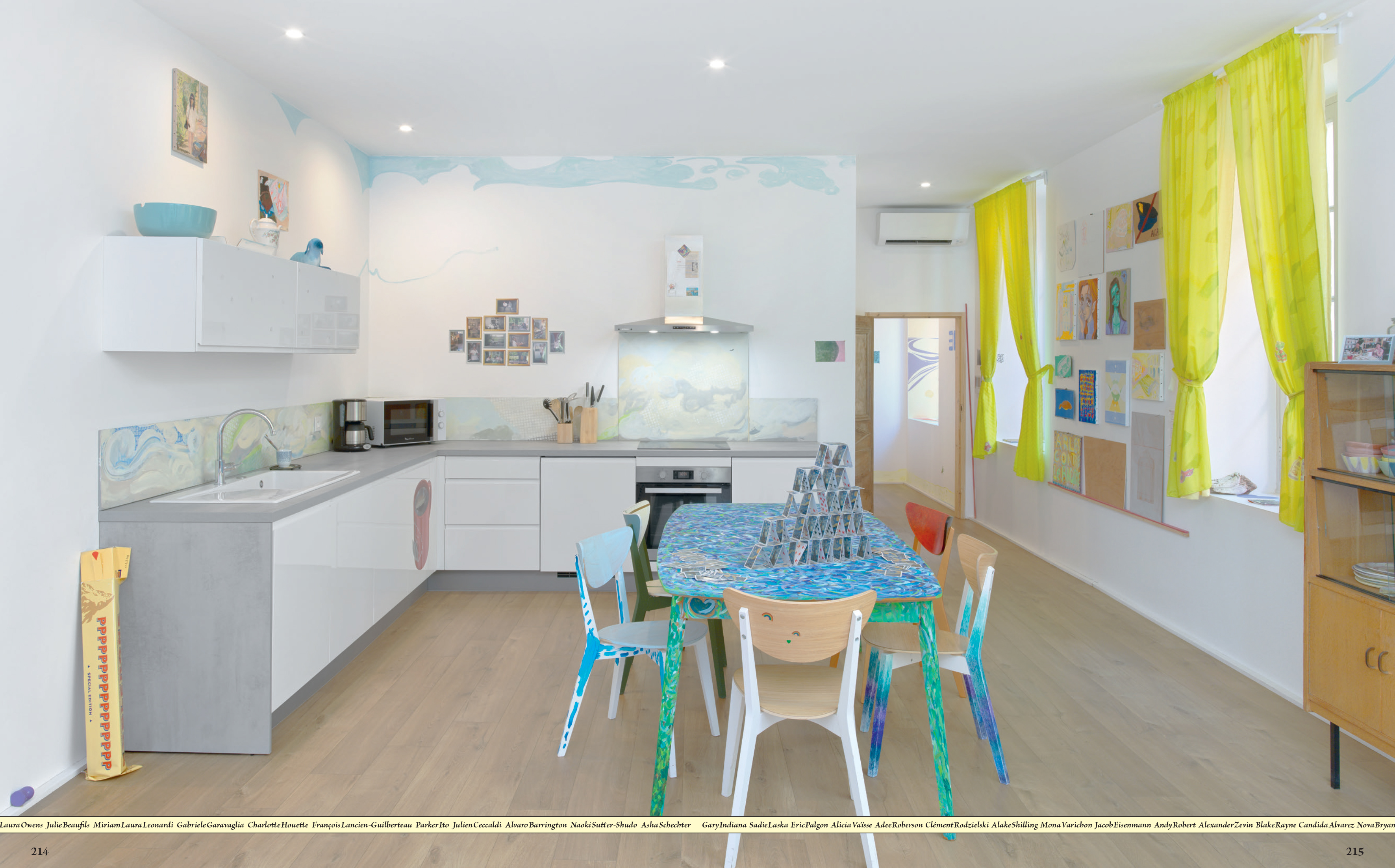 Introduced by Laura Owens, the book features contributions by Bice Curiger, Maja Hoffmann, and Julie Boukobza, as well as testimonials by the 23 artists in residency—all collaborators, friends, and pupils of Owens. The visual documentation includes images of in situ artworks, a comprehensive photo-reportage of the house as if the reader were following a special guided tour, facsimilies from the guestbook, and residency ephemera.