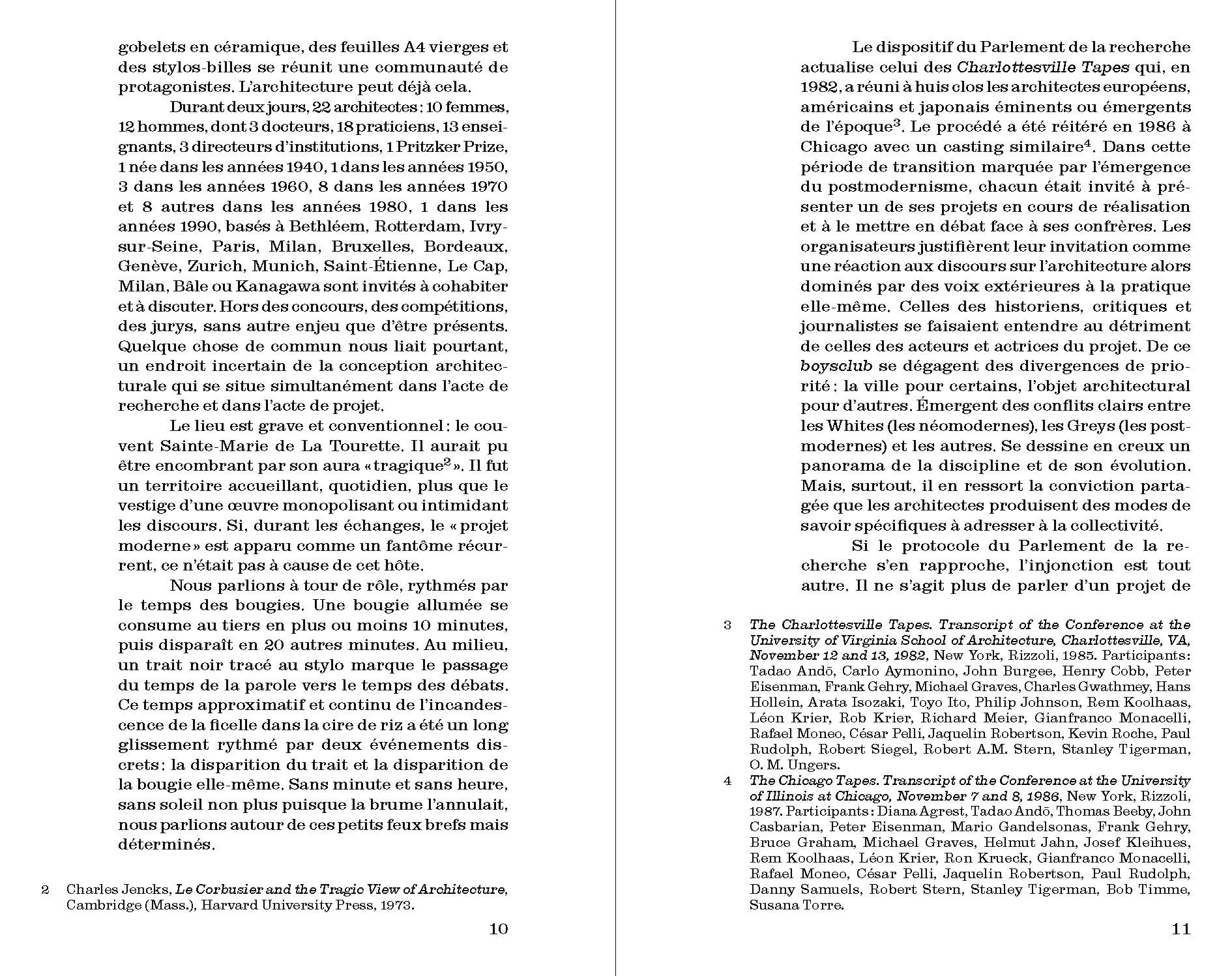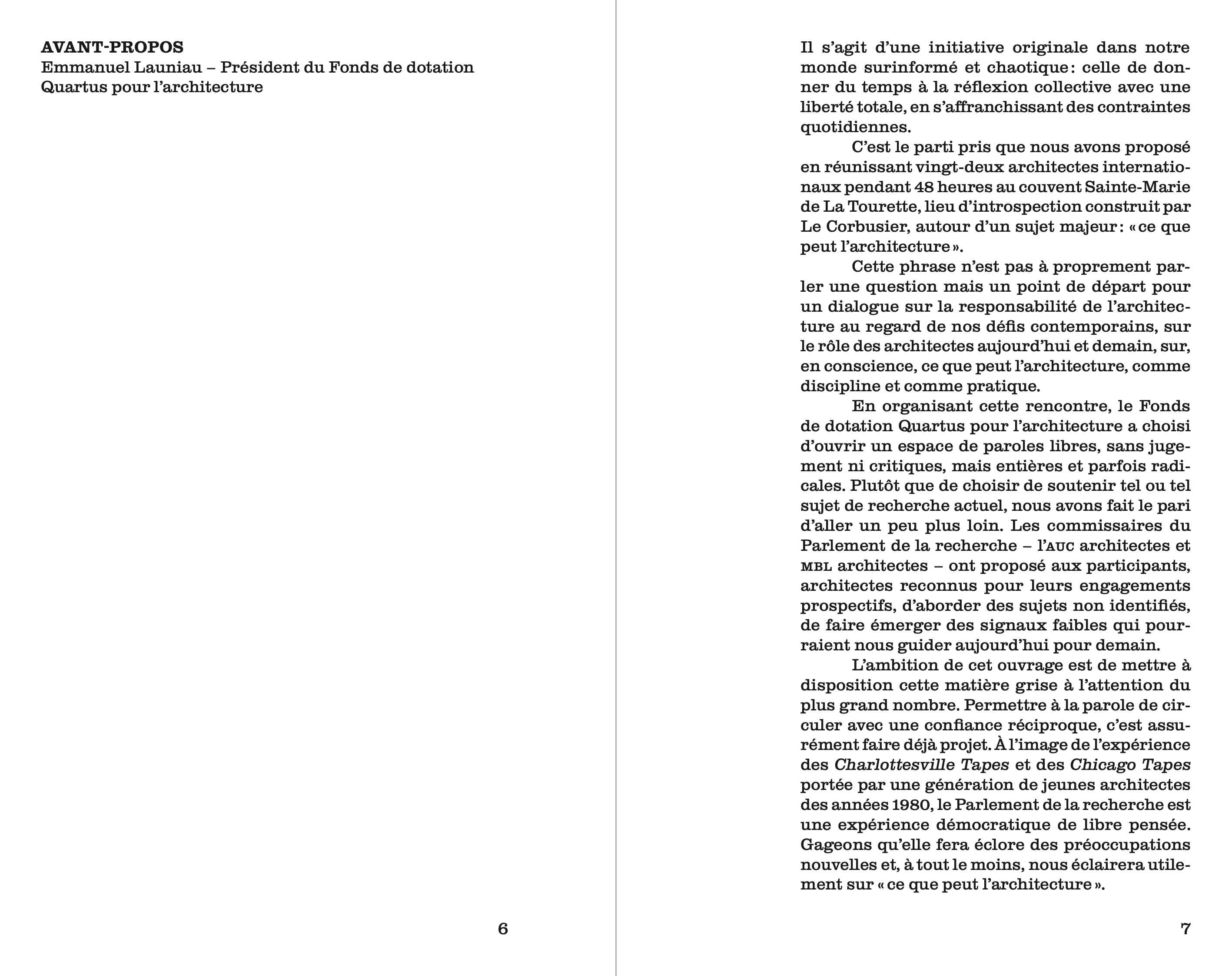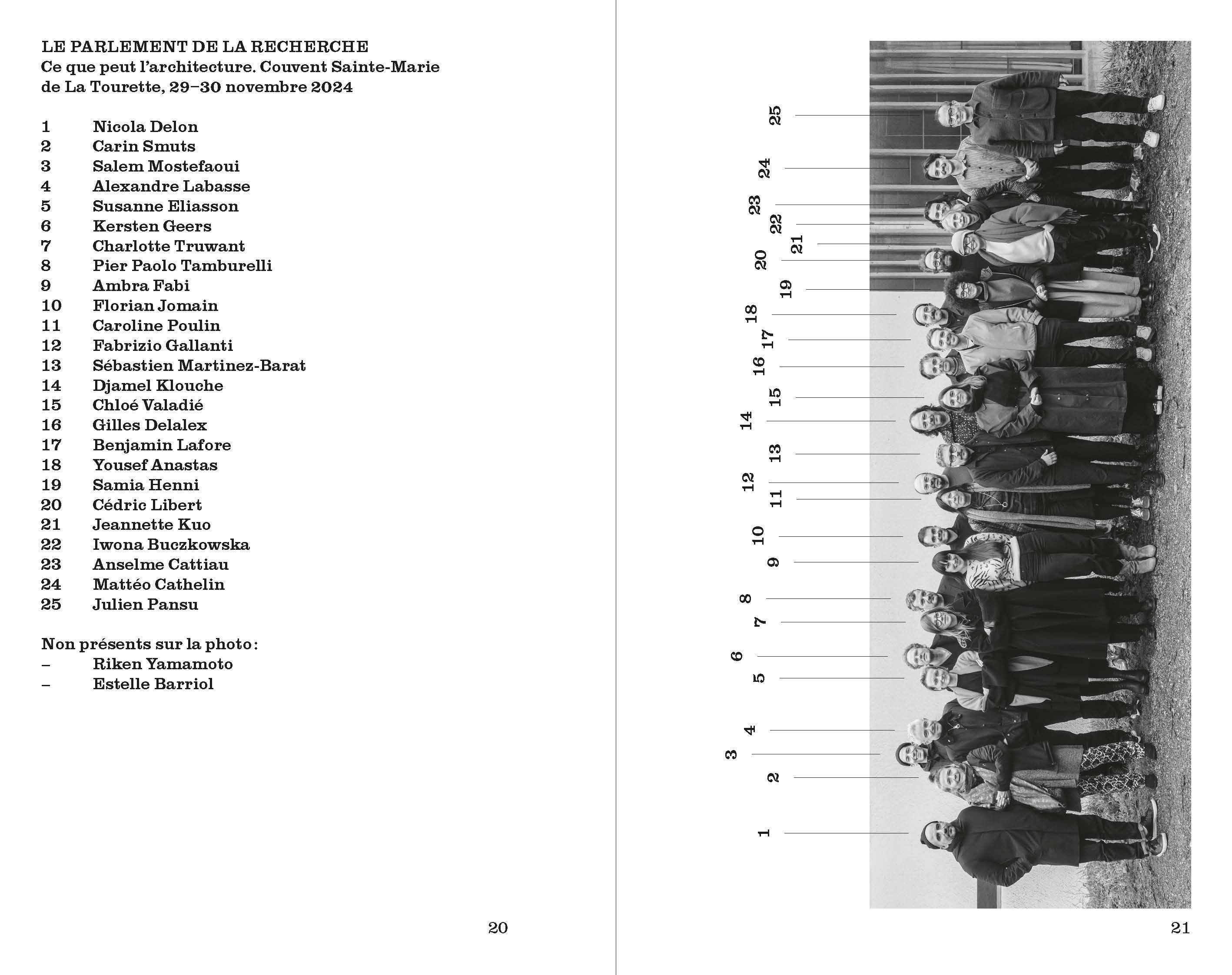 The Parlement de la recherche brought together 22 international architects and architectural researchers in a staged 48 hour closed-door retreat at the couvent Sainte-Marie de La Tourette, a mist-shrouded, timeless refuge away from urgency. Initiated by the Fonds de dotation Quartus pour l'architecture, in partnership with the Ministry of Culture and led by the curatorial duo L'AUC and MBL architectes, le Parlement de la recherche offered an unprecedented moment of reflection, exploration, and collective effervescence to probe the major issues facing our society and to question what architecture can do.