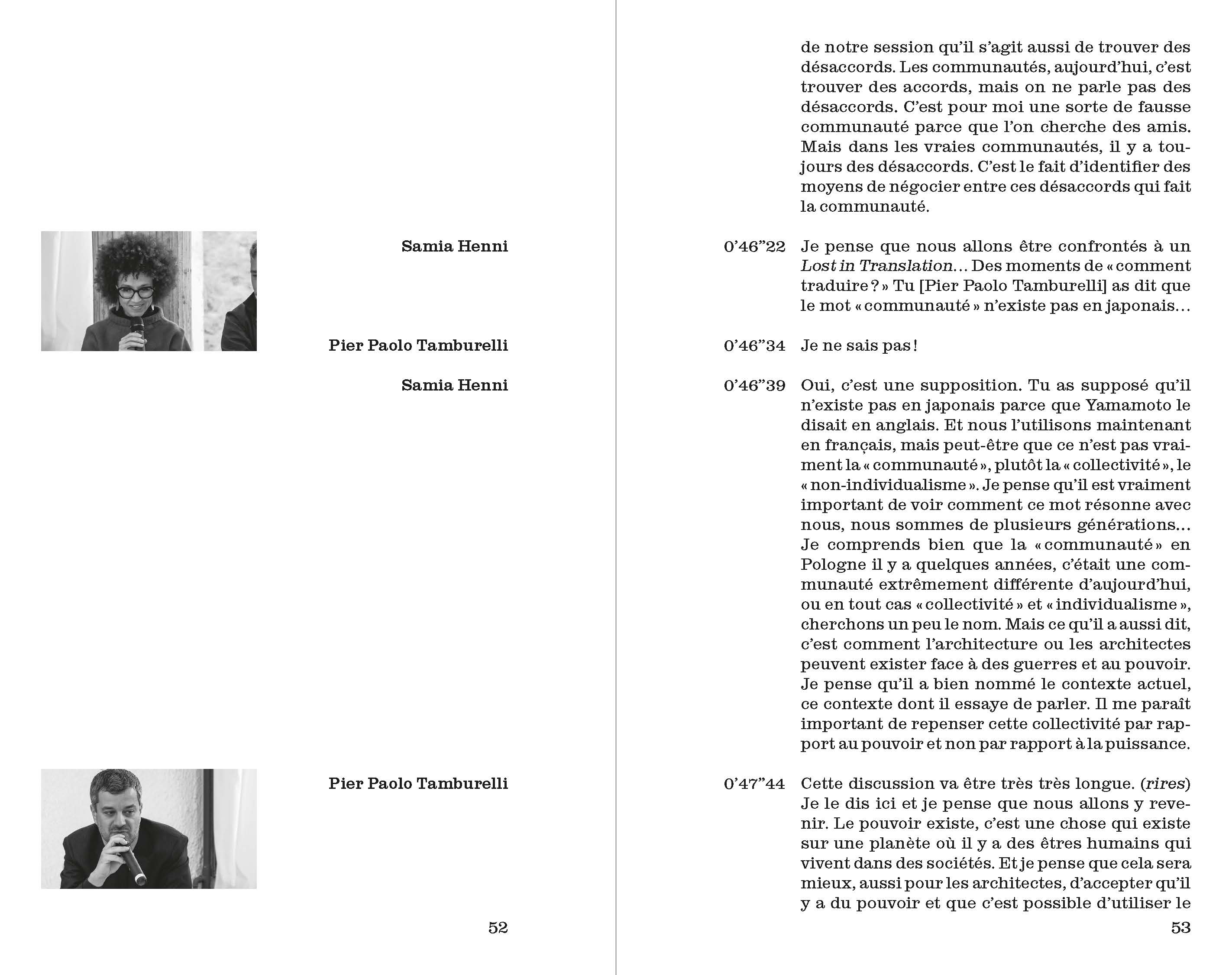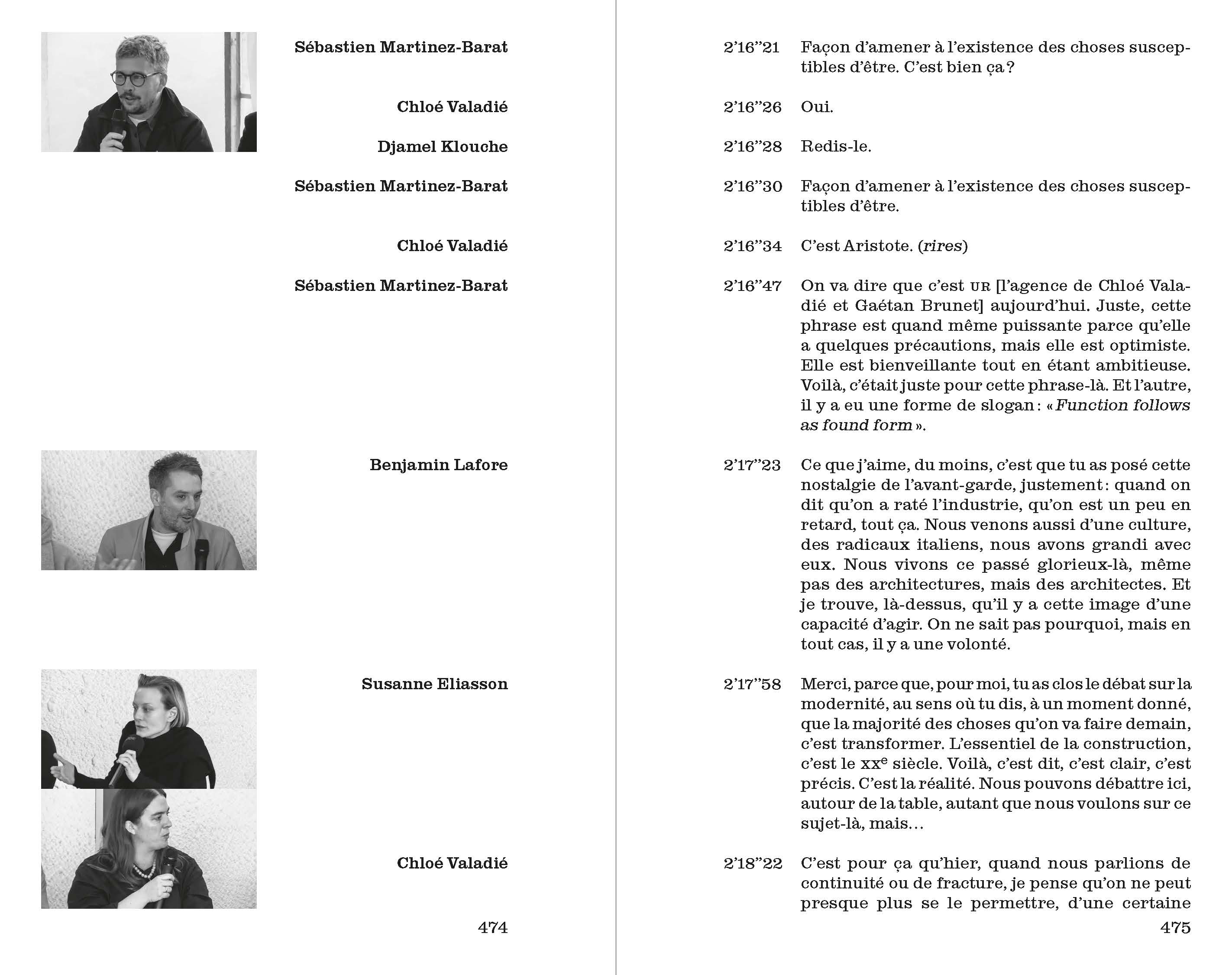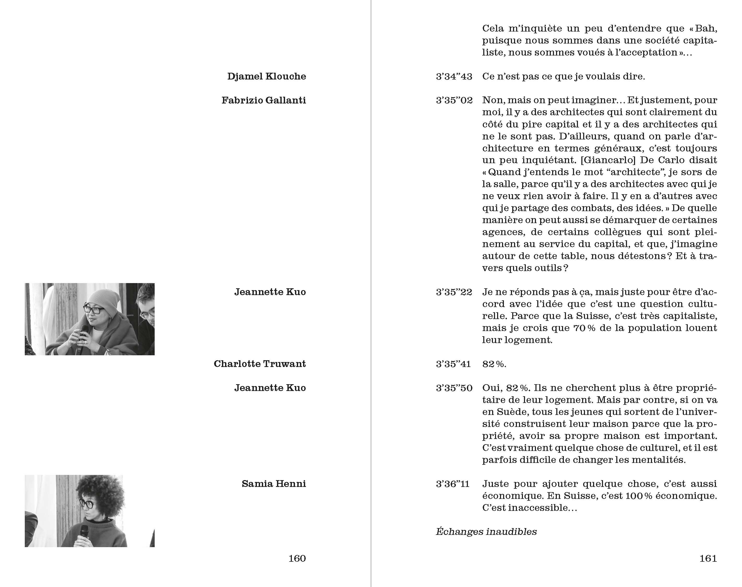 Contributions by Yousef Anastas (AAU Anastas), Estelle Barriol (Studio ACTE), Iwona Buczkowska, Gilles Delalex (Studio Muoto), Nicola Delon (Encore Heureux), Susanne Eliasson (GRAU), Ambra Fabi (Piovenefabi), Fabrizio Gallanti (arc en rêve), Kersten Geers (OFFICE Kersten Geers David Van Severen), Samia Henni, Djamel Klouche (l'AUC), Jeannette Kuo (Karamuk Kuo), Alexandre Labasse (Apur), Benjamin Lafore (MBL), Cédric Libert (ENSASE), Sébastien Martinez-Barat (MBL), Caroline Poulin (l'AUC), Carin Smuts (CS Studio), Pier Paolo Tamburelli (Baukuh), Charlotte Truwant (Truwant + Rodet +), Chloé Valadié (UR), Riken Yamamoto.