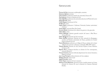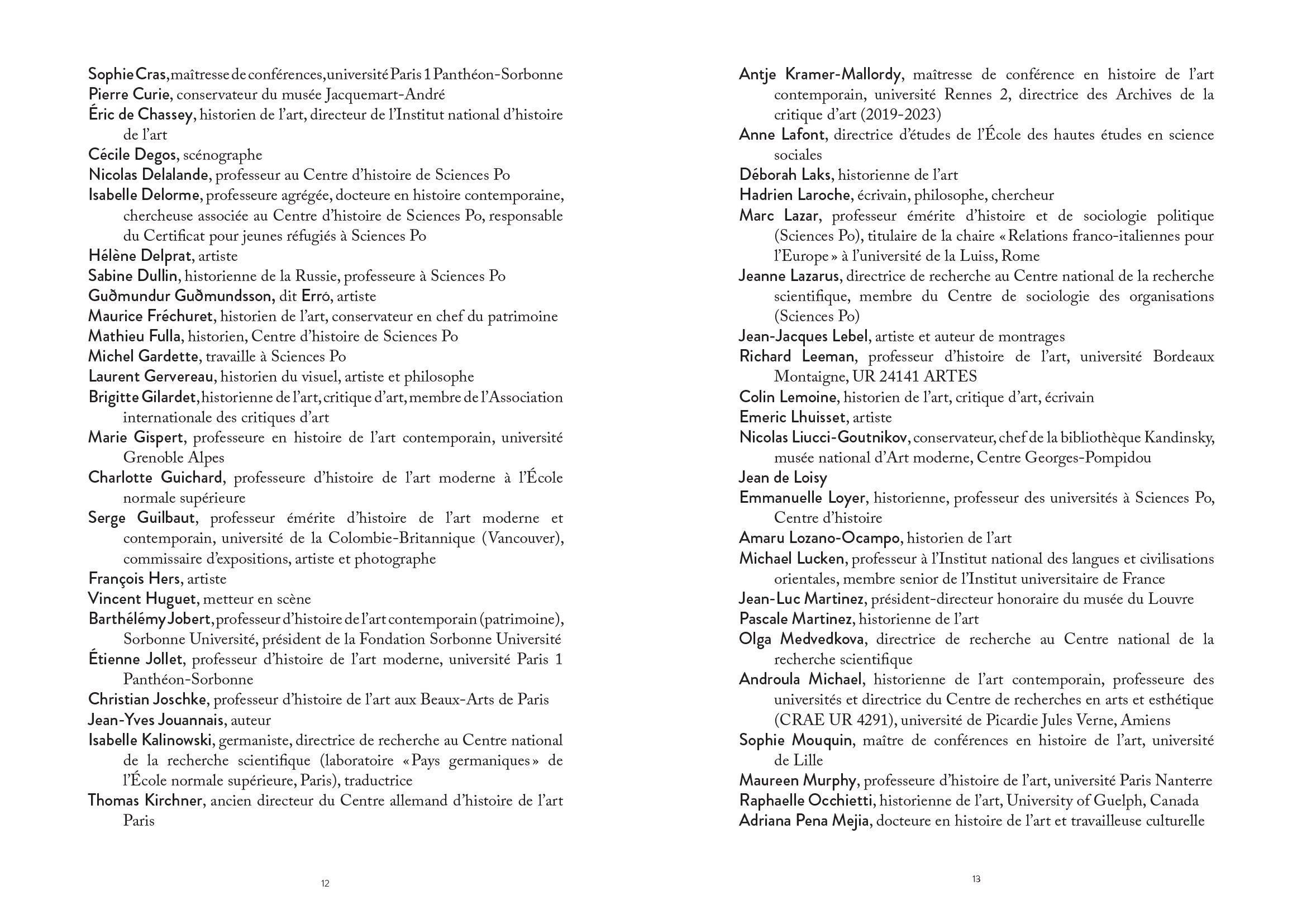 Contributions by Thomas Aït Kaci, Marianne Alphant, Claire Andrieu, Paul Ardenne, Claire Barbillon, Miquel Barceló, Cécile Bargues, Nú Barreto, Sophie Basch, Jérôme Bazin, Annette Becker, Valérie Belin, Sylvain Bellenger, Olivier Berggruen, Olivier Bonfait, Patrick Boucheron, Thibault Boulvain, Baptiste Brun, Vincent Casanova, Jean-Loup Champion, Philippe Chancel, Miguel Chevalier, Victor Claass, Maximin Cousy Barbereau, Sophie Cras, Pierre Curie, Éric de Chassey, Cécile Degos, Nicolas Delalande, Isabelle Delorme, Hélène Delprat, Sabine Dullin, Erró, Maurice Fréchuret, Mathieu Fulla, Michel Gardette, Laurent Gervereau, Brigitte Gilardet, Marie Gispert, Charlotte Guichard, Serge Guilbaut, François Hers, Vincent Huguet, Barthélémy Jobert, Étienne Jollet, Christian Joschke, Jean-Yves Jouannais, Isabelle Kalinowski, Thomas Kirchner, Antje Kramer-Mallordy, Anne Lafont, Déborah Laks, Hadrien Laroche, Marc Lazar, Jeanne Lazarus, Jean-Jacques Lebel, Richard Leeman, Colin Lemoine, Emeric Lhuisset, Nicolas Liucci-Goutnikov, Jean de Loisy, Emmanuelle Loyer, Amaru Lozano-Ocampo, Michael Lucken, Jean-Luc Martinez, Pascale Martinez, Olga Medvedkova, Androula Michael, Sophie Mouquin, Maureen Murphy, Raphaelle Occhietti, Adriana Pena Mejia, Chang Ming Peng, Emmanuel Pernoud, Michelle Perrot, Lucia Piccioni, Cécile Pichon-Bonin, Guillaume Piketty, Emmanuelle Polack, Christophe Prochasson, Jean-Pierre Raynaud, Roland Recht, Nathan Réra, Camille Richert, Sophie Ristelhueber, Paul-André Rosental, Marie-Karine Schaub, Thomas Schlesser, Alain Schnapp, Philippe Sénéchal, Daniel Sherman, Nicolas Surlapierre, Claire Tabouret, Alice Thomine-Berrada, Barthélémy Toguo, Évelyne Toussaint, Patrick Tresset, Victor Vanoosten, Pierre Wat, Elvan Zabunyan, Giovanna Zapperi.