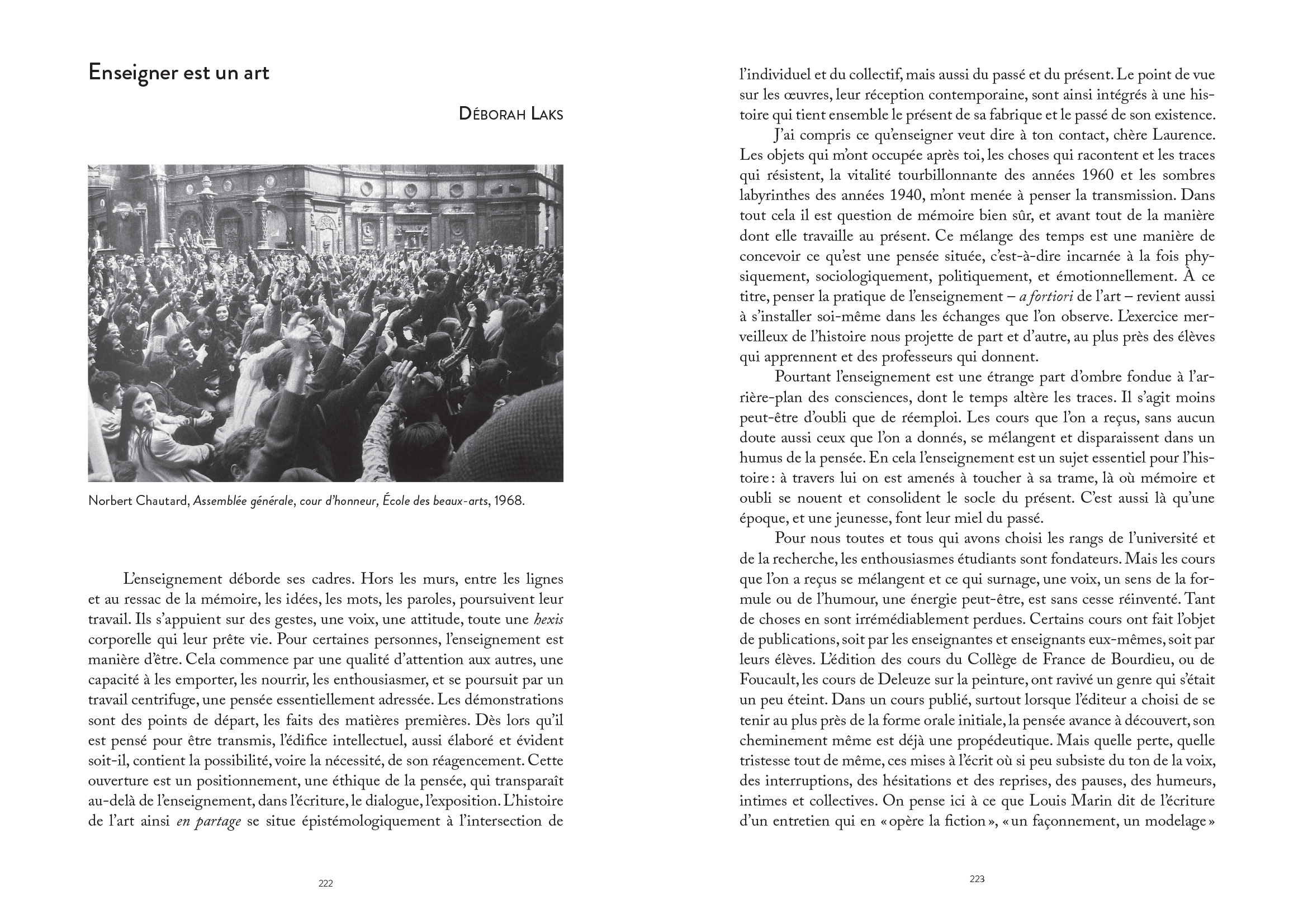 This tribute book, a collective volume edited by Thibault Boulvain and Déborah Laks, brings together one hundred and one voices from very diverse backgrounds (historians, artists, writers, philosophers, curators, professors, students, close friends and fellow travelers) to draw, through an inventory of friendship, a multidimensional portrait of Laurence Bertrand Dorléac, and bear witness to the community of intellectual friendship that she was able to create.