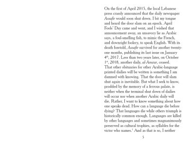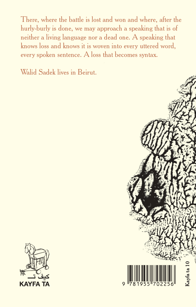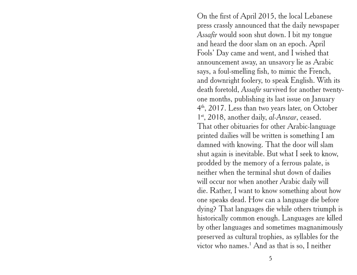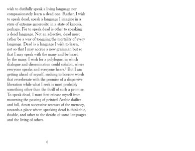 "There, where the battle is lost and won and where, after the hurly-burly is done, we may approach a speaking that is of neither a living language nor a dead one. A speaking that knows loss and knows it is woven into every uttered word, every spoken sentence. A loss that becomes syntax."
