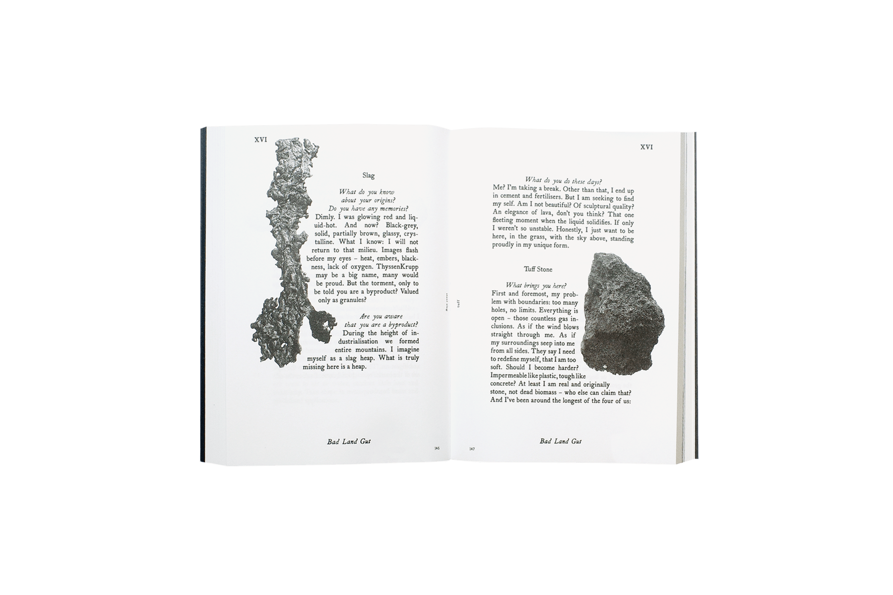 Attitudes of Stone begins with an image sequence of Philipp Modersohn's objects, which seem to morph into one another. These 16 protagonists stand in for materials and processes: furniture, anthropomorphism, metamorphosis, pressure, topiary, peat, photosynthesis, adaptation, infrastructures, heaps, sediments, glass, heat, concrete, vibrancy, phase transition. Subsequently, these constellations unfold in poetic and theoretical contributions by authors from a variety of fields, along with pseudoscientific diagrams and documentation of the site-specific installations. A horizontal dialogue can begin: between the different sections as well as with the contributors, humans, things, and processes alike. Meanwhile, the ink on the page fluctuates as if the printing press itself is breathing.