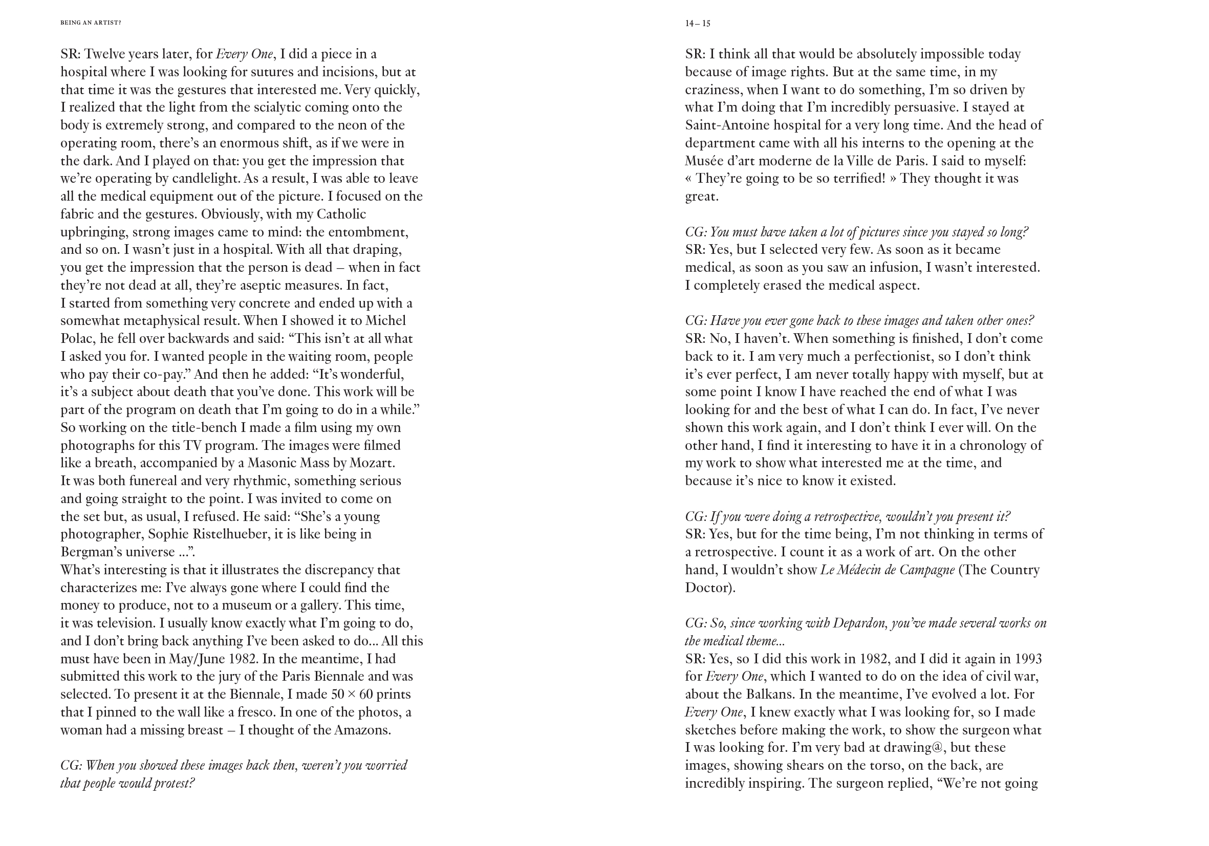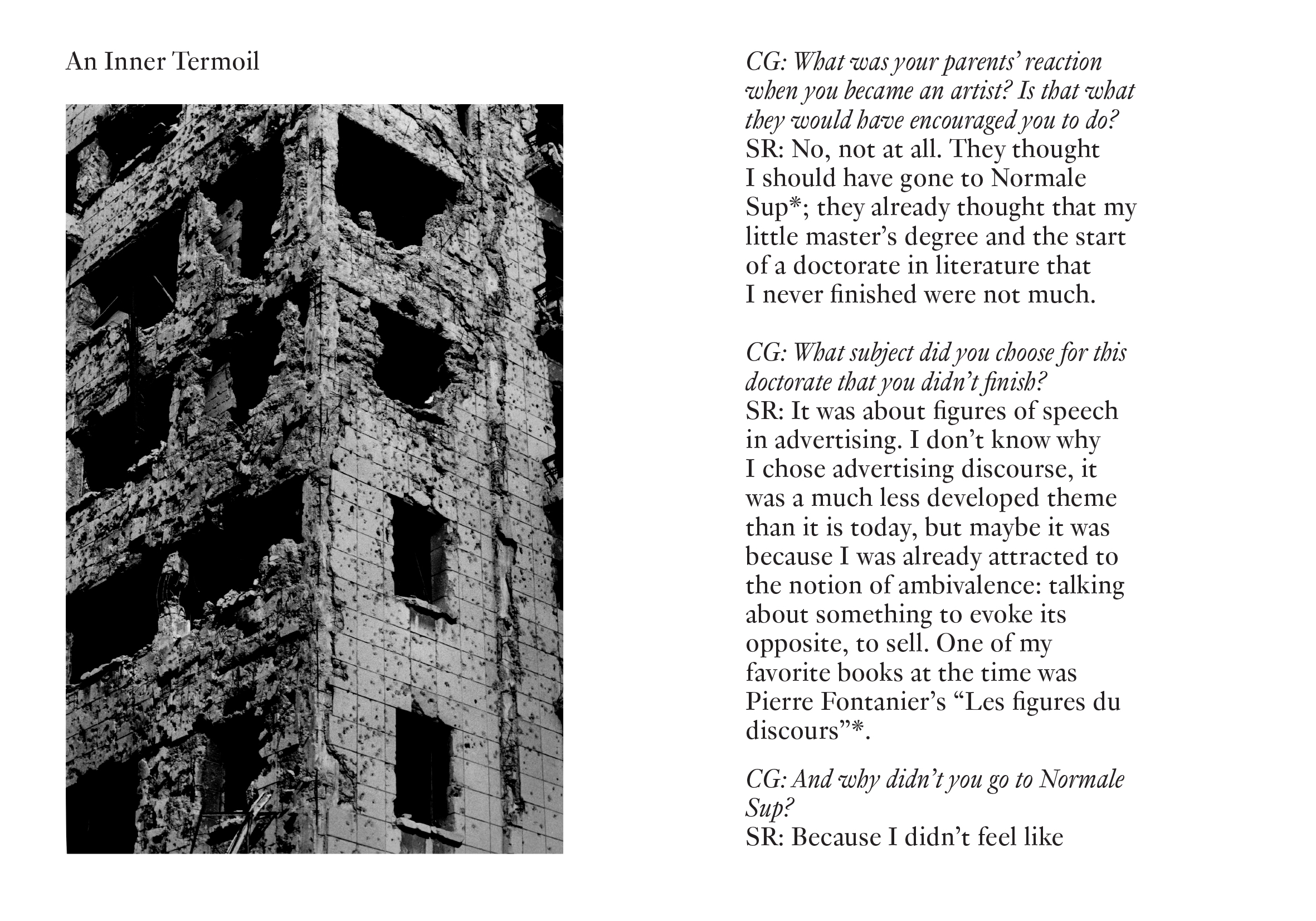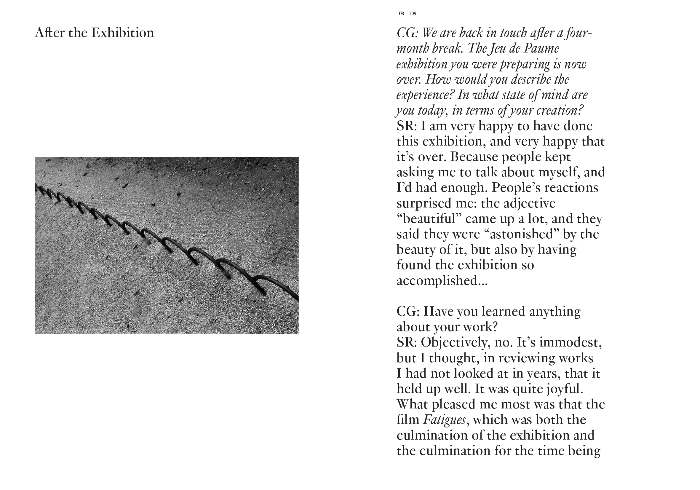 Why do we become artists? And how? To what extent are we artists? Prompted by Catherine Grenier's direct questions, Sophie Ristelhueber retraces the atypical journey of an artist who was never destined for this late, yet fulfilled destiny. Clear-eyed and sincere, her testimony offers a compelling introduction to contemporary art, its aims and its stakes. She evokes the drive of an "inner necessity" that leads her into war-torn landscapes, keeping pace with conflicts and wounds, in search of traces and scars.