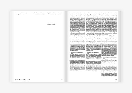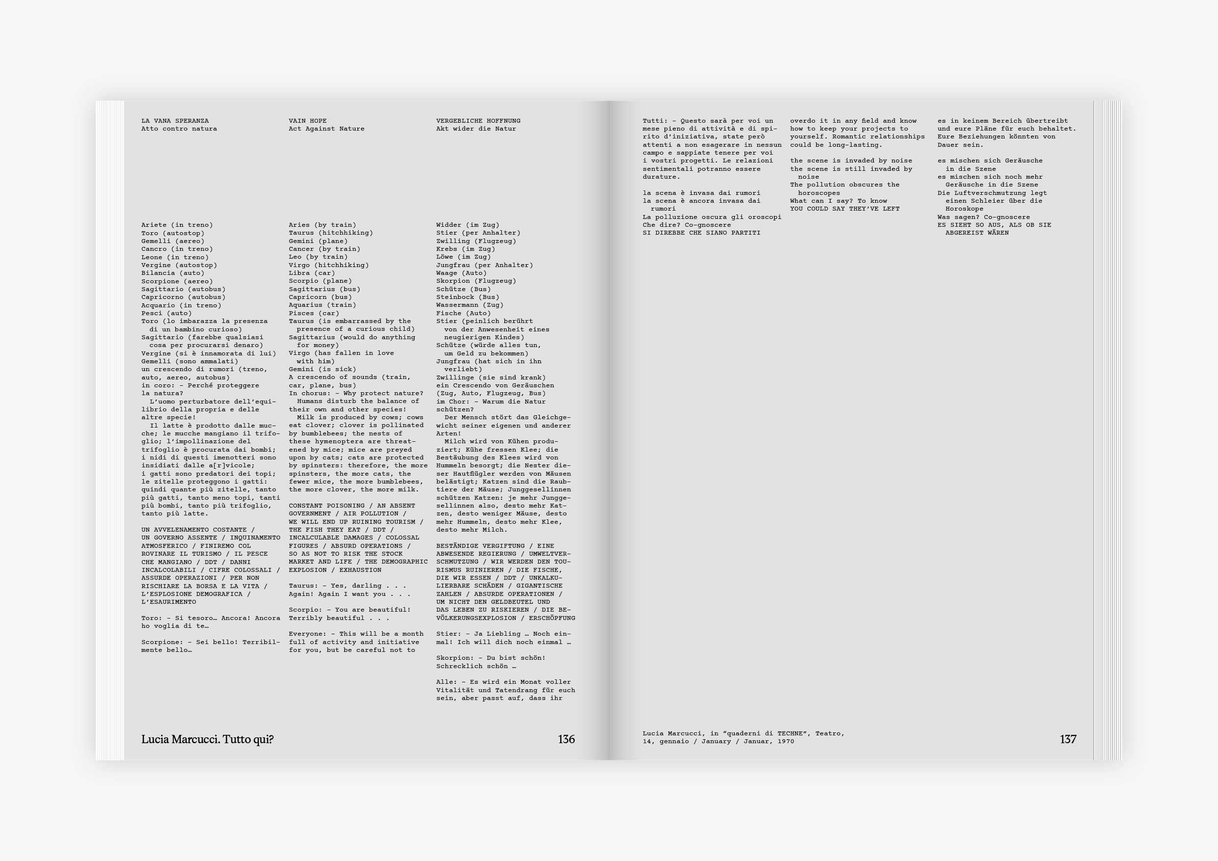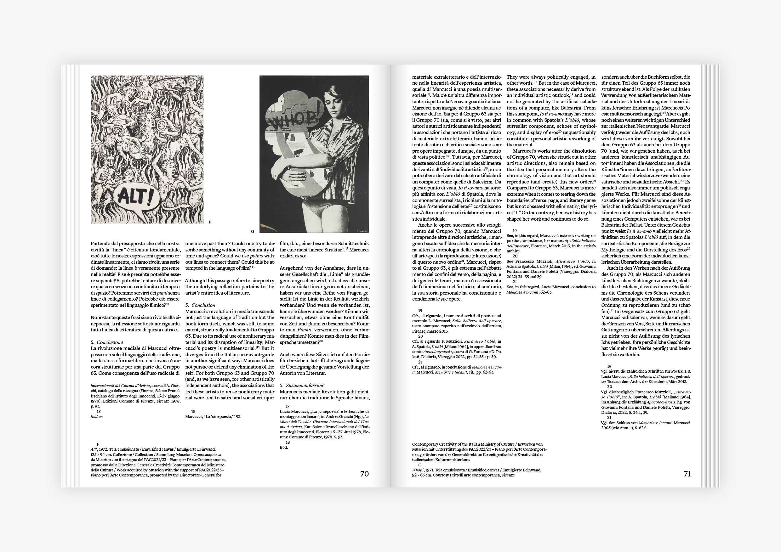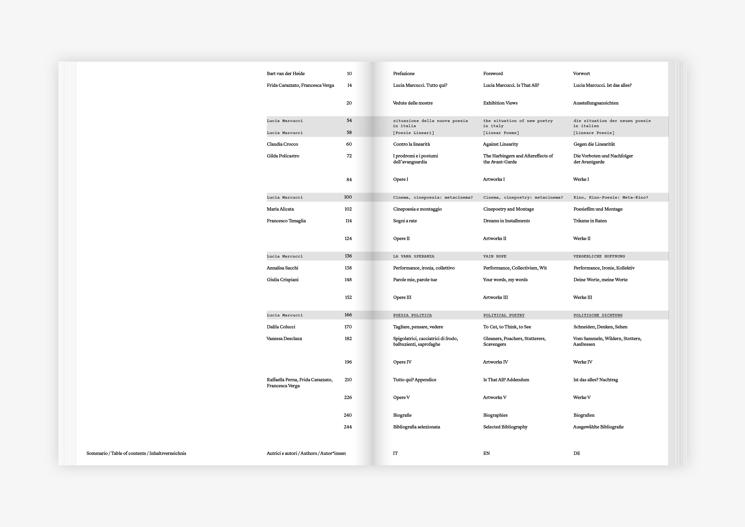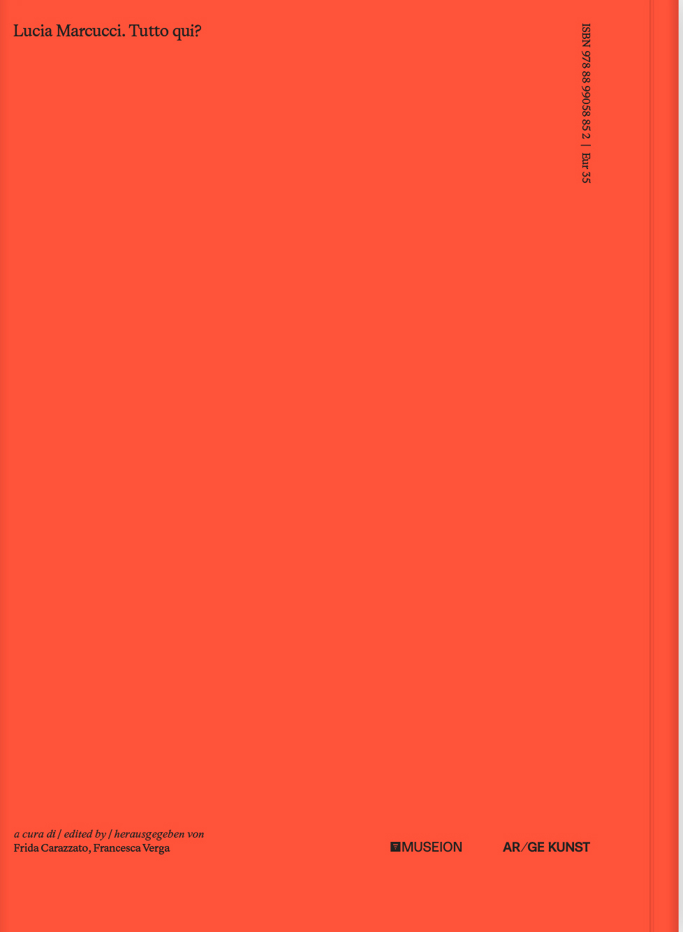 Lucia Marcucci. Tutto qui? is a monograph that originates from the two exhibitions held at Ar/Ge Kunst and Museion (Bolzano). The volume offers a critical exploration of Marcucci's artistic practice through contributions by curators and art historians. Published in three languages, the book features images of previously unseen works, the result of extensive archival re- search, and presents unpublished materials by the artist her- self, including texts and poems interspersed throughout the reading. In addition to texts by curators Frida Carazzato and Francesca Verga, the publication includes essays by Claudia Crocco, Gilda Policastro, Francesco Tenaglia, Maria Alicata, Annalisa Sacchi, Giulia Crispiani, Dalila Colucci, Vanessa Desclaux and Raffaella Perna.