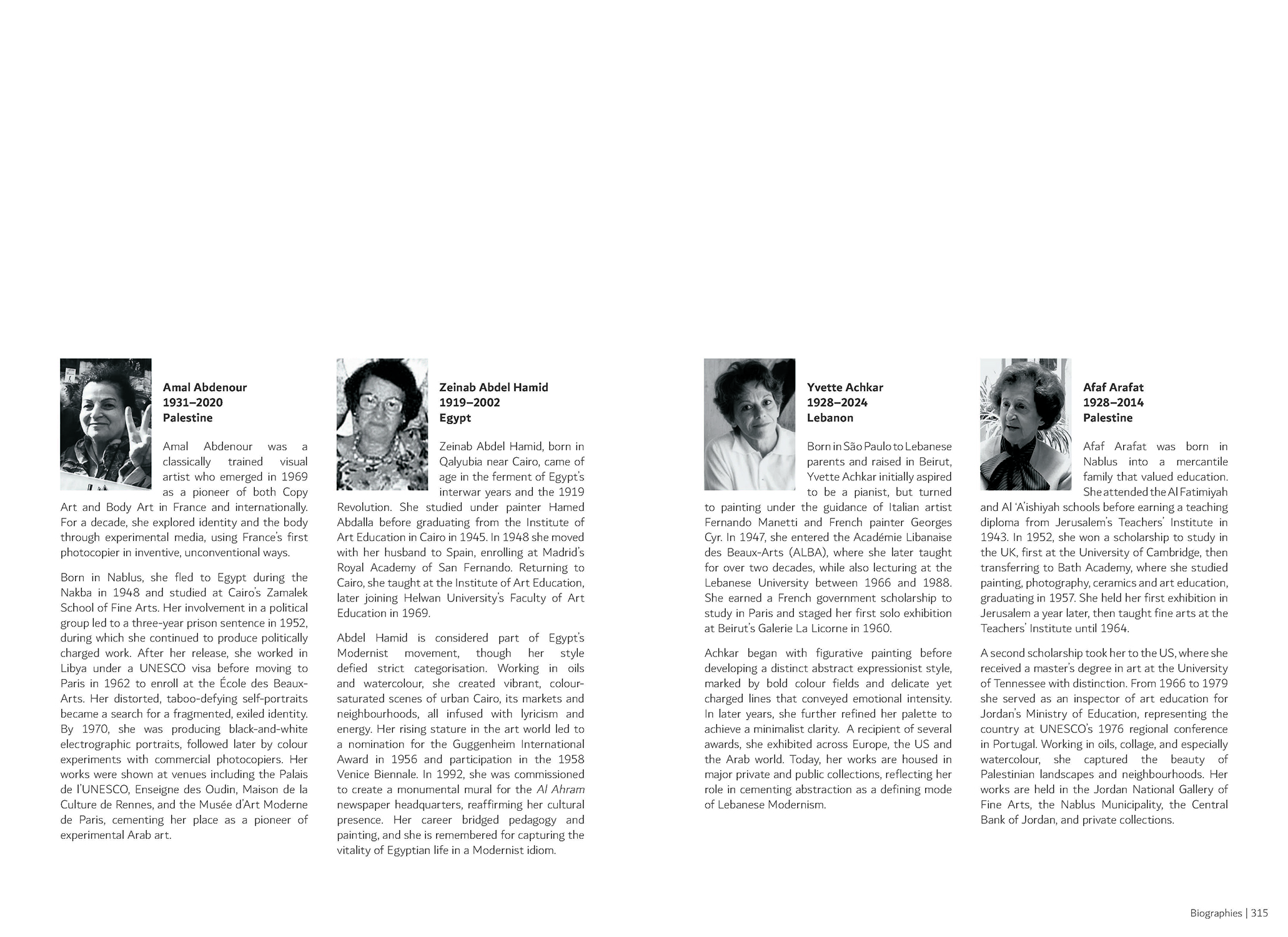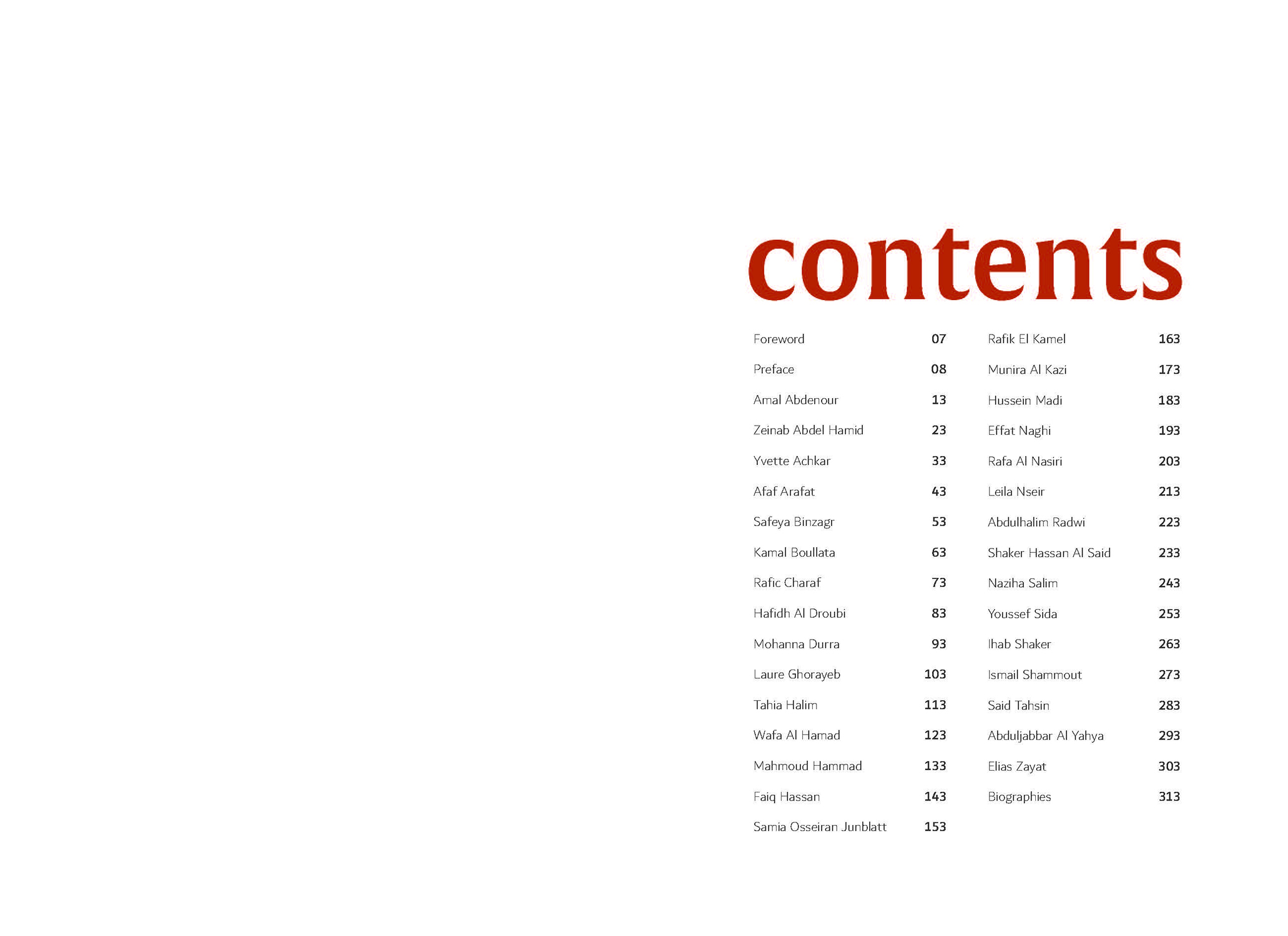 Essays on Amal Abdenour, Zeinab Abdel Hamid, Yvette Achkar, Afaf Arafat, Safeya Binzagr, Kamal Boullata, Rafic Charaf, Hafidh Al Droubi, Mohanna Durra, Laure Ghorayeb, Tahia Halim, Wafa Al Hamad, Mahmoud Hammad, Faiq Hassan, Samia Osseiran Junblatt, Rafik El Kamel, Munira Al Kazi, Hussein Madi, Effat Naghi, Rafa Al Nasiri, Leila Nseir, Abdulhalim Radwi, Shaker Hassan Al Said, Naziha Salim, Youssef Sida, Ihab Shaker, Ismail Shammout, Said Tahsin, Abduljabbar Al Yahya, Elias Zayat.