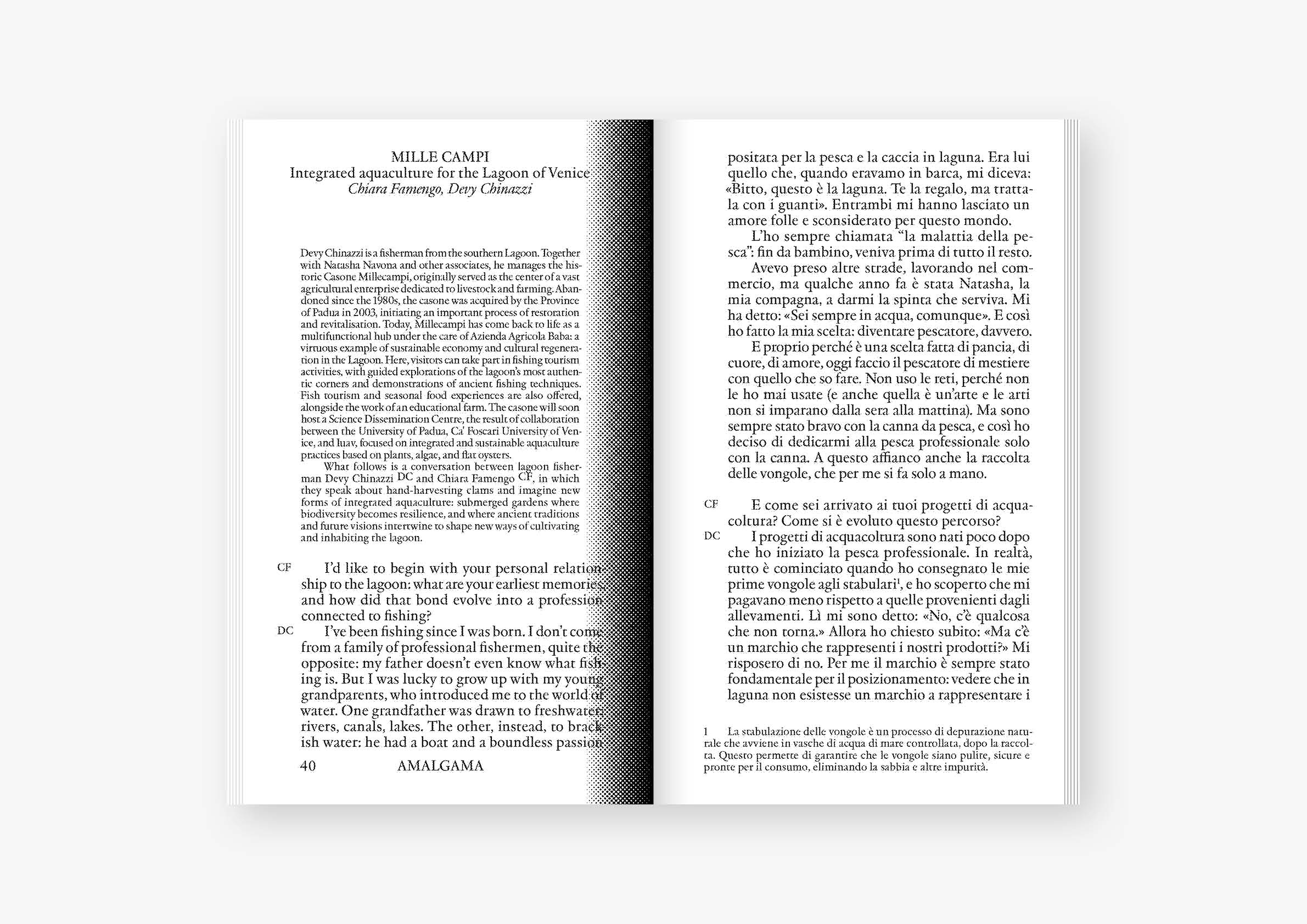 Amalgama is the outcome of the fourth edition of Convivial Tables, a field-based research project commissioned by TBA21–Academy for Ocean Space, dedicated to exploring the relationships between food and ecology, and their impact on bodies of water.