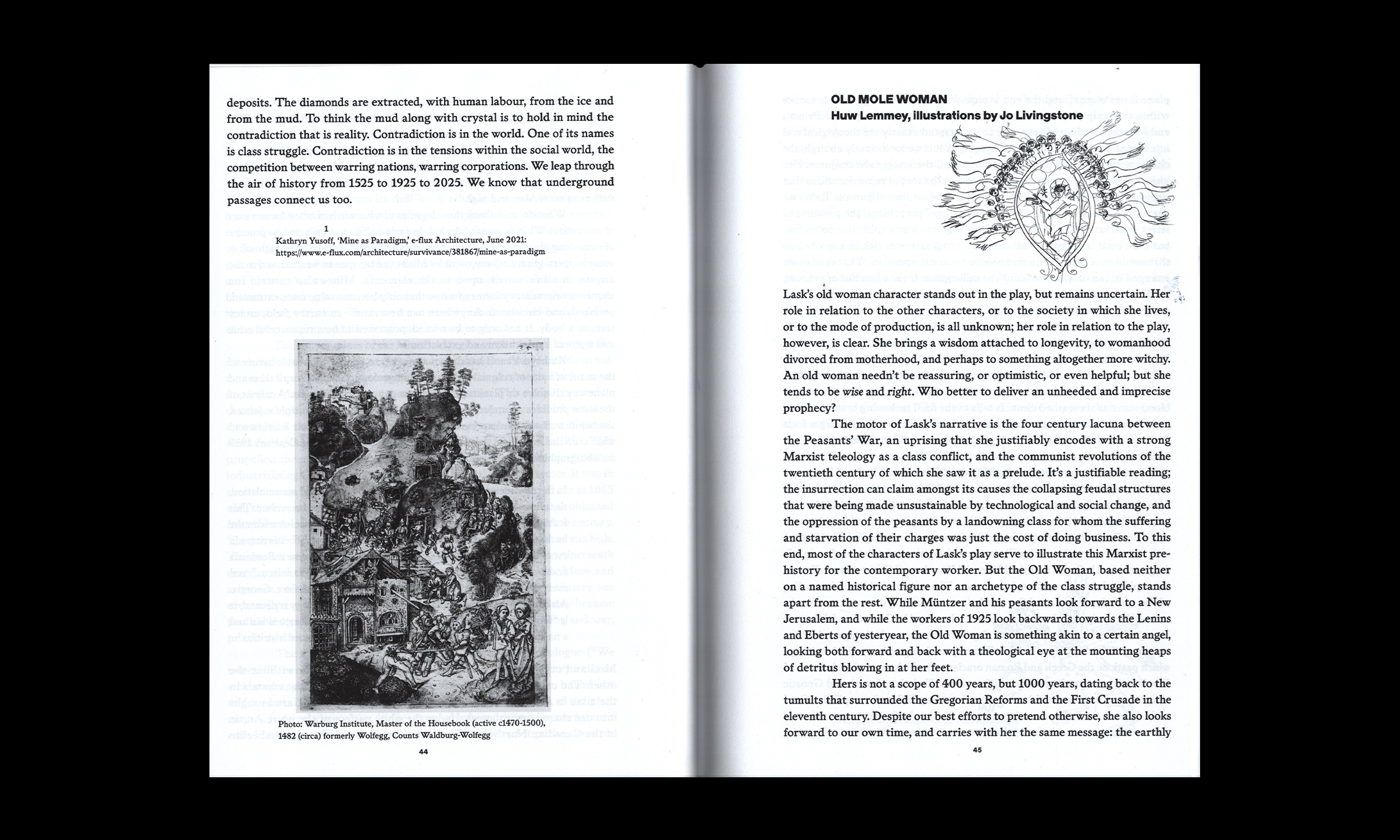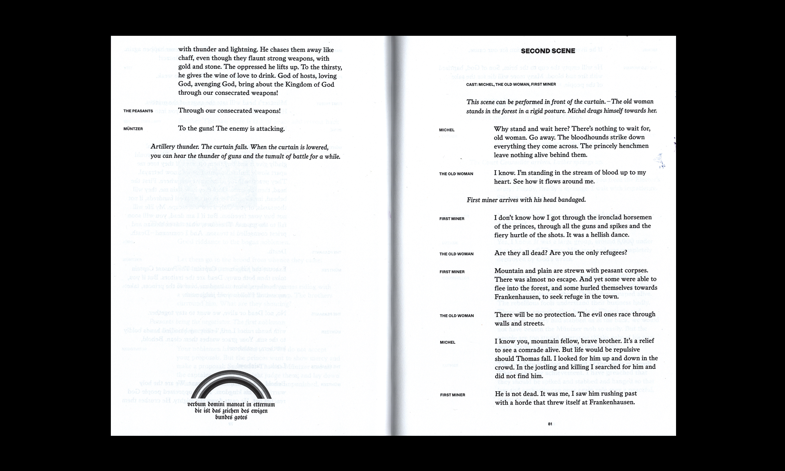 In the play, Lask poses a basic question: What would Thomas Müntzer see if he woke up today? A list accrues: Climate breakdown, imperialism, gendered oppression, earthquakes, genocide, impending fascism. Capitalism didn't dig its own grave. Rather, the dead oppressors of previous centuries have been resurrected, planted in new bodies, tooled with new modes of bondage, within uneven spatial domination and temporal disjunction. Thomas Müntzer, with all of its time travel and its modes of resurrection, addresses the present from a past multiplied.
