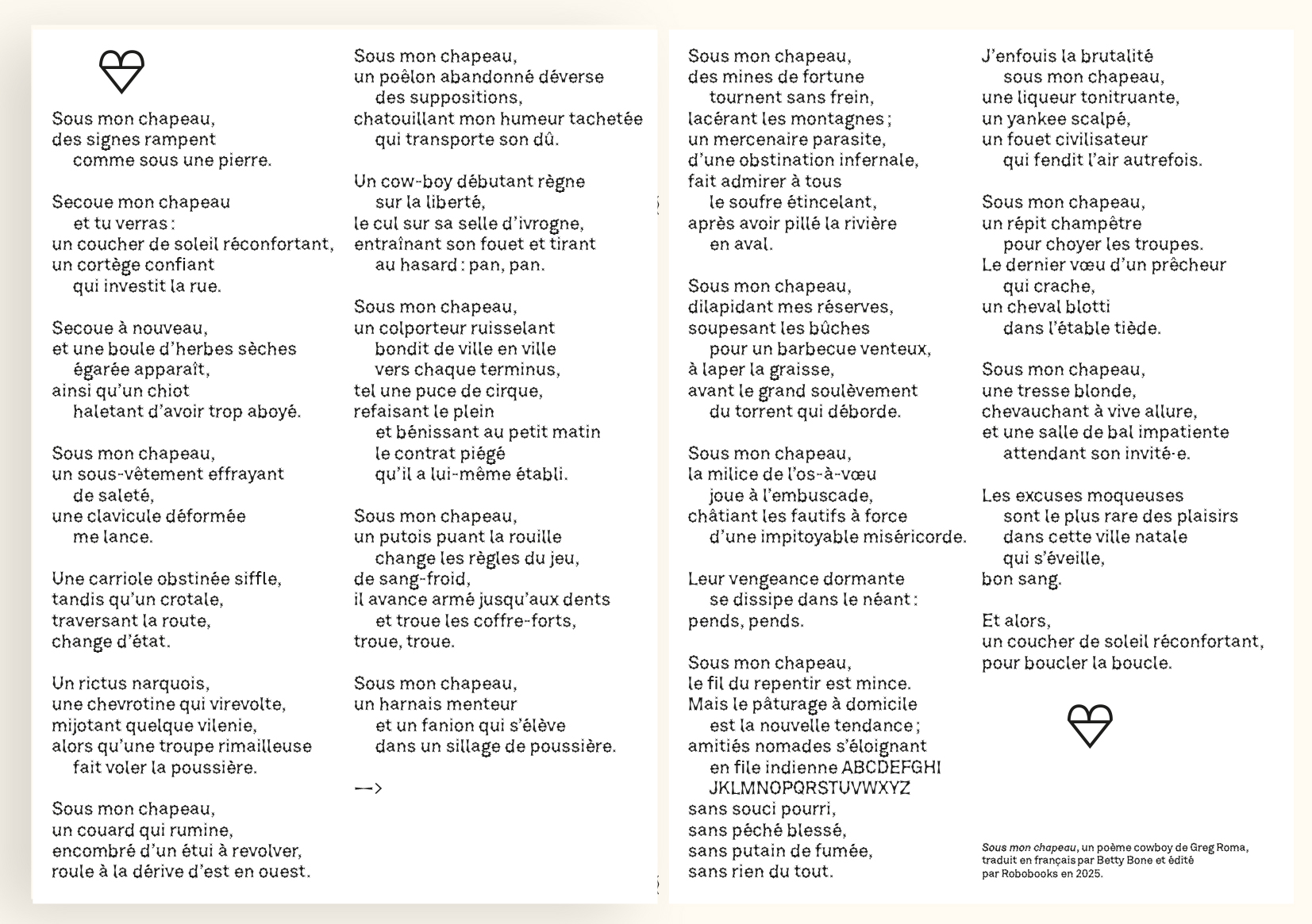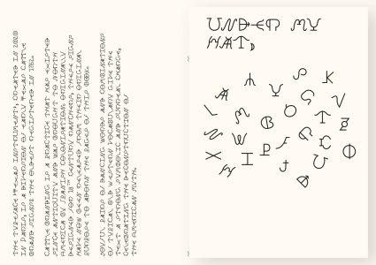 The first issue in a collection of typographic specimens, each inviting a designer to create a fictional story around one of their typefaces, this volume is by Grégoire Romanet, who has repurposed 18th-century Texas Cattle Brand symbols to create a typeface. The accompanying story—a collage of words taken from old Westerns—is a poetic and surreal text, rich in imagery, which borrows from noir Westerns while cultivating a certain absurdity.