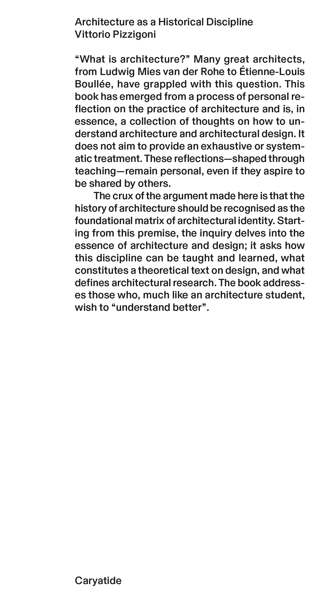 The crux of the argument made here is that the history of architecture should be recognised as the foundational matrix of architectural identity. Starting from this premise, the inquiry delves into the essence of architecture and design; it asks how this discipline can be taught and learned, what constitutes a theoretical text on design, and what defines architectural research. The book addresses those who, much like an architecture student, wish to "understand better".