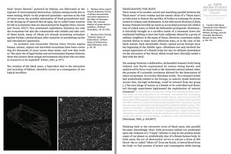 With his article "Black mass" ("Batteries Active Materials Mixture"), interdisciplinary artist and researcher Davide Marcianesi focuses on the toxic – and composite – powder obtained during the recycling or recovery process of lithium-ion batteries: a chemical and cultural mixture, invisible and dangerous, where human and non-human bodies deal with modern narratives and materials in which nature is reduced to an exploitable resource.