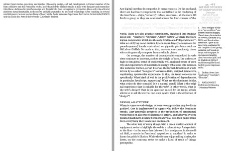 Philosopher, designer, and web developer Adrien Payet analyses the intrinsic functional and morphogenetic capabilities of the original web composite, based on HTML and CSS. From the field of design, and with a certain political urgency, Payet calls for prioritising the specific qualities of the web in order to resist the domination of scripting.