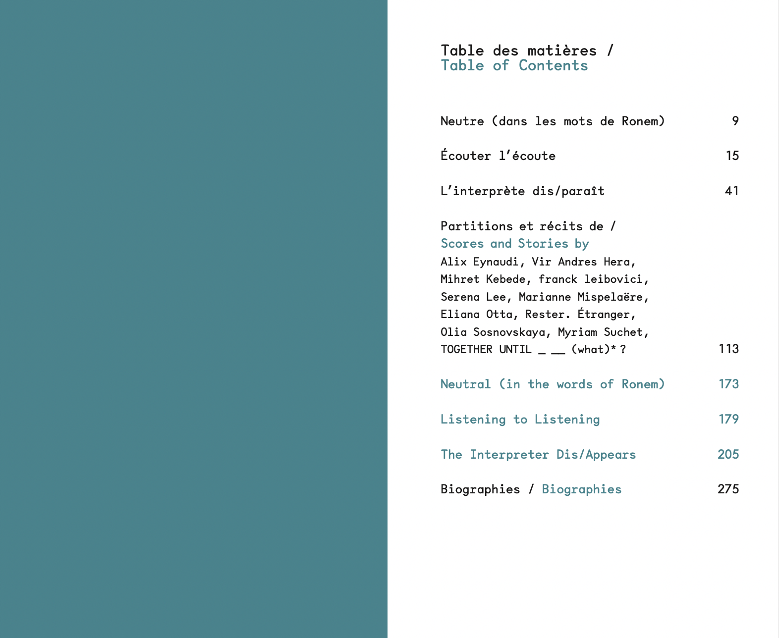 The Interpreter Dis/appears stems from an investigation conducted between 2019 and 2023 by curator, editor, and translator Virginie Bobin, focusing on both professional and volunteer interpreters and translators, as well as representatives from the state and organizations working with exiled individuals navigating asylum application procedures in France. By redirecting attention to the voices of interpreters—rarely visible figures in this ecosystem—the project delves into the ambiguous role of translation at the intersection of those who govern and those governed by asylum law. Within such a controlled environment, can the act of translation, with all its complexities, still express fleeting gestures of solidarity or even resistance? Through the exchanges prompted by these questions, the book seeks to reframe the prevailing public and political discourse on asylum, harnessing the embodied experiences of a small group of interpreters as an alternative lens to reveal the underlying power dynamics at play. It also probes the ethical and political potential of translation. The Interpreter Dis/appears unfolds across a variety of theatrical, artistic, and theoretical writing, alongside insightful contributions from artists and researchers who open up different perspectives for understanding and activating these issues.