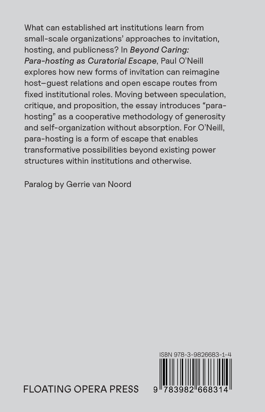 What can established art institutions learn from small-scale organizations' approaches to invitation, hosting, and publicness? In Beyond Caring: Para-hosting as Curatorial Escape, Paul O'Neill explores how new forms of invitation can reimagine host–guest relations and open escape routes from fixed institutional roles. Moving between speculation, critique, and proposition, the essay introduces "para- hosting" as a cooperative methodology of generosity and self-organization without absorption. For O'Neill, para-hosting is a form of escape that enables transformative possibilities beyond existing power structures within institutions and otherwise.
