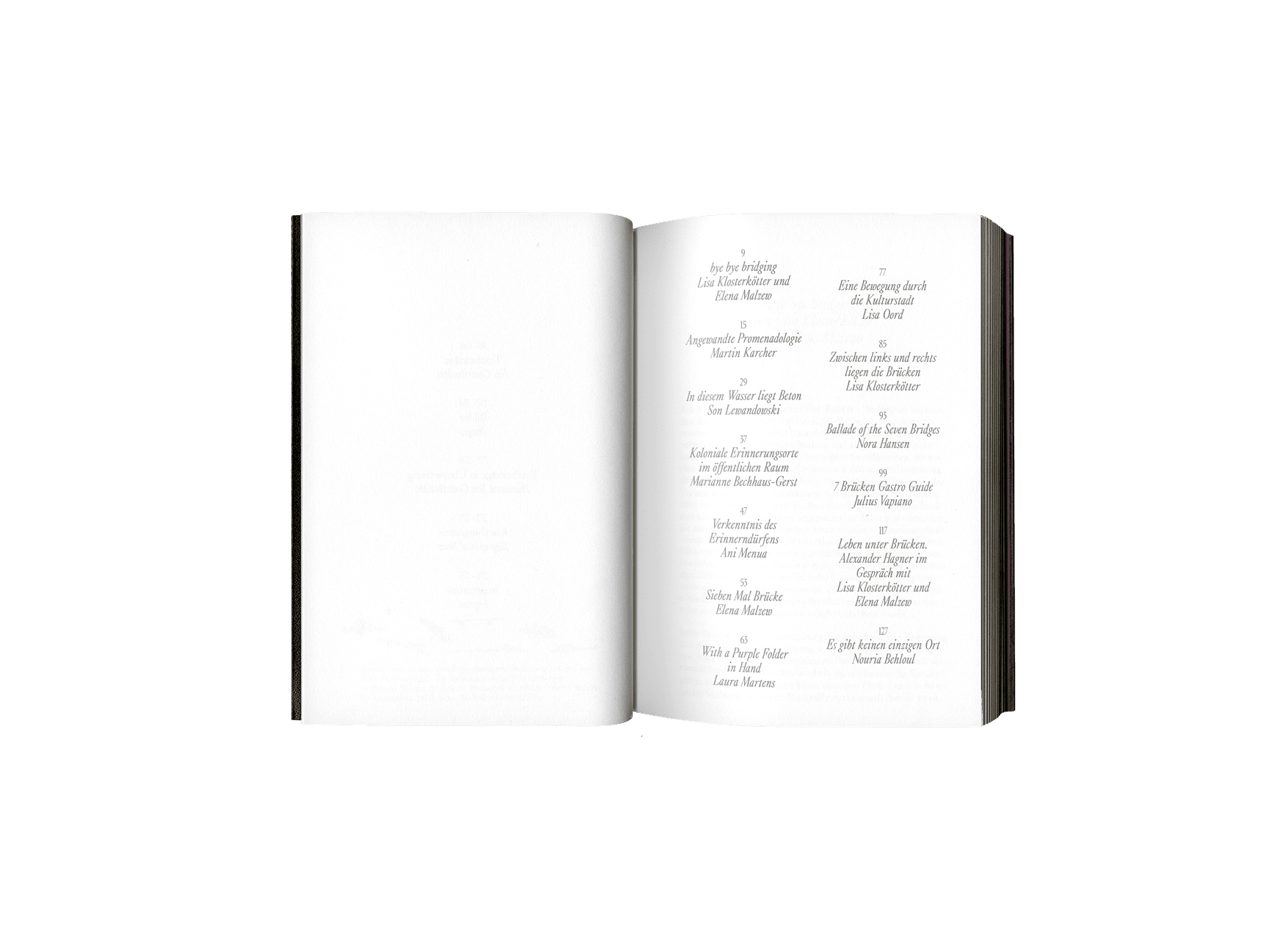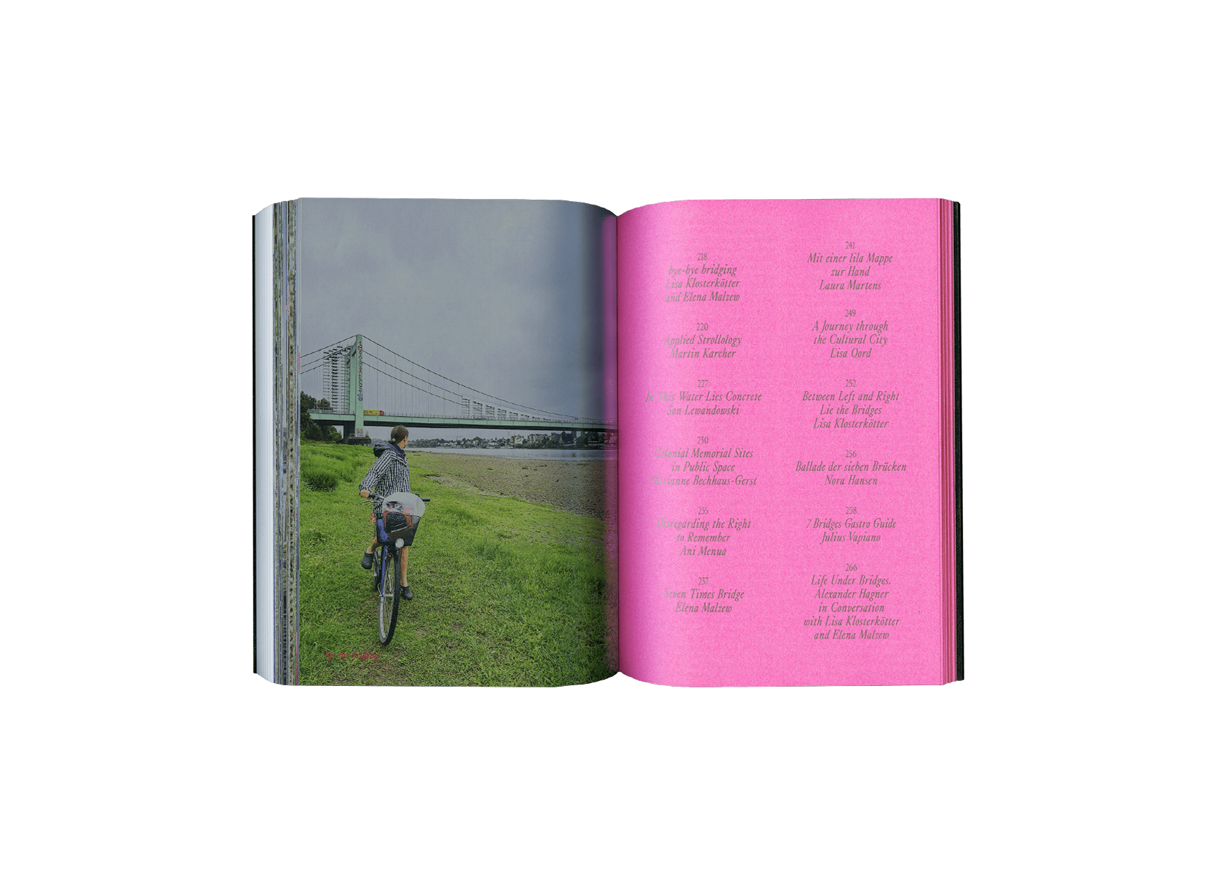 The publication Über Brücken Bridging is intended as a counterweight to the ephemeral nature of the performance and exhibition project. It also extends the exploration of questions that emerged during the work around bridges and opens up new chapters, such as the disappearance of the public sphere and artistic interventions that foster community (Martin Karcher); visibility and commemoration in public space (Son Lewandowski); ownership of memory and collective trauma that is made invisible (Ani Menua); colonial traces in Cologne's public space (Marianne Bechhaus-Gers); public space as a publishing platform (Laura Martens); a gastro guide to the surroundings of the bridges (Julius Vapiano); a ballad voiced by the bridges themselves (Nora Hansen); and homelessness and architectural thresholds between exclusion and inclusion in public space (Alexander Hagner).