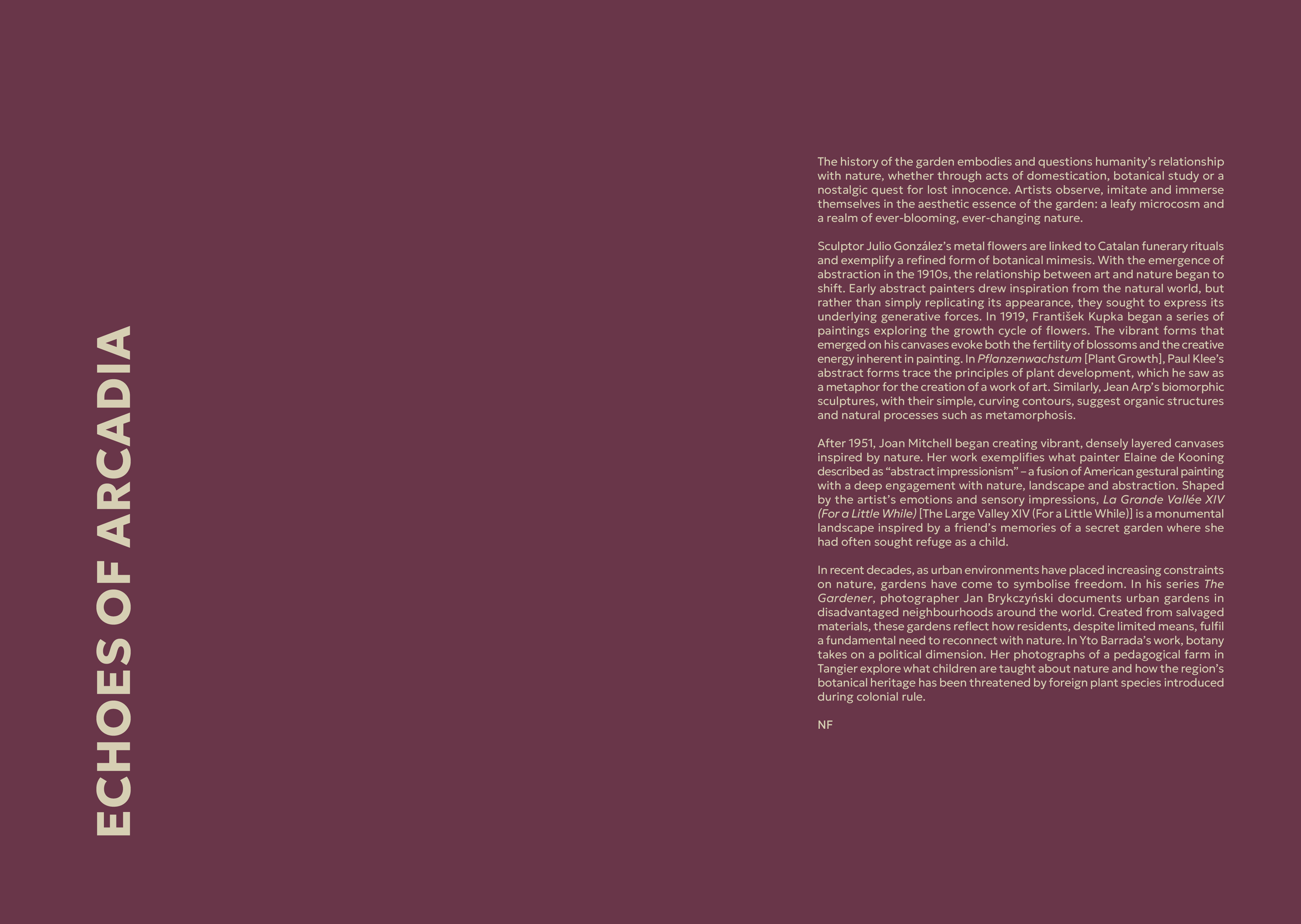 Drawing inspiration from the site of AlUla, uses the allegory of the garden to reveal how modern and contemporary artists explore our evolving relationship to nature and the land. Organised into six chapters, the exhibition delves into nature's multiple manifestations, both real and imagined, on a journey through gardens, forests, deserts and their constellatory reflections in the cosmos. Through showcasing compelling and thought-provoking artworks, the exhibition tackles challenges the world encounters today, examining notions of the threat of climate change, migratory displacement, the spread of urbanization, and the Anthropocene, defined as the age of humanity's profound impact on the planet.