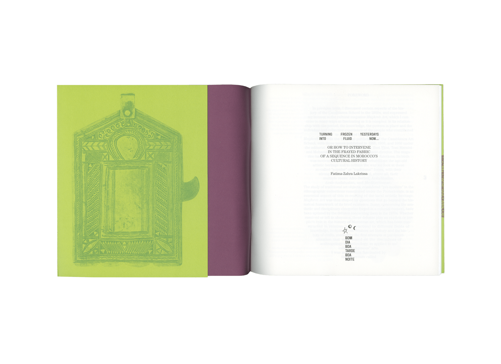 Turning Frozen Yesterdays into Fluid Now… focuses on the intersecting and complementary, but also fundamentally unique approaches of Toni Maraini and Bert Flint at the time of Maghreb Art. The essay draws attention to the context, both theoretical and practical, in which the emerging paradigm of a post-colonial art history was debated. It is connected to a fictional dialogue between the two Maghreb Art's theorists: a montage of fragments of their published writings from the period 1960-1990. It highlights the question of method and their respective gazes on the objects, as well as the interpretations they put forward. Other questions focus on the shifts in meaning induced by the transfer from the "field" or "original context" to the museum or school. The opposite process, which aims at re-interrogating the social function of art is addressed by Gilles Aubry, sound artist, musician and researcher, who has been invited by Fatima-Zahra Lakrissa to consider the contemporary reception of Maghreb Art.
