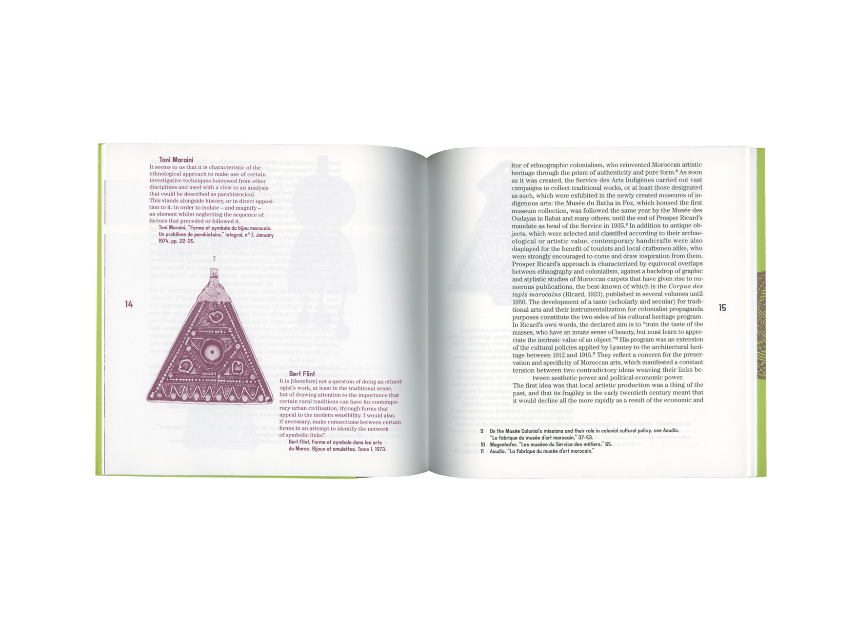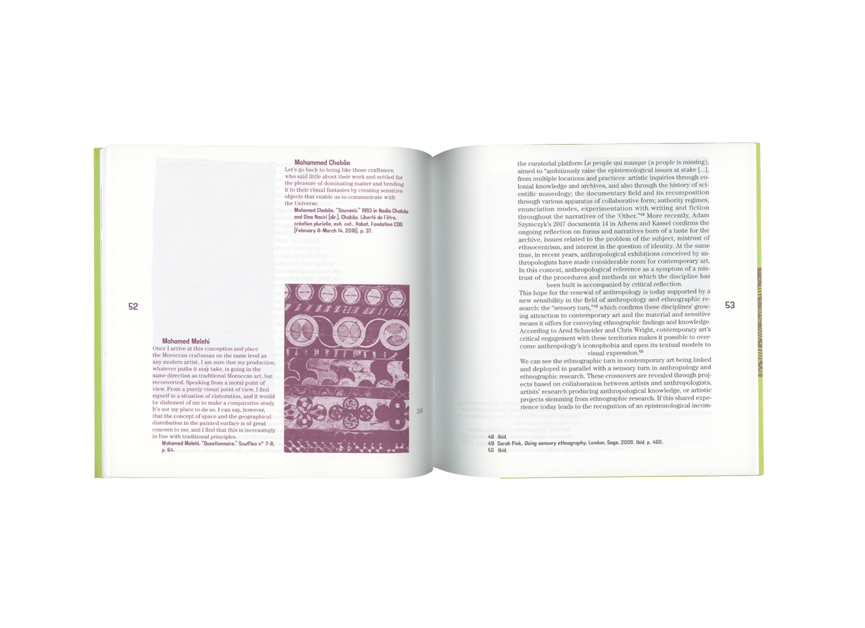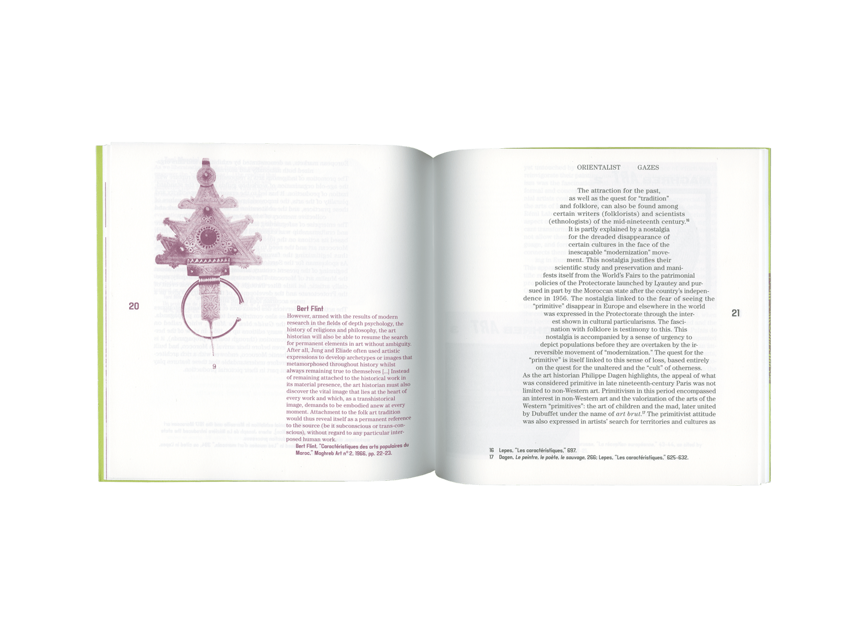 Maghreb Art accompanied the first attempts to structure a new field of knowledge, situated at the intersection of artistic and pedagogical experimentation, anthropology, material culture, and art history. Over the three years of existence, the journal Maghreb Art established itself as a pedagogical tool and as a fully active witness to the interaction between experimentation and theory, which forged the avant-garde reputation of the school in the wake of Morocco's independence.