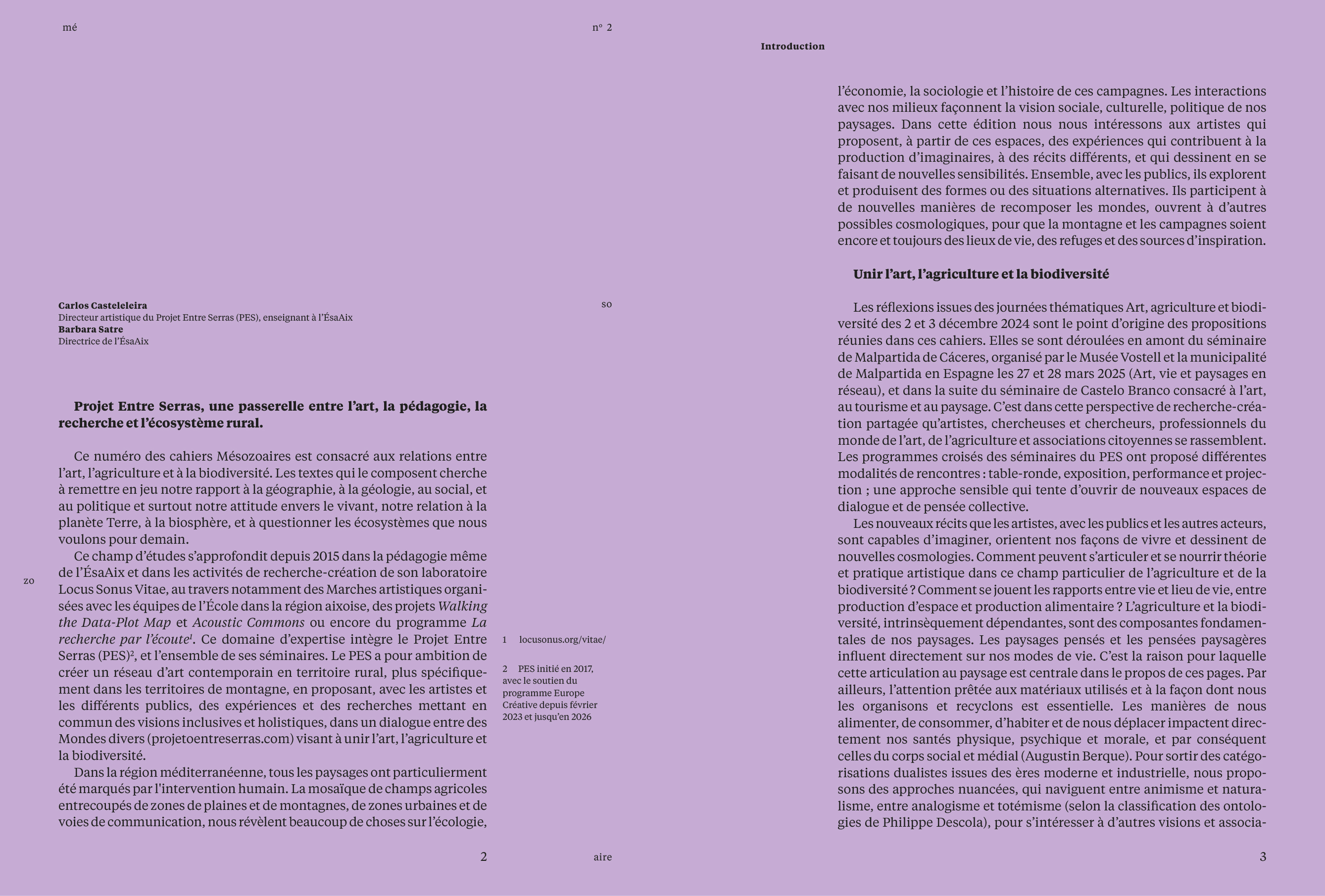 Cahiers mésozoaires is a transdisciplinary journal published by the École supérieure d'art d'Aix-en-Provence. Directed by an international scientific and artistic committee, it publishes twice a year the proceedings of arts-sciences events where practices, theories, activisms and citizens' lives come together.