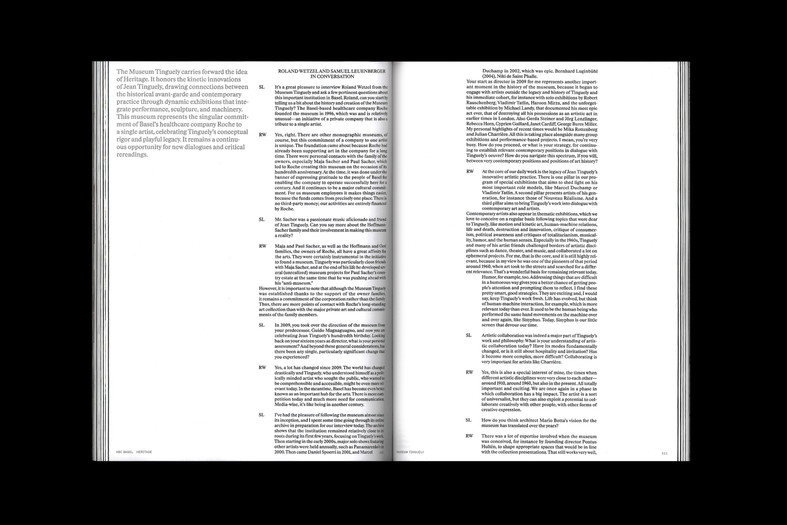 The volume is further enriched by three in-depth conversations between Samuel Leuenberger and Sam Keller, Director of Fondation Beyeler; Roland Wetzel, Director of Museum Tinguely; and Raphael Suter, Director of Kulturstiftung Basel H. Geiger | KBH.G, as well as contributions from Elena Filipovic, Director of Kunstmuseum Basel, and Ines Goldbach, Director of Kunsthalle Basel, to name just a few.