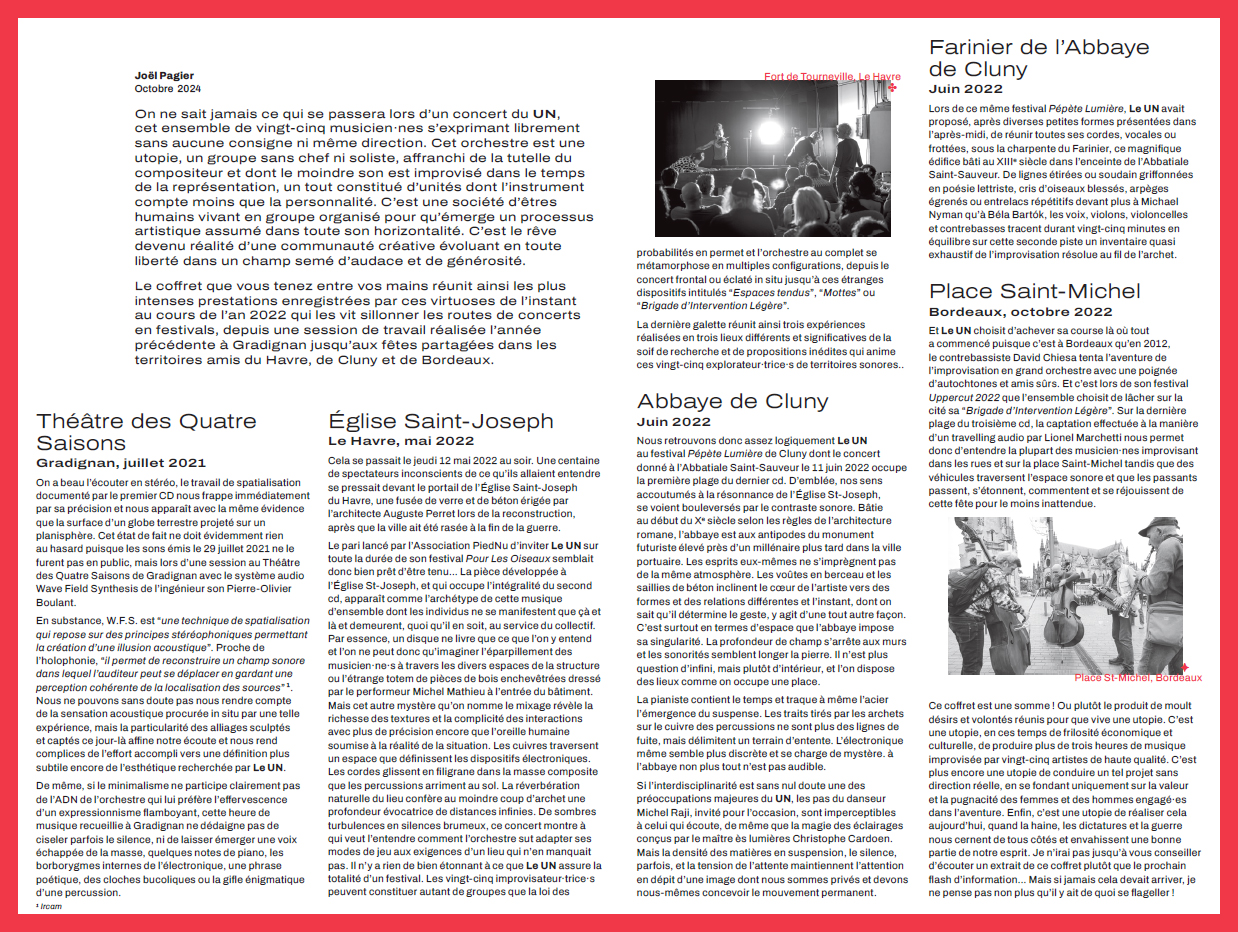 A three-CD set offering a glimpse into the work of the improvisation ensemble Le UN, featuring performances by a large ensemble in various acoustic settings (CDs 1 & 2), small and medium-sized ensembles, and outdoor performances in public spaces (light intervention brigade).