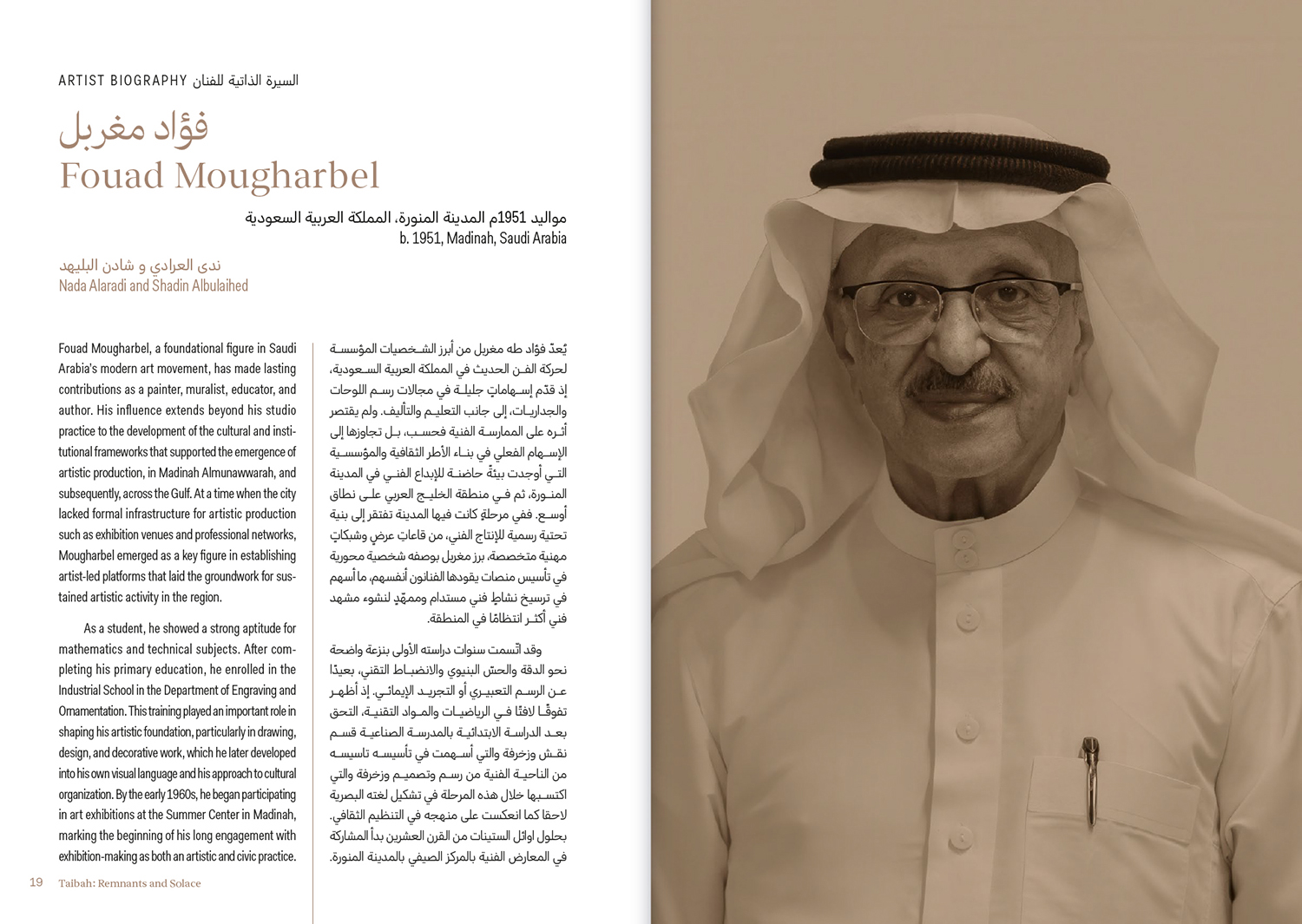 Fouad Mougharbel (born 1951 in Medina), a foundational figure in Saudi Arabia's modern art movement, has made lasting contributions as a painter, muralist, educator, and author. His influence extends beyond his studio practice to the development of the cultural and institutional frameworks that supported the emergence of artistic production, in Madinah Almunawwarah, and subsequently, across the Gulf. At a time when the city lacked formal infrastructure for artistic production such as exhibition venues and professional networks, Mougharbel emerged as a key figure in establishing artist-led platforms that laid the groundwork for sustained artistic activity in the region.