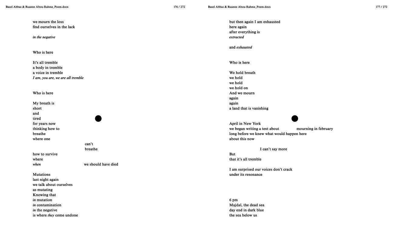 The exhibition presented works, specifically commissioned for the occasion, by Basel Abbas & Ruanne Abou-Rahme, alfatih, American Artist, Danielle Brathwaite-Shirley, Sheila Chiamaka Chukwulozie,