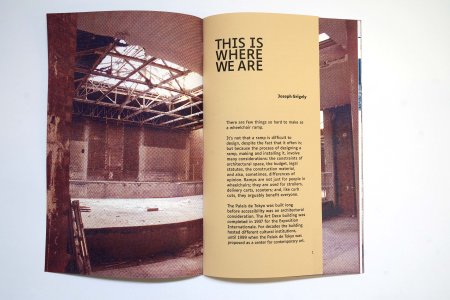 This artist's book by Joseph Grigely brings together his research, ideas and thoughts, as well as visual materials, on access ramps and his stairs/ramp (what is called a "stamp") project designed for a space at the Palais de Tokyo as part of his solo exhibition