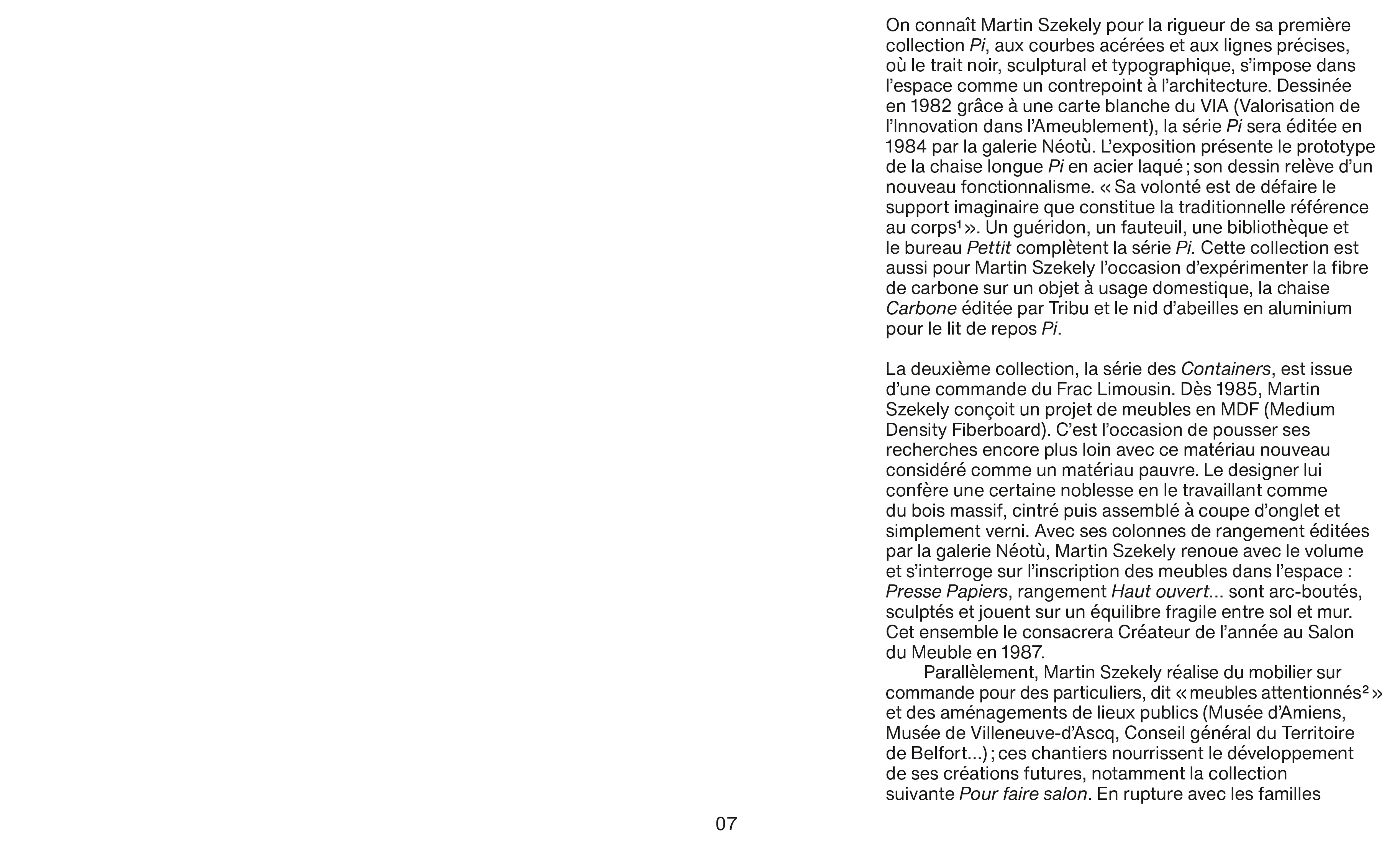 Après avoir présenté les premiers travaux de Martin Szekely dans un parcours d'exposition en deux volets (2020-2021 puis 2022), Rémi Gerbeau et Jean-Philippe Mercier consacrent un ouvrage à ces créations – des « meubles attentionnés » – à travers ses premières grandes commandes.