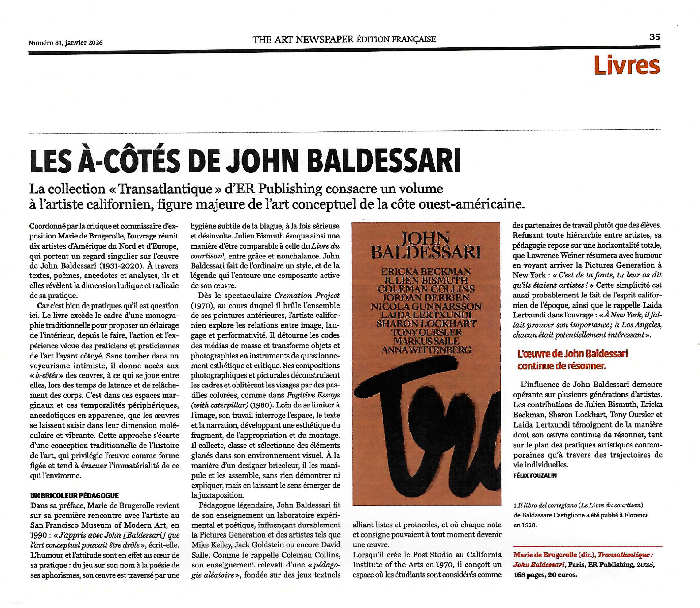 John Baldessari est l'un des principaux représentants de l'art conceptuel de la côte ouest américaine. Baldessari explore la langue et la culture des médias de masse dans ses peintures et compositions photographiques, en interrogeant la relation des images aux textes. Enseignant tout au long de sa carrière, il marque des générations d'artistes ; influence toujours très présente aujourd'hui, aussi bien en Amérique du Nord qu'en Europe. Marie de Brugerolle réunit dix artistes qui illustrent, de part et d'autre de l'Atlantique, l'impact de son œuvre.