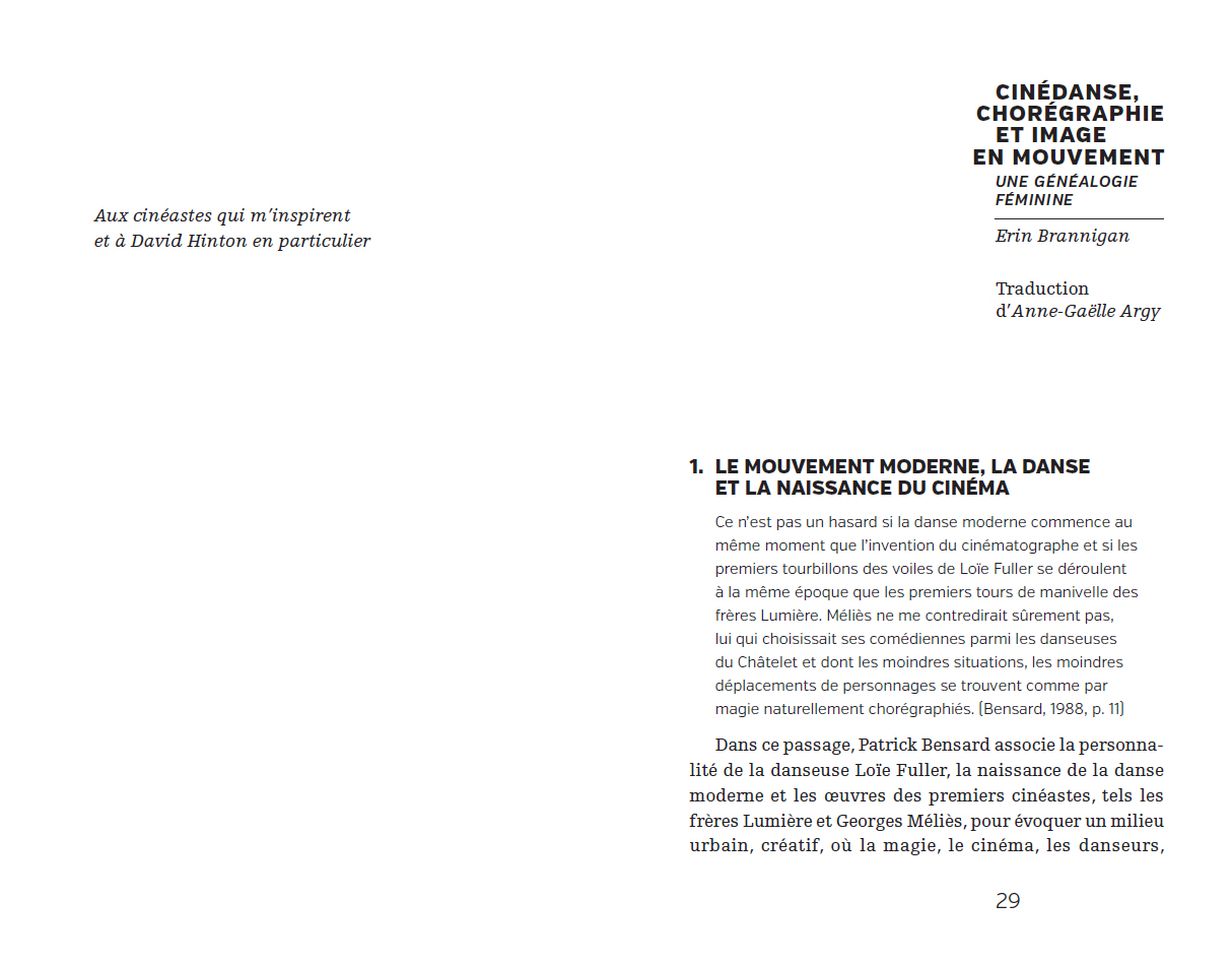Ce livre retrace les grandes lignes d'une généalogie de la cinédanse, des avant-gardes du début du XXe siècle à l'essai vidéo contemporain, en s'arrêtant sur les inventions techniques et esthétiques de quelques pionnières de l'histoire de la danse et du cinéma. L'ouvrage présente la cinédanse comme une modalité qui défie les modèles familiers du mouvement cinématographique à travers sa relation au corps, au mouvement et au temps, générant de nouvelles catégories de performance filmique et créant des expériences somatiques chez les spectateurices. S'appuyant sur la théorie cinématographique, celle des arts visuels et l'étude de la danse, tout en convoquant la philosophie et la littérature, l'ouvrage défend l'idée que cette hybridation produit des pratiques ciné-chorégraphiques singulières, méritant d'être historicisées. Cette approche transdisciplinaire innovante permet d'aborder la cinédanse non pas comme un sous-champ de la création cinématographique, mais comme une forme de danse élargie.