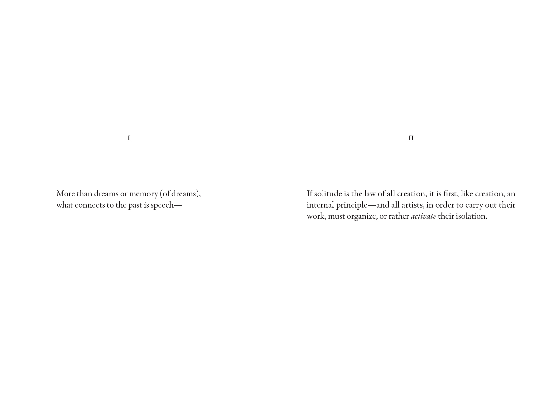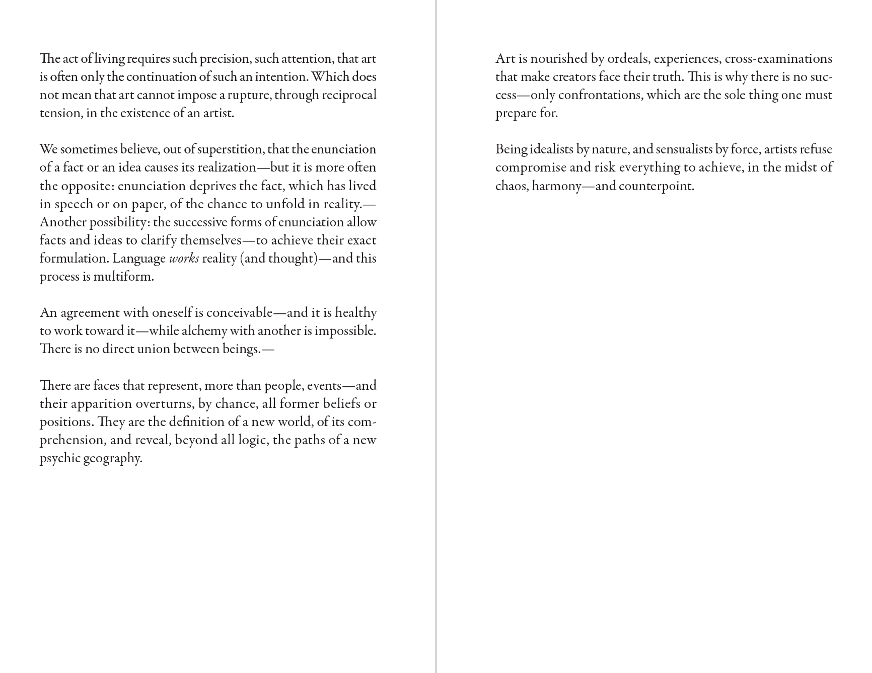 The body, in order to assimilate the immense (and immensely violent) amount of information it receives, engages in a work of translation of which dreams and art are the privileged figures. More than the expression of impressions, which is still a physical phenomenon, what is at stake is to decode the encrypted messages of reality, then formulate them in a target language that, through its materiality, has the power to heal the subject's psyche. (in Mode)