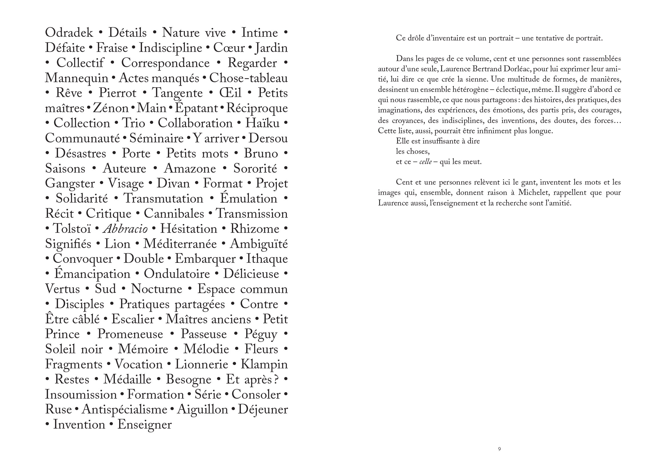 Dans les pages de ce volume, cent et une personnes sont rassemblées autour d'une seule, Laurence Bertrand Dorléac, pour lui exprimer leur amitié, lui dire ce que crée la sienne. Une multitude de formes, de manières, dessinent un ensemble hétérogène – éclectique, même. Il suggère d'abord ce qui nous rassemble, ce que nous partageons : des histoires, des pratiques, des imaginations, des expériences, des émotions, des partis pris, des courages, des croyances, des indisciplines, des inventions, des doutes, des forces… Cette liste, aussi, pourrait être infiniment plus longue.