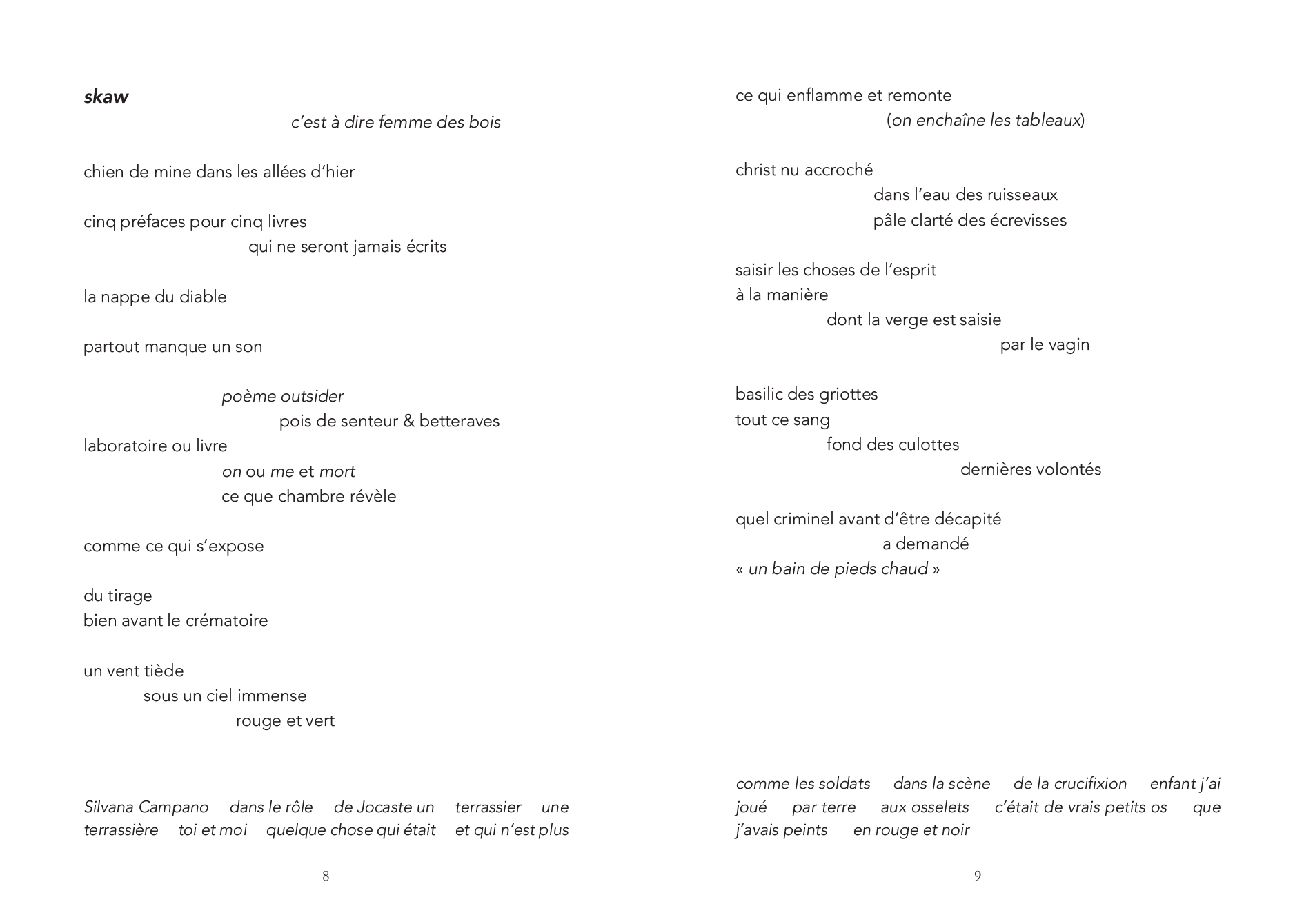 Robert Cantarella), radio (Atelier Création Radiophonique et Fictions France Culture), actions minuscules… En 2013 elle co-dirige chez Bazar édition un mensuel de poésie