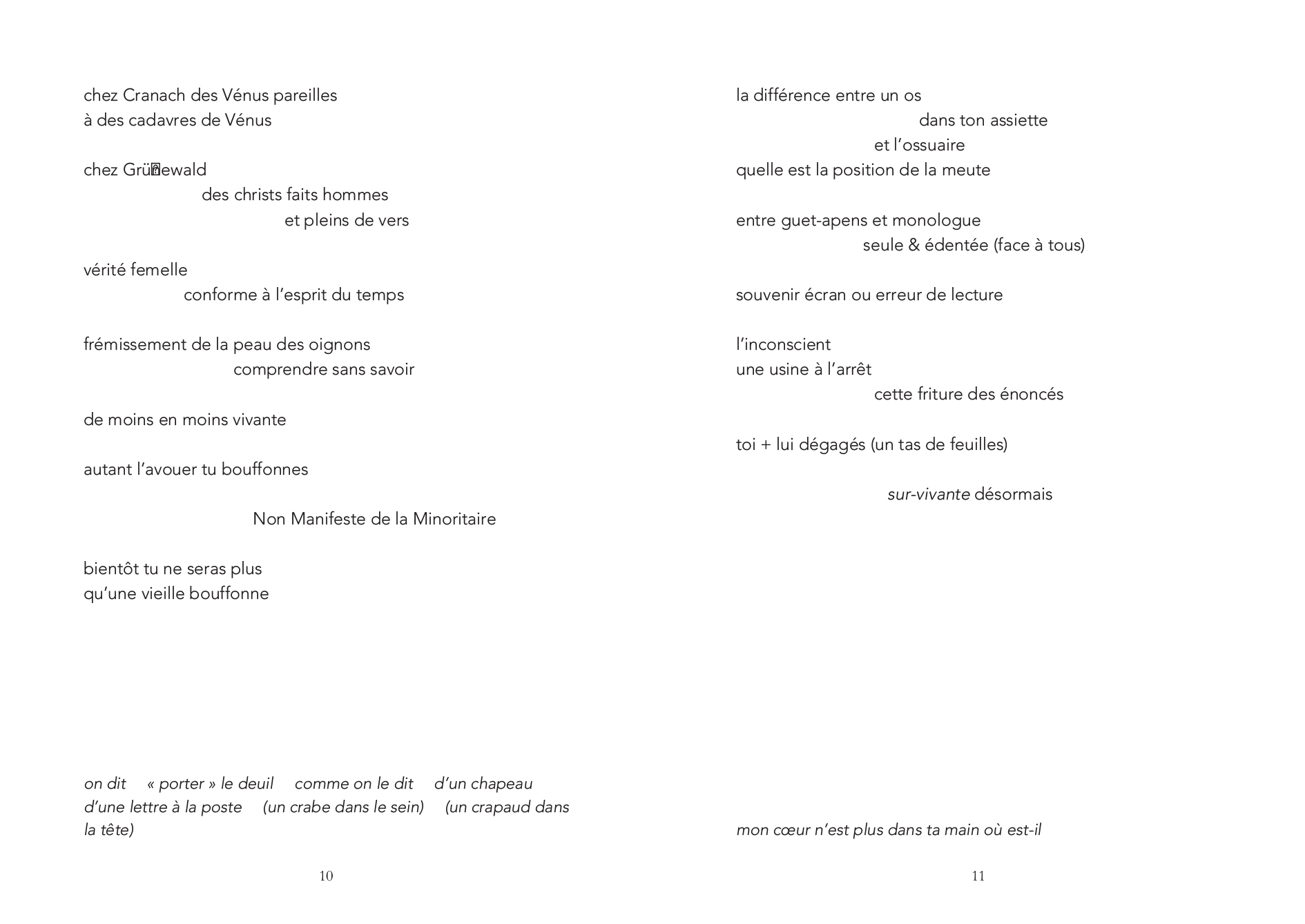 Un long poème narratif ponctué de 12x2 dessins, montage d'énoncés et de notations dans lequel une poétesse (grosse et vieille) tient une sorte de journal où s'articule la destruction du corps privé à celle du corps social.