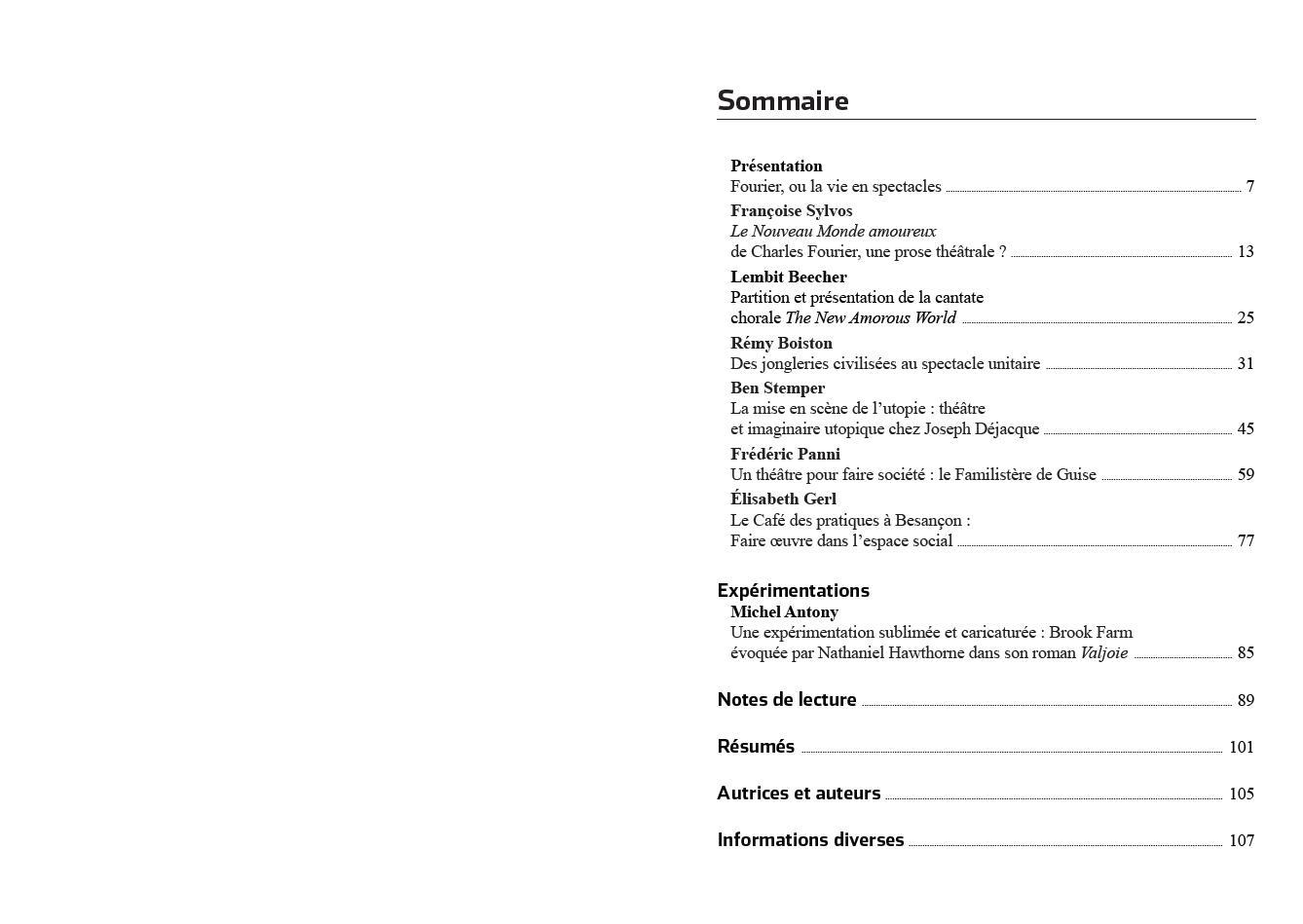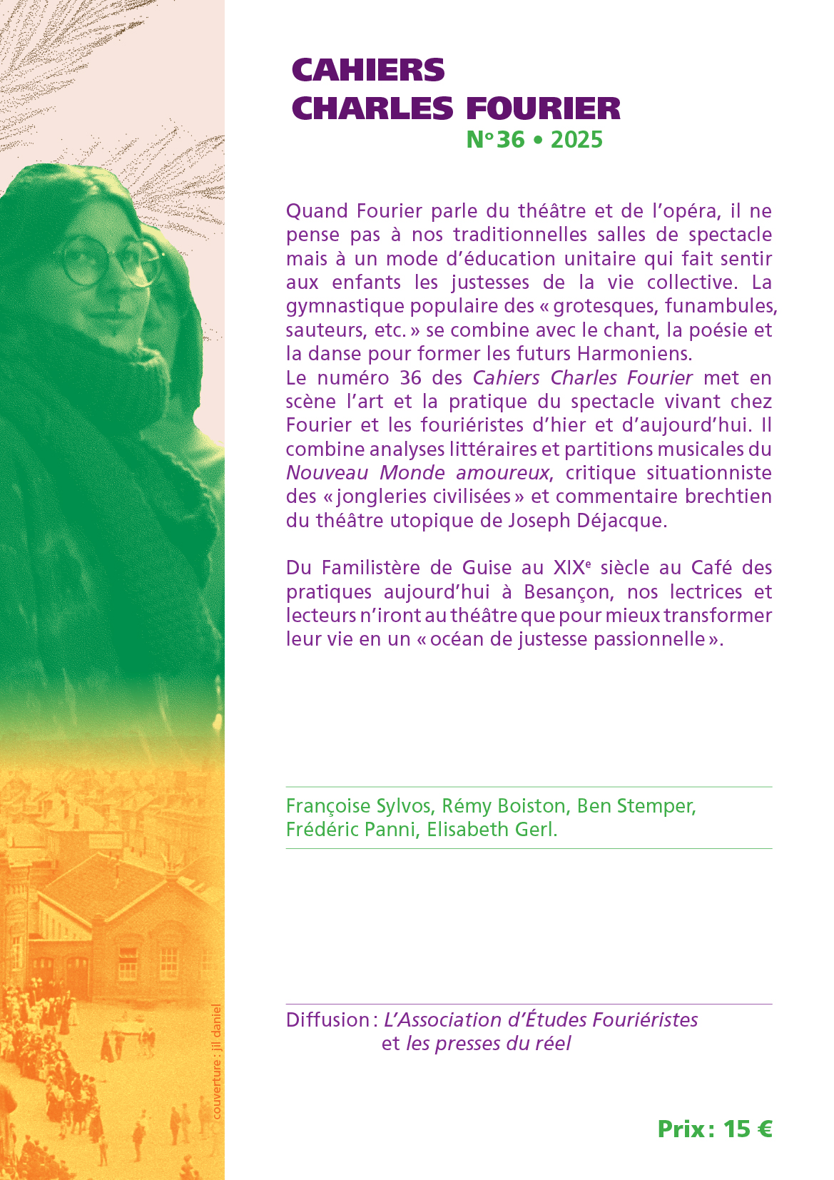 Le numéro 36 des Cahiers Charles Fourier met en scène l'art et la pratique du spectacle vivant chez Fourier et les fouriéristes d'hier et d'aujourd'hui. Il combine analyses littéraires et partitions musicales du Nouveau Monde amoureux, critique situationniste des « jongleries civilisées » et commentaire brechtien du théâtre utopique de Joseph Déjacque.