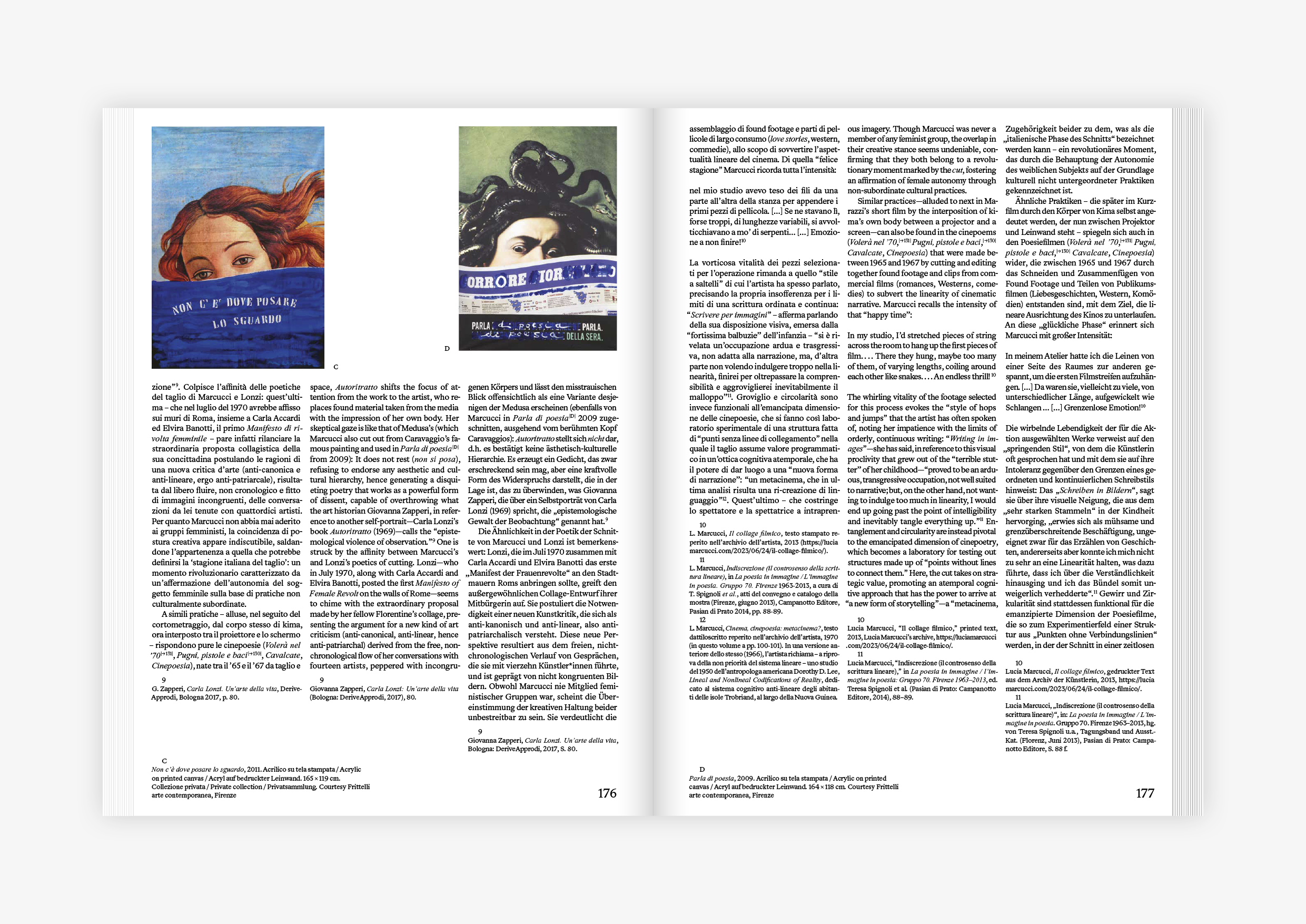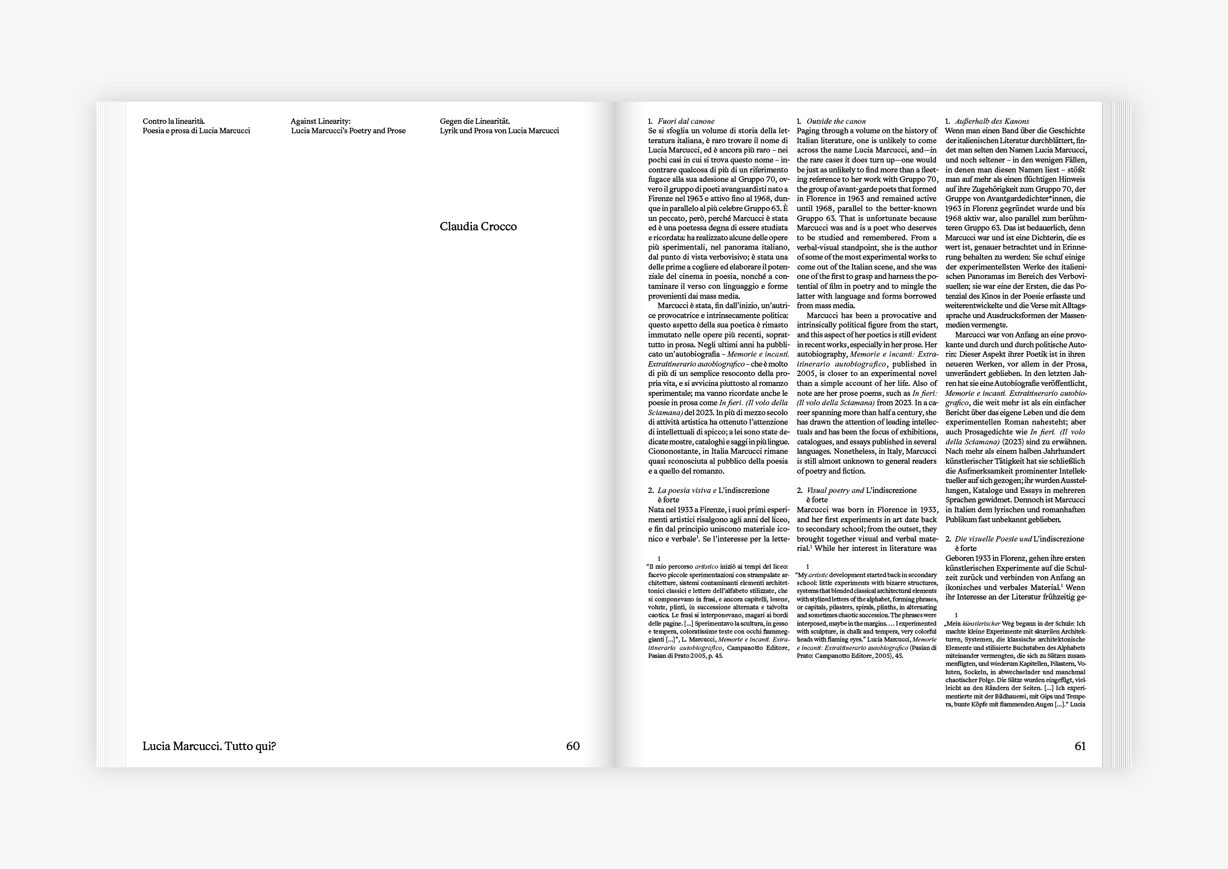 Cette monographie est issue des deux expositions organisées à Ar/Ge Kunst et au Museion (Bolzano). Cet ouvrage propose une exploration critique de la pratique artistique de Marcucci à travers les contributions de commissaires et d'historiens de l'art. Publié en trois langues, il contient des images d'œuvres inédites, grâce à une recherche archivistique approfondie, ainsi que des documents également inédits de l'artiste elle-même, notamment des textes et des poèmes disséminés tout au long du livre. Outre les textes des commissaires Frida Carazzato et Francesca Verga, la publication comprend des essais de Claudia Crocco, Gilda Policastro, Francesco Tenaglia, Maria Alicata, Annalisa Sacchi, Giulia Crispiani, Dalila Colucci, Vanessa Desclaux et Raffaella Perna.