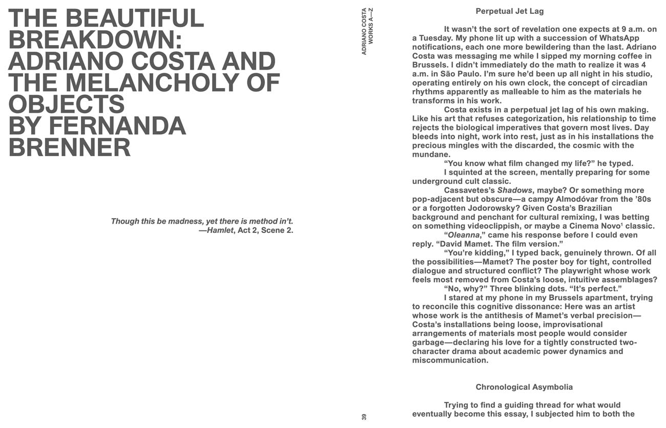 Ce catalogue sans précédent rassemble plus de 300 œuvres créées par Adriano Costa au cours de trois décennies, classées par ordre alphabétique – les titres occupant une place centrale dans les œuvres de Costa –, ainsi que de nouveaux textes de Fernanda Brenner et Milovan Farronato, deux critiques qui suivent et défendent depuis longtemps le travail de l'artiste.
