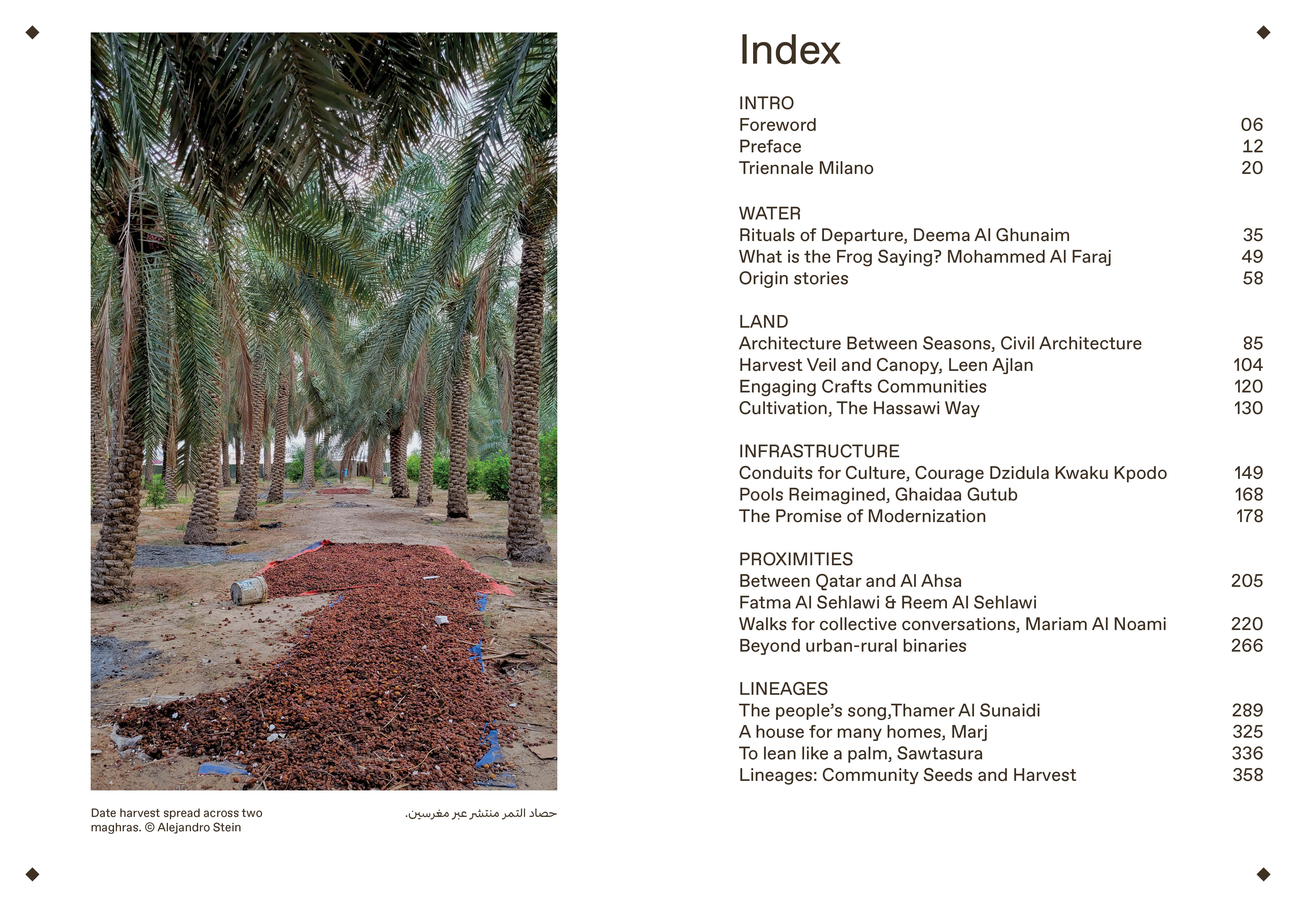 Centré sur la région d'Al-Hassa, l'une des oasis les plus anciennes et les plus vastes au monde, cette publication (qui accompagne le pavillon saoudien à la 24e Triennale de Milan, marquant la première participation de l'Arabie saoudite à cette plateforme mondiale d'architecture et de design) réinvente la ferme comme un lieu de recherche collective, où convergent les changements environnementaux, la mémoire culturelle et les pratiques communautaires.