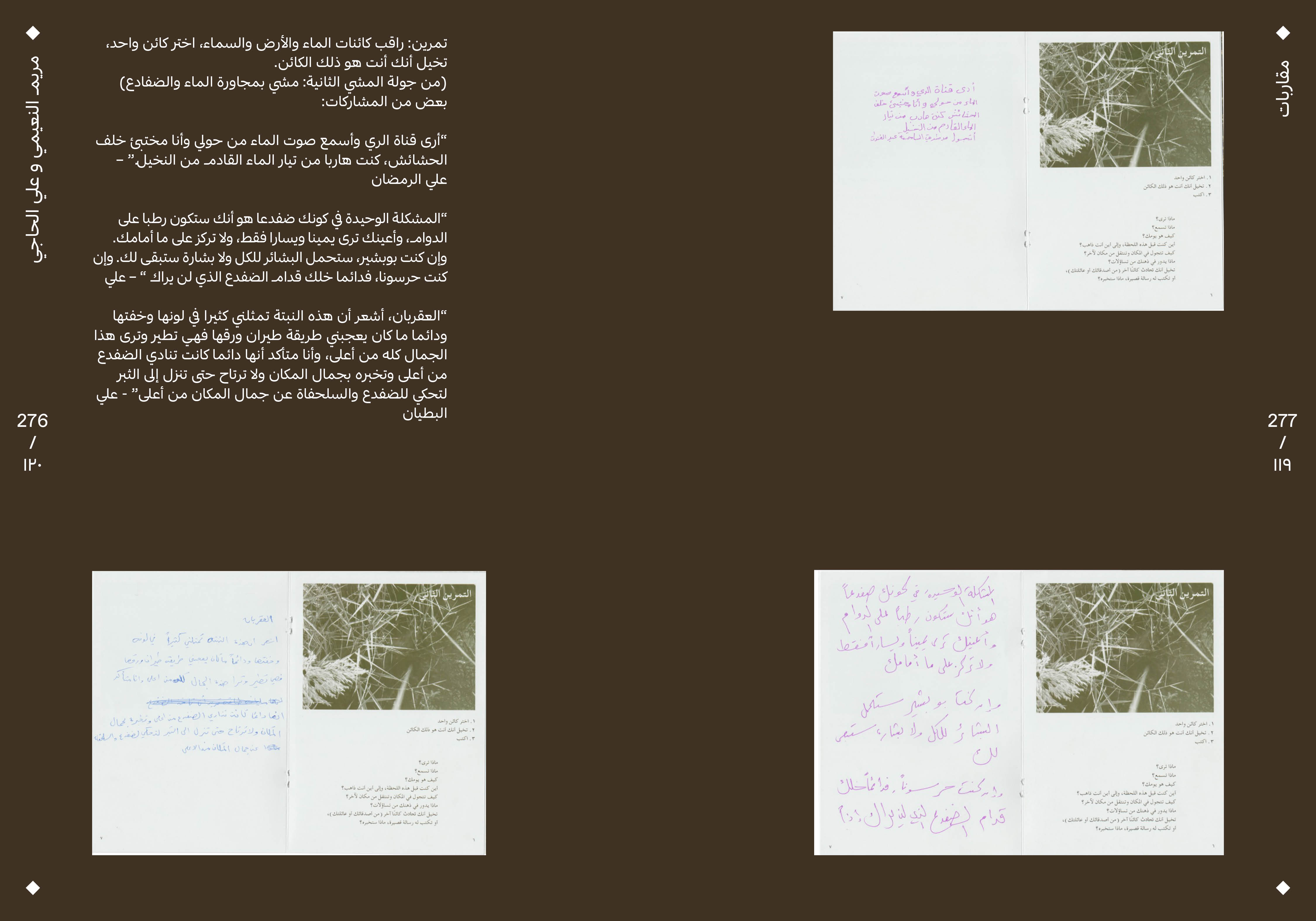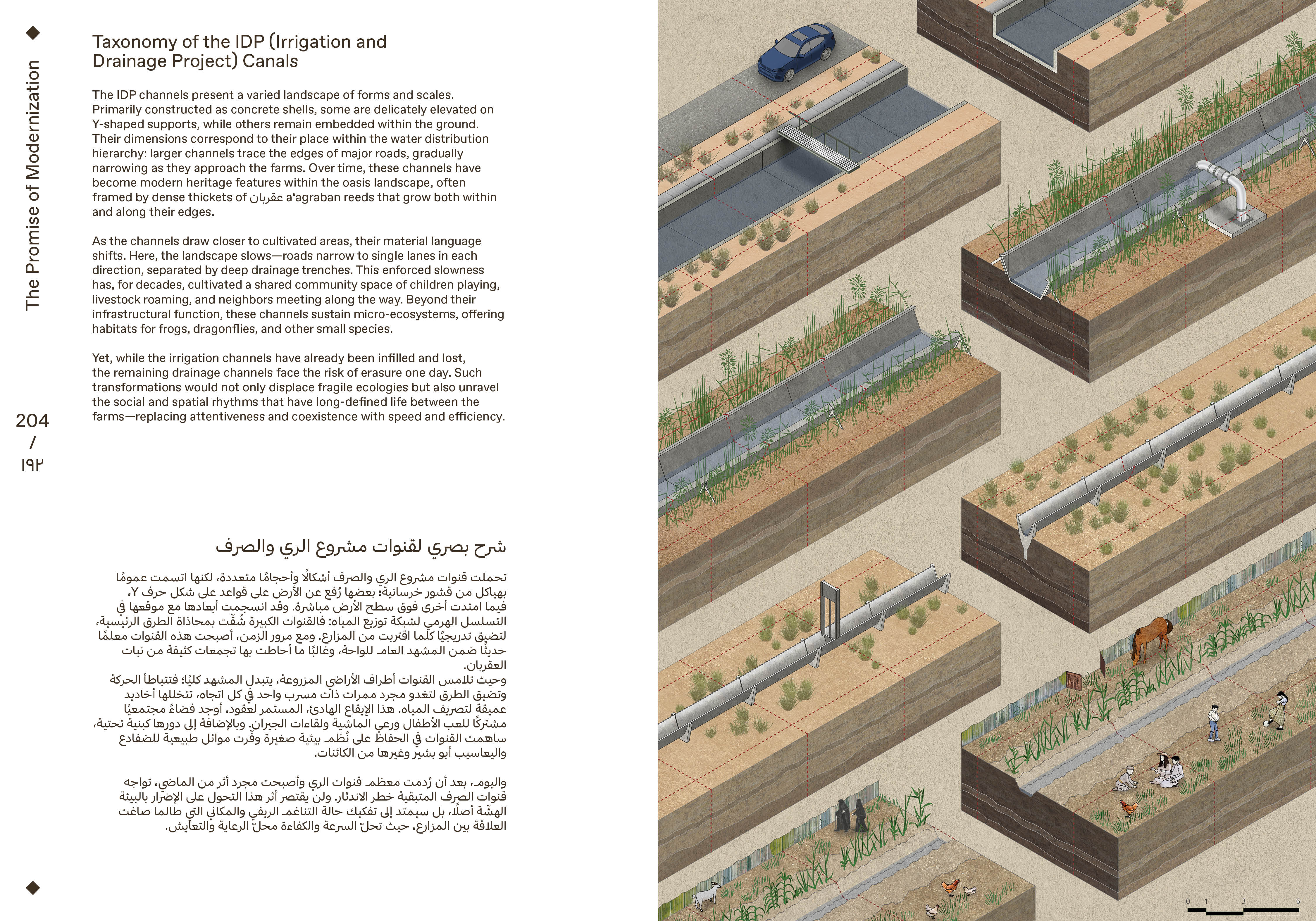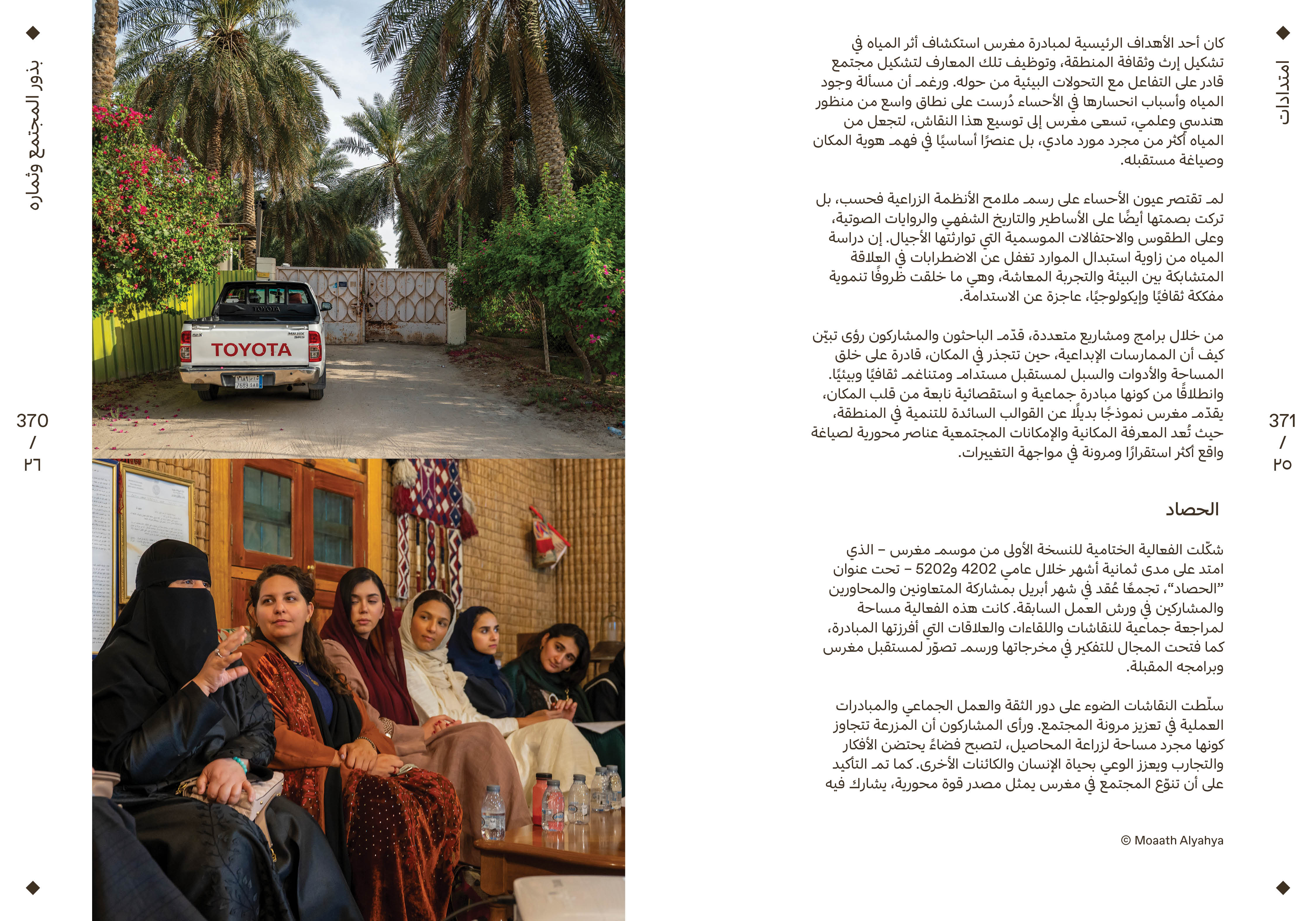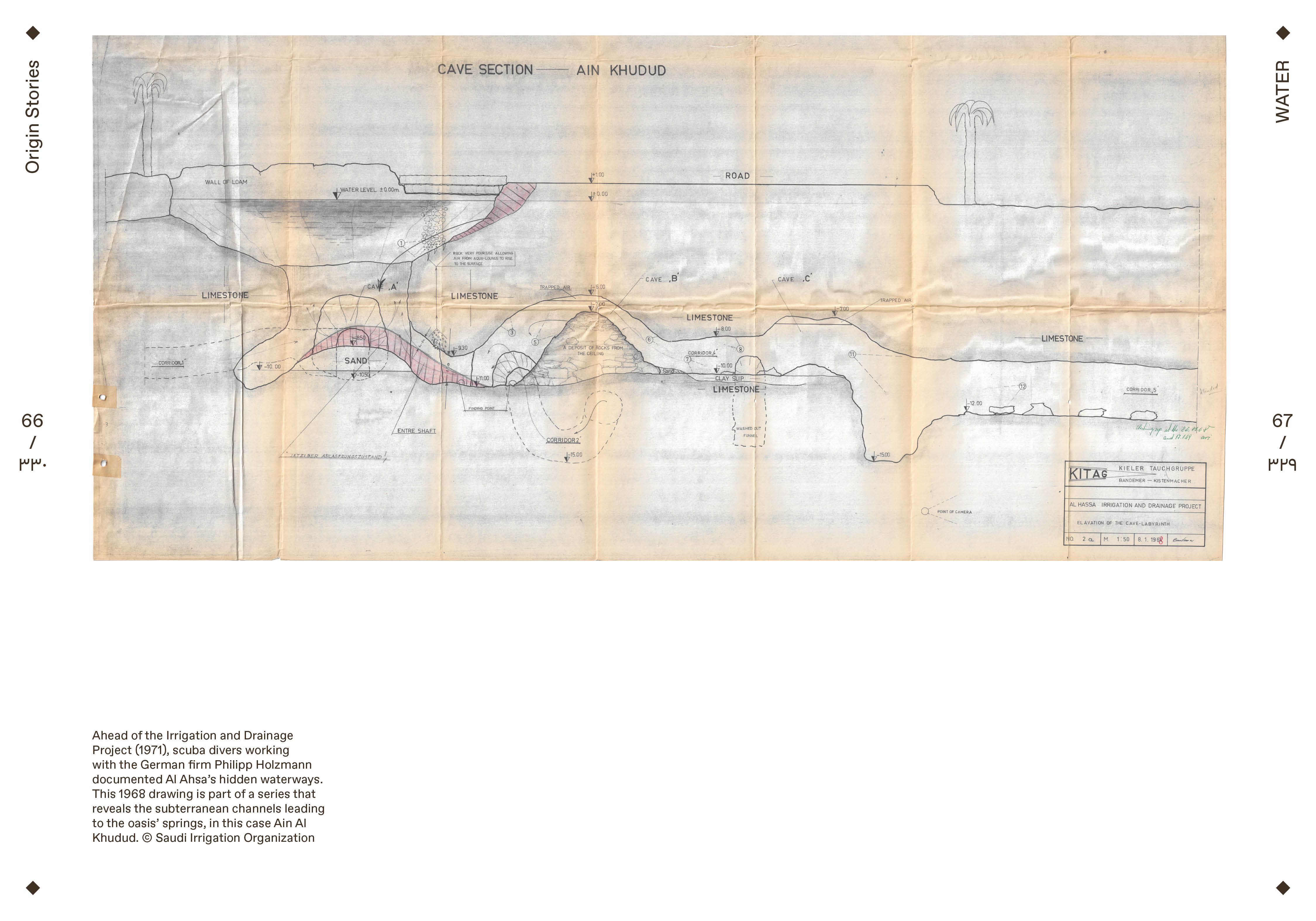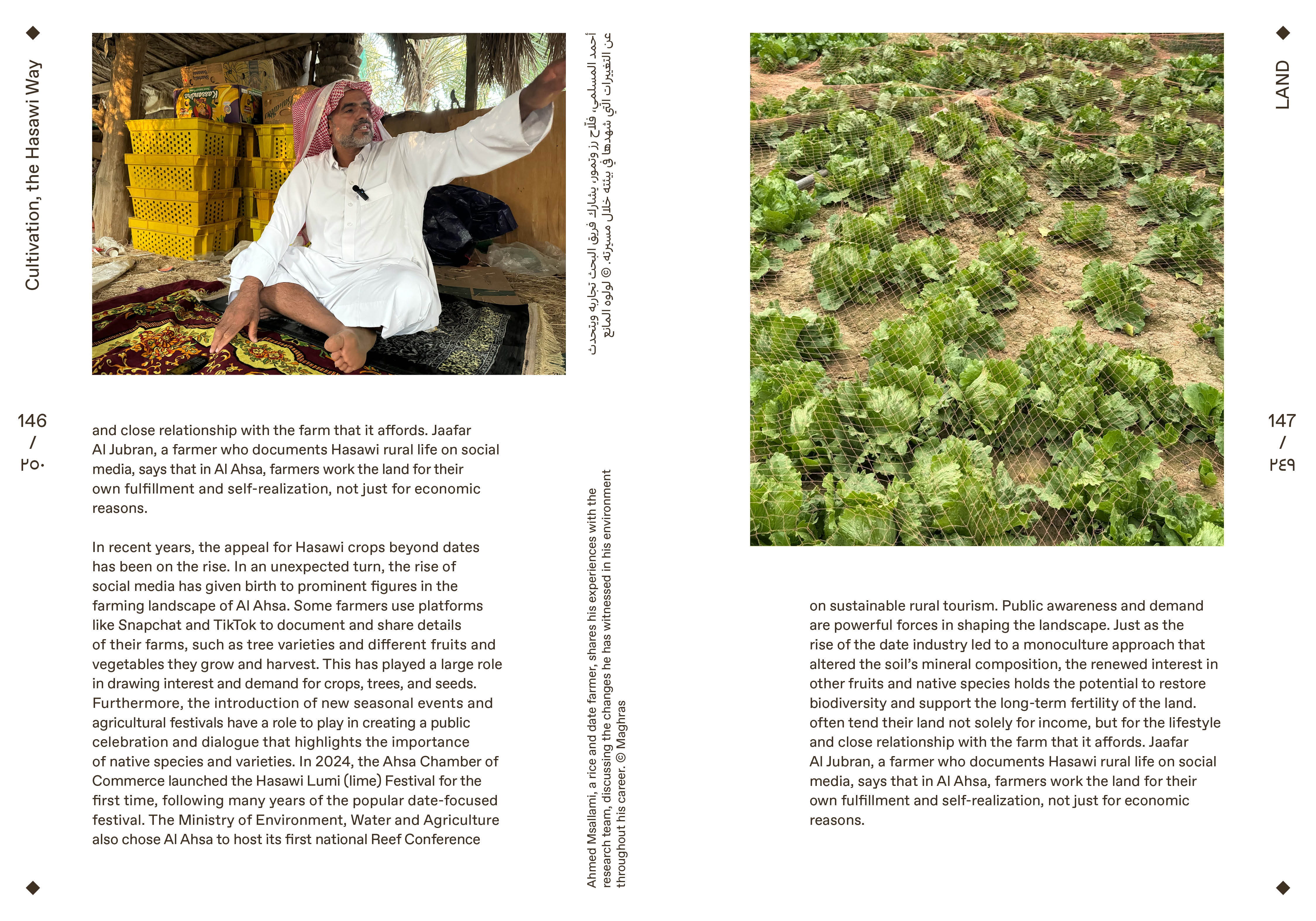 La publication documente les recherches, les travaux sur le terrain et les nouveaux projets commandés par des architectes, des artistes et des praticiens qui ont collaboré avec des agriculteurs, des artisans et des habitants d'Al Ahsa. À travers des essais, des images, des récits oraux et des archives, elle développe une réflexion sur l'évolution des relations entre la terre, l'eau et la communauté dans un paysage transformé par la modernisation et l'expansion urbaine.