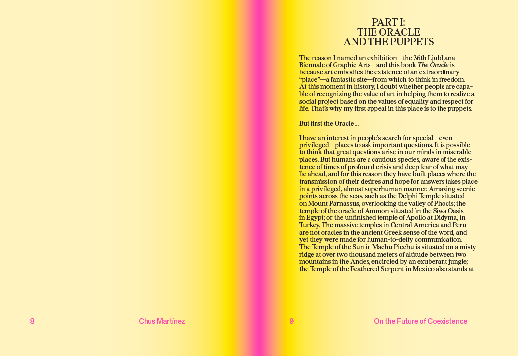 The Oracle names and honors the symbolic place from where all beings wonder about the course of life. Because we care about tomorrow, we should assume we care about staying alive, about a world in peaceful coexistence. Times of increasing insecurity and the experience of living in a world that refuses to acknowledge our needs give rise to various forms of escapism and misguided decision-making. Searching for big answers and expecting significant movements capable of undoing the damage of wars and dark forces seems unrealistic. Art assumes the existence of a tiny but meaningful spot from which to dream and demand freedom and peace. The Oracle is about this spot.