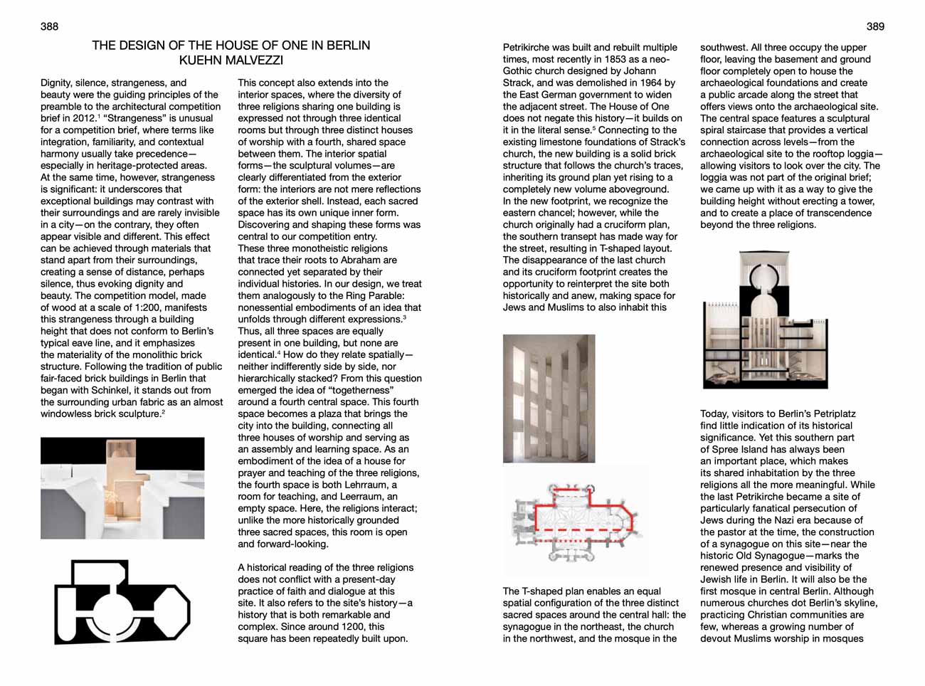 La House of One est une proposition audacieuse émanant de trois communautés locales visant à construire un lieu de prière et d'enseignement pour les juifs, les chrétiens et les musulmans dans le centre de Berlin. Le projet, qui est le résultat d'un concours international remporté par les architectes Kuehn Malvezzi en 2012, doit être construit sur les fondations existantes de l'église Saint-Petri, le premier site documenté dans l'histoire de Berlin. Le concept de la House of One repose sur le dialogue et la compréhension des autres confessions. En plus d'être un lieu de culte, il a vocation à être un centre éducatif ouvert à tous. La succession des espaces suit le principe de la multiplicité dans l'unité et de l'hétérogénéité dans un seul bâtiment. Bien que leurs rituels soient différents, le fait de se réunir autour d'une salle centrale dans un seul bâtiment aspire à l'universel.