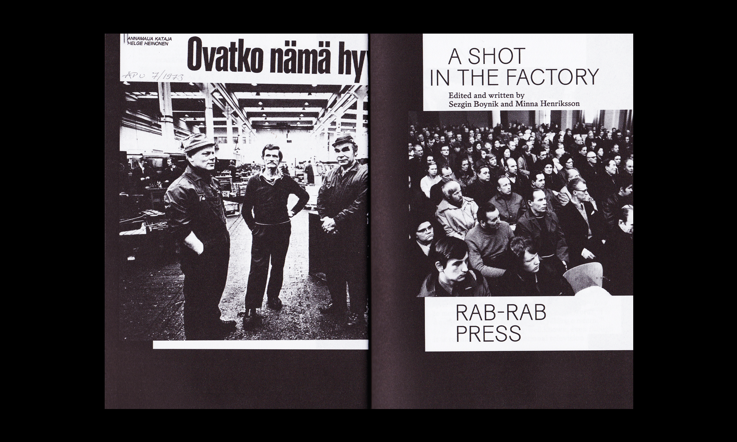 Edited and written by Sezgin Boynik and Minna Henriksson, the book conceives A Shot in the Factory as a work representing the 'factory as subjectivity'—that is, it considers working-class struggles not only as the product of objective economic relations, but also as a subjectivity transforming and democratising reactionary capitalist culture. By juxtaposing discussions on the film with Mikkola's early writings and poems, and a poem of Maria Fusco, the book reveals some unexpected patterns that contribute to our understanding of working class history and forms of labour organising outside the frames of legal unions and political parties.