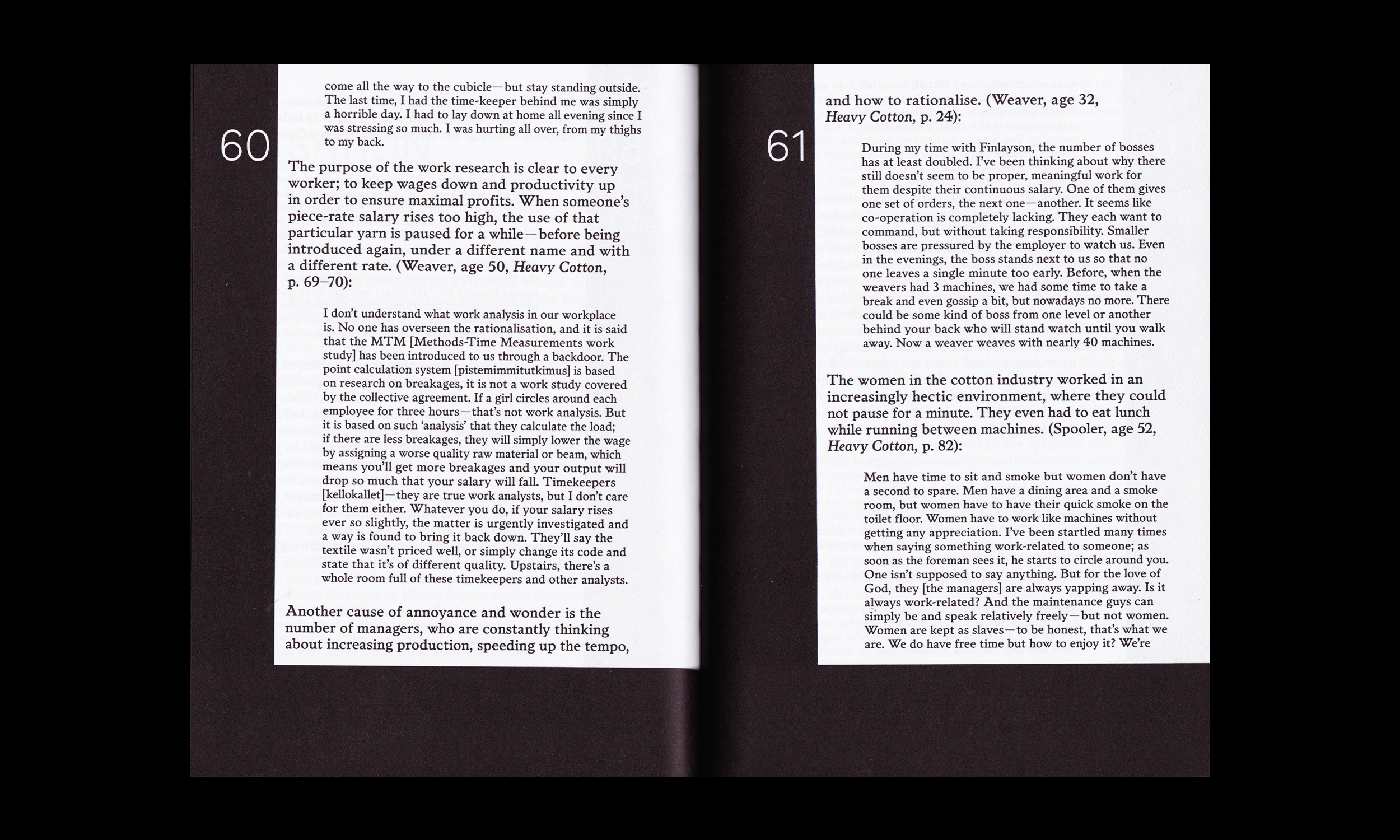 The book discusses the film in the context of Finnish post-war politics, and analyses its formal innovations within the tradition of experimental usage of documentary material. Expanding the scope of the labour struggles represented in the film, the book discusses the seminal 1971 reportage book by Marja-Leena Mikkola on women industrial workers and situates her work within the broader context of Finnish labour history.