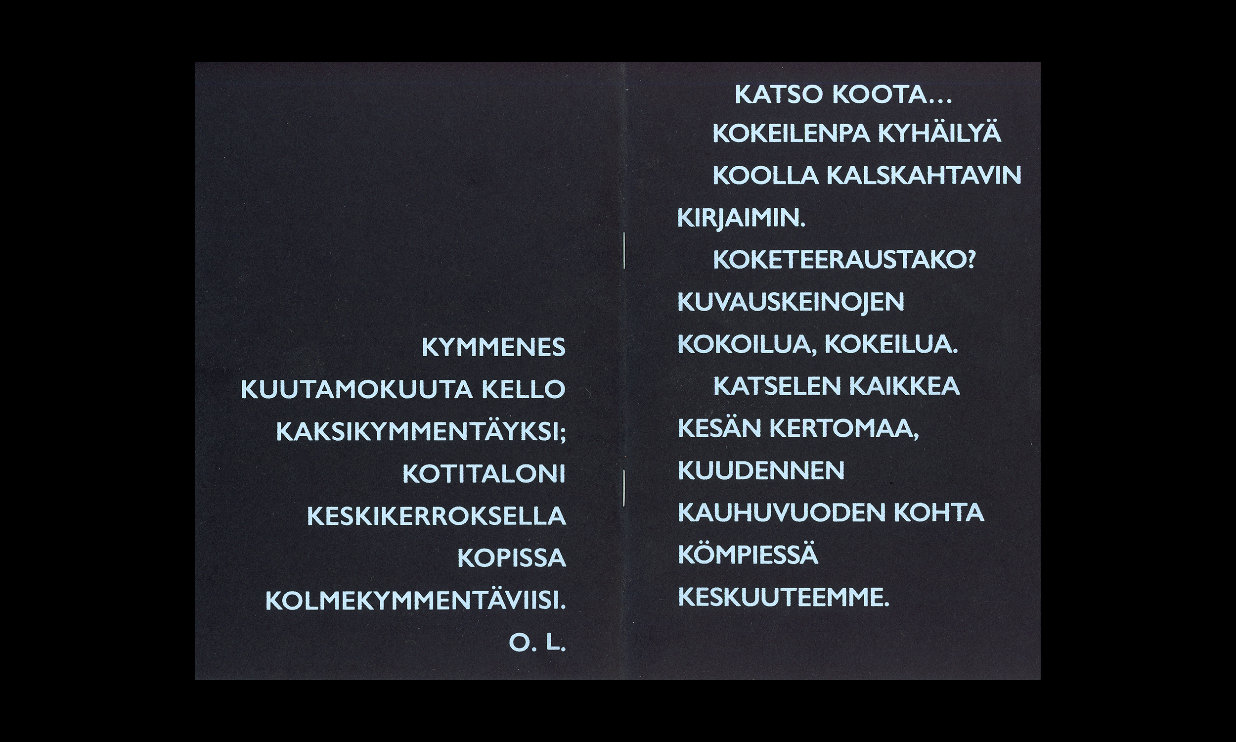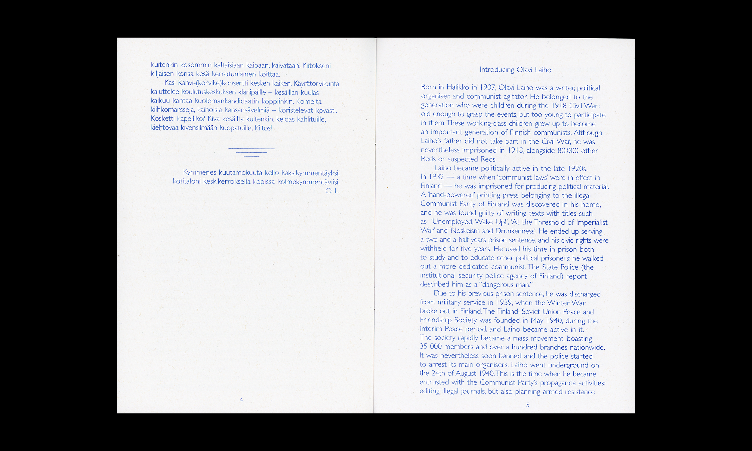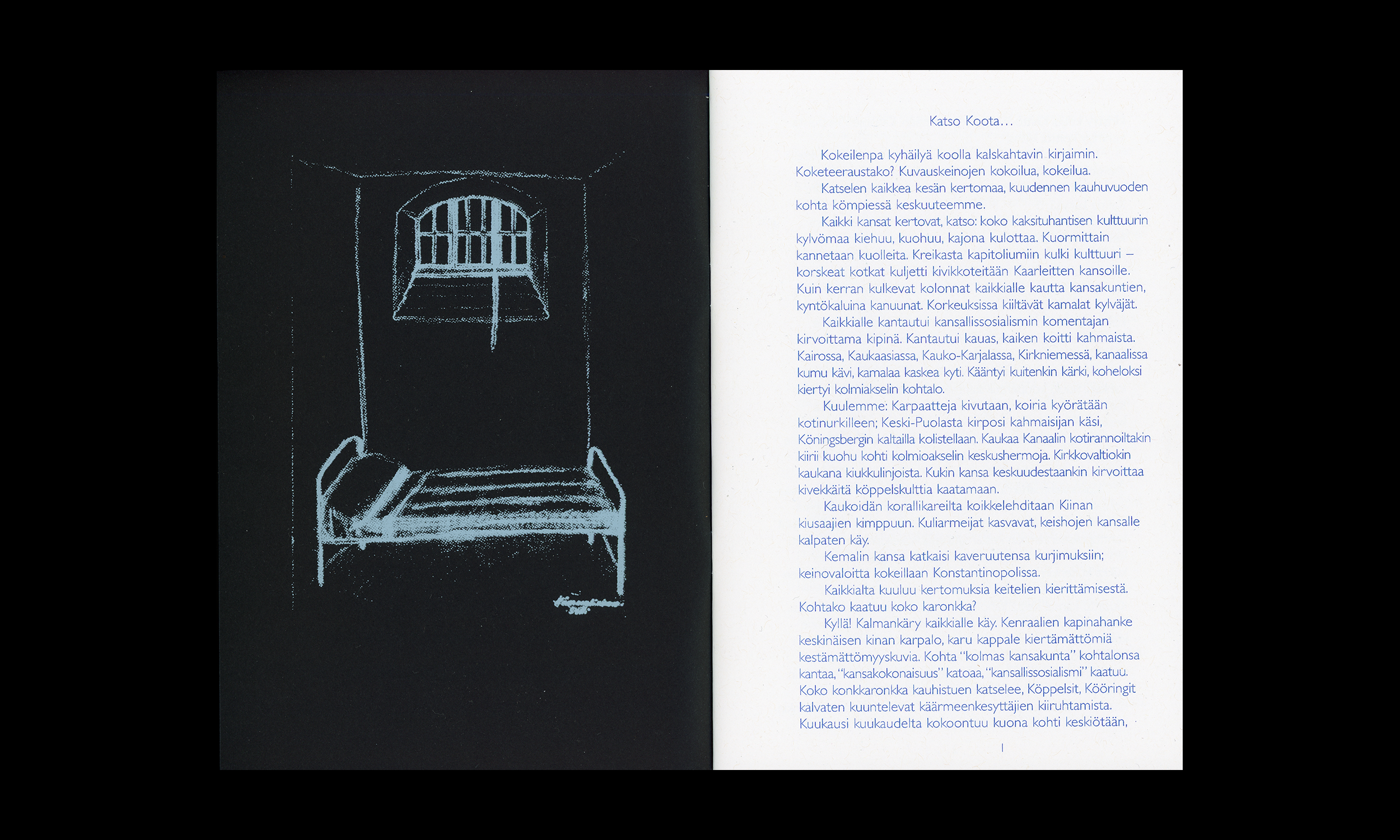 Conçu par Otso Peräsaari, le livre, publié dans le cadre de l'exposition Counter-Libraries à la Bibliothèque du mouvement ouvrier, à Helsinki, est imprimé à 200 exemplaires et produit dans l'atelier de sérigraphie Kalastaman Seripaja et l'imprimerie risographique If By Magic.