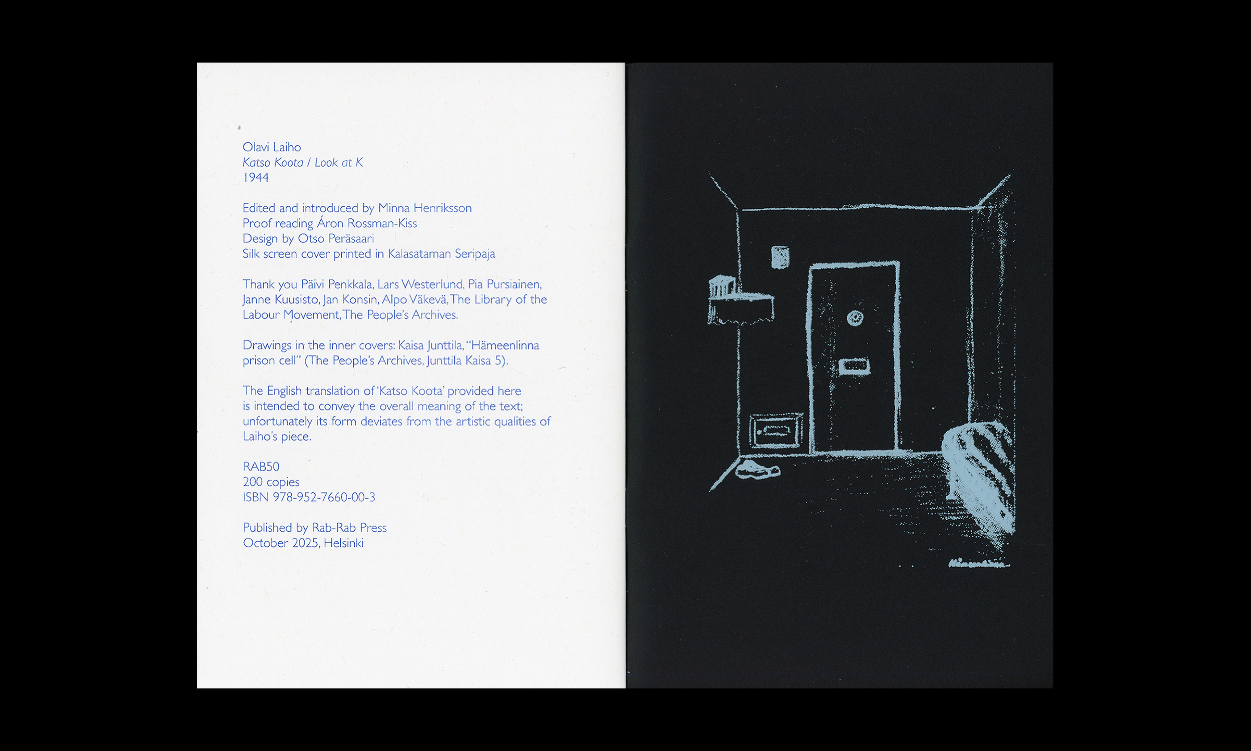 Quelques semaines seulement avant son exécution, Laiho a écrit un essai remarquable intitulé « Katso Koota » [Regarde K], en utilisant uniquement des mots commençant par la lettre K. Cet essai donne une image vivante de la situation politique de l'époque : la guerre est toujours en cours, mais il est devenu évident que la Finlande est du côté des perdants. Ignorant la date de son exécution, Laiho attend avec impatience l'arrivée d'un nouveau lot de livres à la bibliothèque de la prison, appréciant son ersatz de café et le son d'une musique lointaine...
