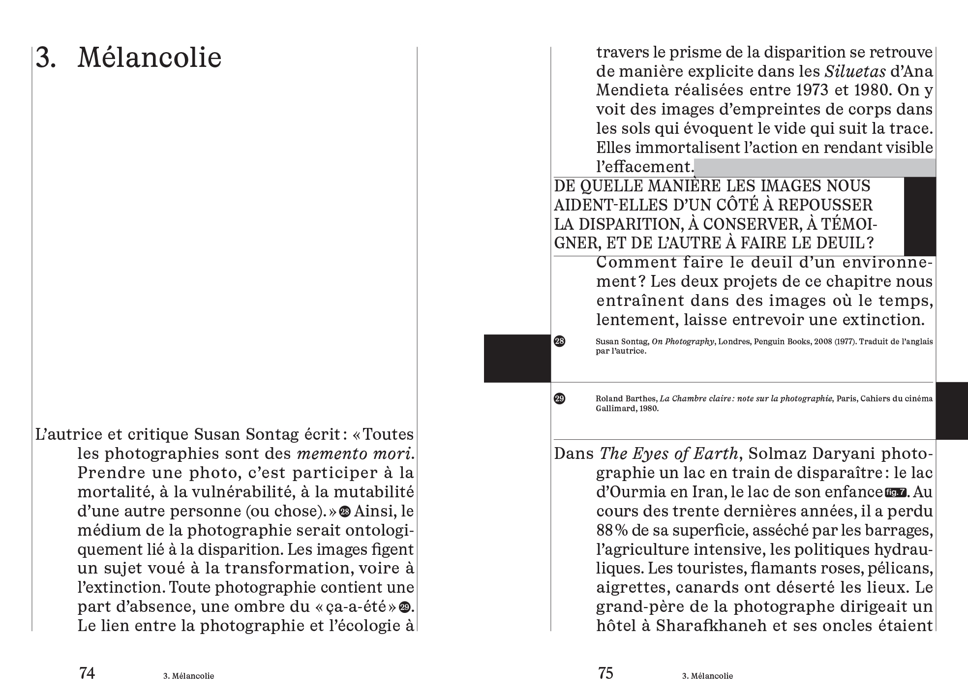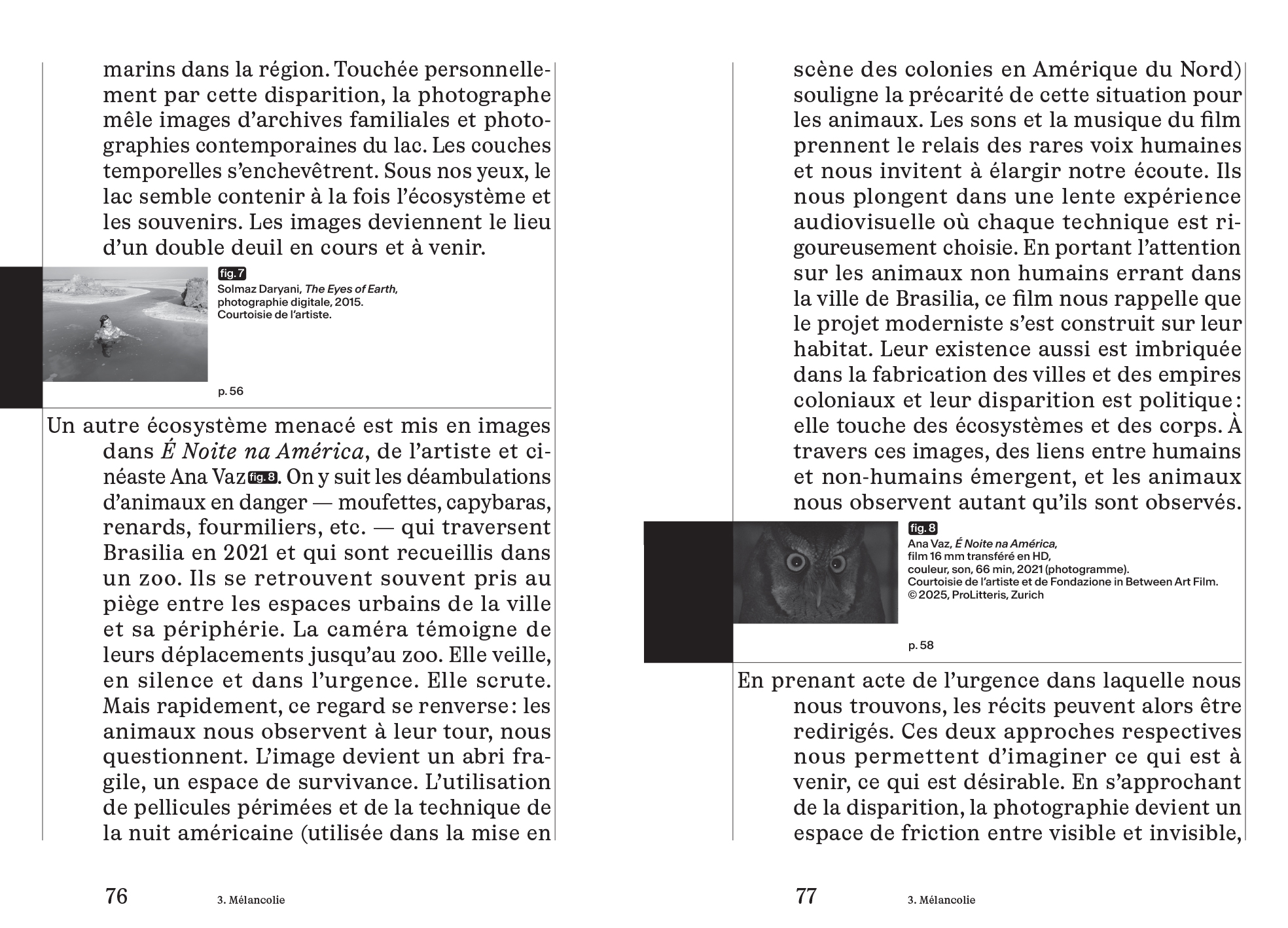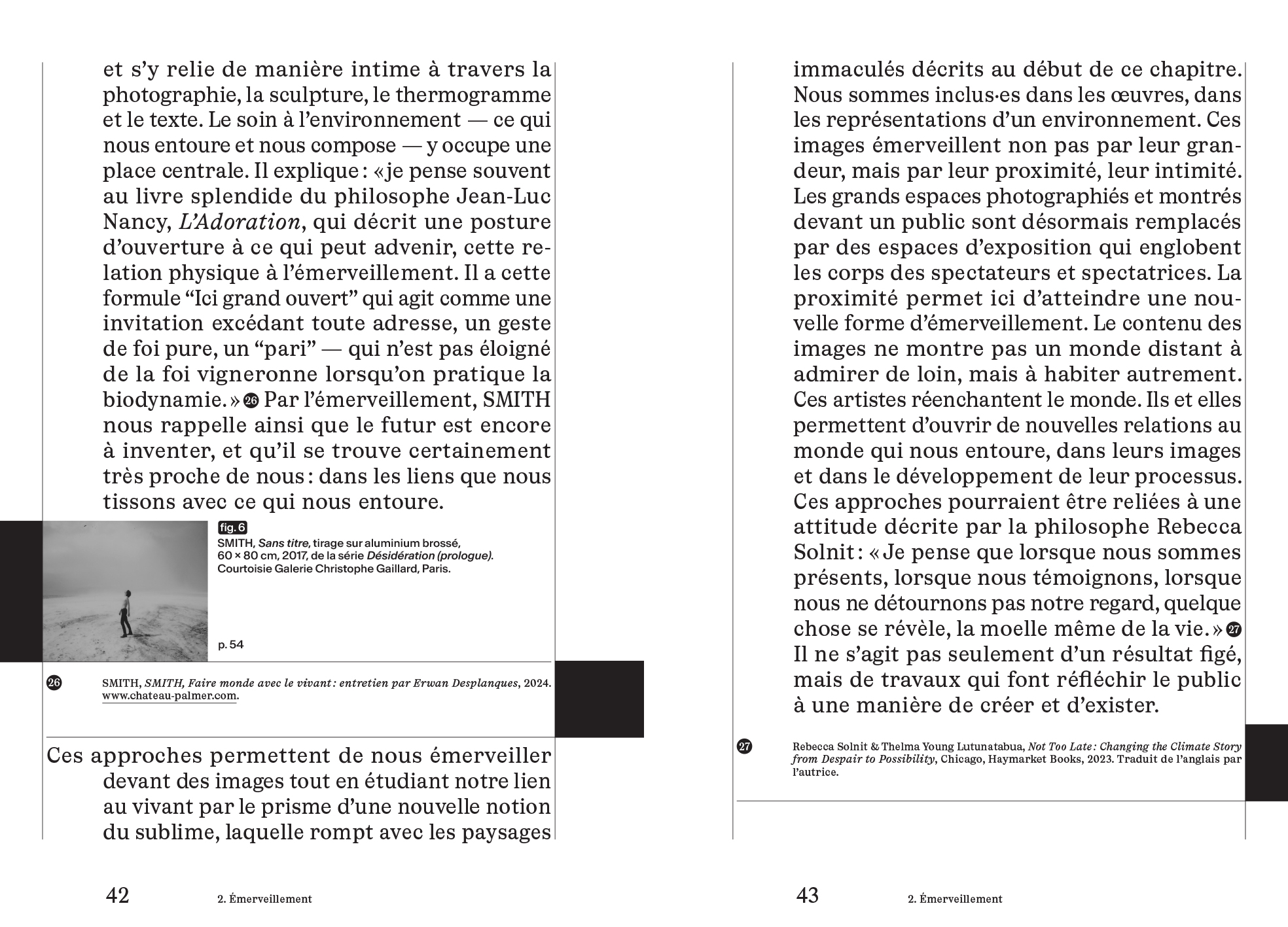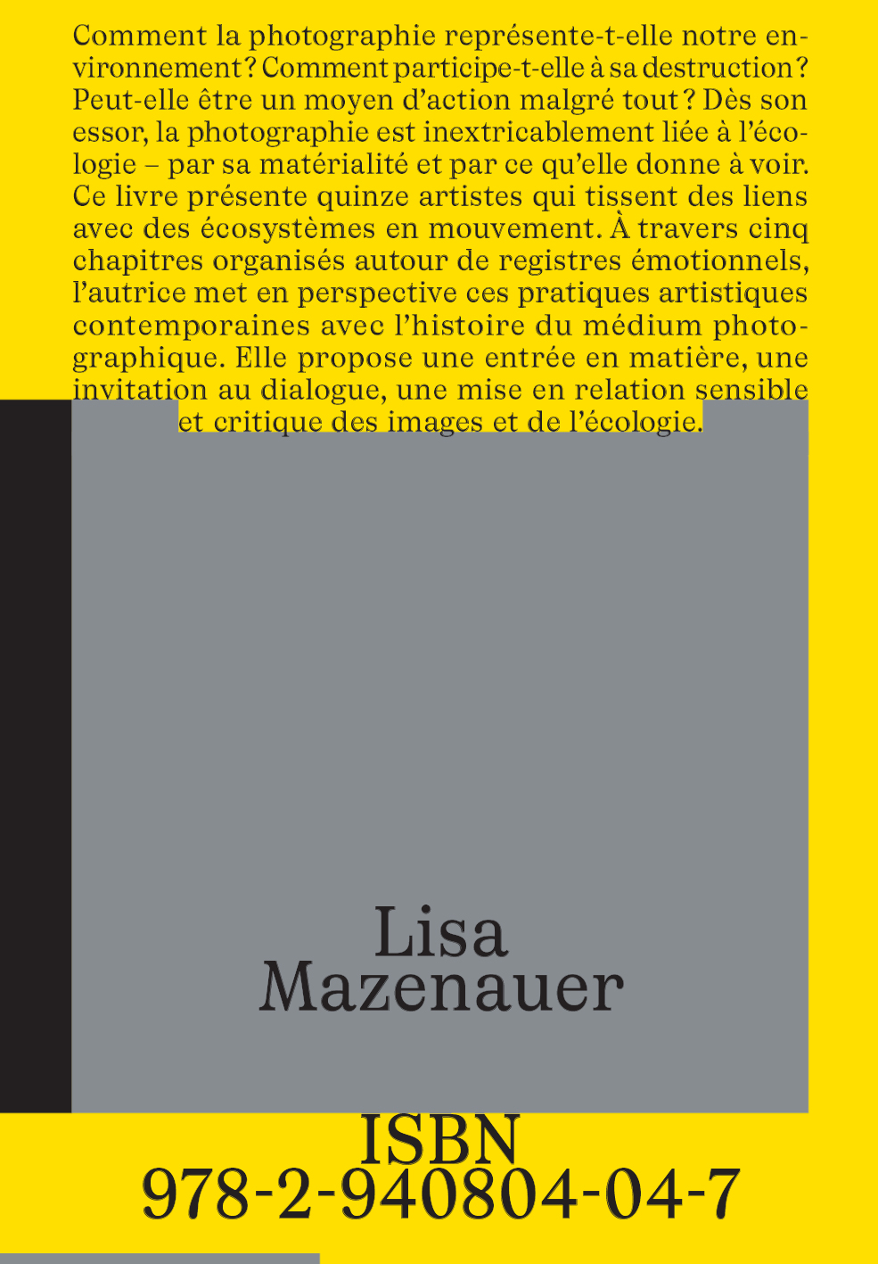 Dès son essor, la photographie est inextricablement liée à l'écologie – par sa matérialité et par ce qu'elle donne à voir. Ce livre présente quinze artistes qui tissent des liens avec des écosystèmes en mouvement. À travers cinq chapitres organisés autour de registres émotionnels, l'autrice met en perspective ces pratiques artistiques contemporaines avec l'histoire du médium photographique. Elle propose une entrée en matière, une invitation au dialogue, une mise en relation sensible et critique des images et de l'écologie.