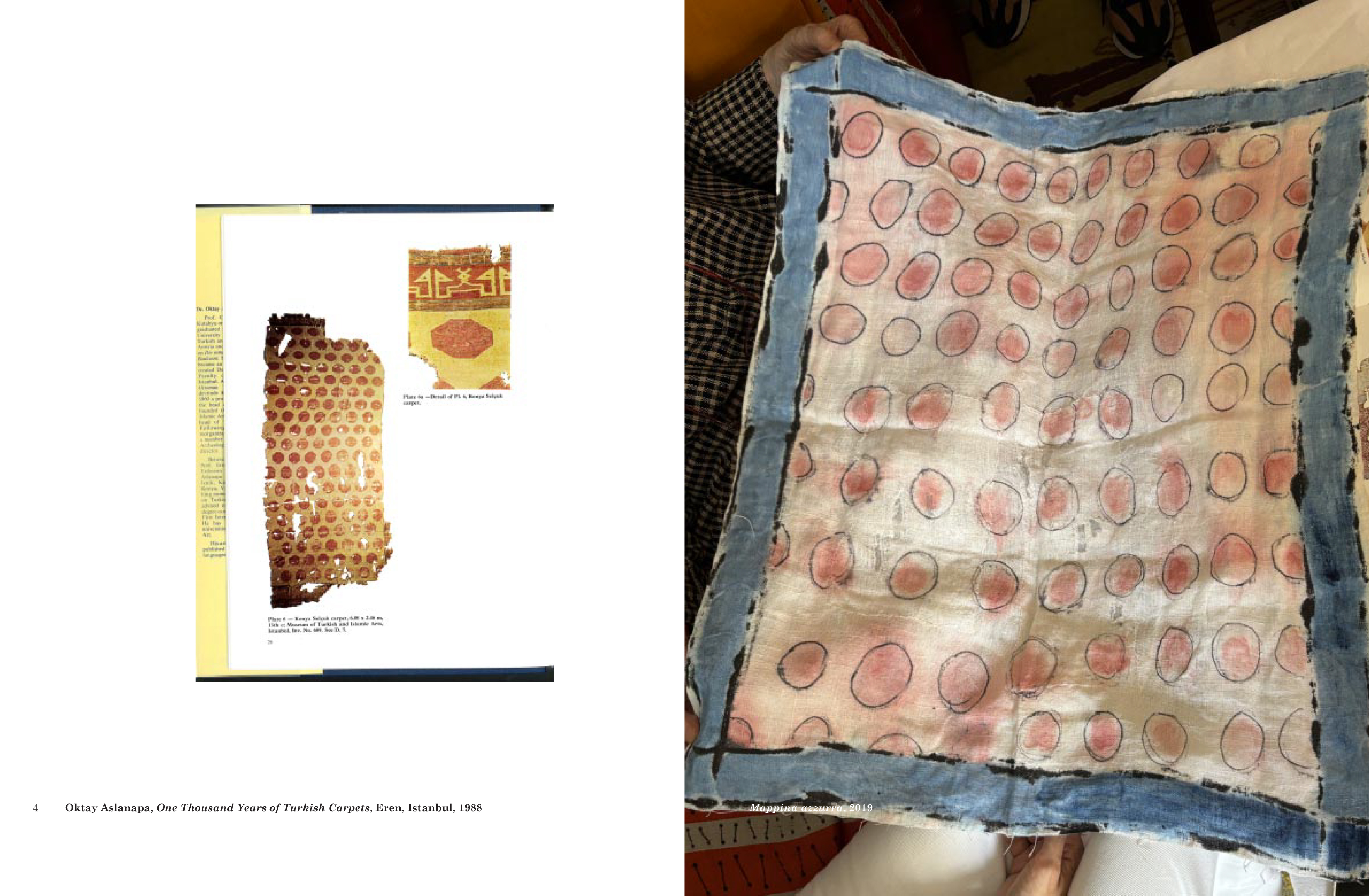 Comme sur de nombreux tapis noués à la main, dans ses dessins, le champ central uni accueille des motifs et des dessins. Ses bordures sont géométriques et marquées par une double ligne à l'encre foncée, parfois gris délavé, orange clair ou rose. Tout comme les rues ont des trottoirs, les tapis ont des bordures. Les pièces d'Isabella Ducrot partagent ces frontières distinctes. Sont-elles simplement un passage du sol au mur, du tapis à la tapisserie ? Ou délimitent-elles des fenêtres ouvertes sur le monde ? Peut-être un peu des deux. Le sol est pédestre et domestique, et les tapis déroulés offrent des parcelles de territoire et une utilité pour chacune d'elles. Les murs sont destinés à être regardés, ils sont décoratifs et constructeurs d'espace, leur robustesse et leur opacité sont paradoxalement synonymes d'ouverture et d'infini.